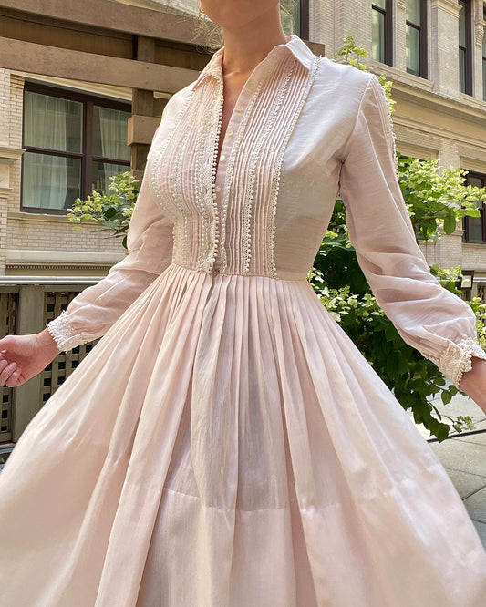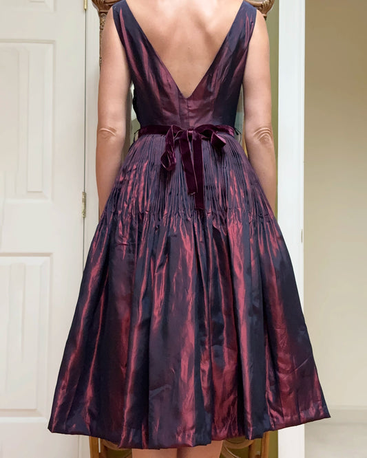 Vintage 1950s Pleat Release Taffeta Fit and Flare Dress with Ribbon Belt