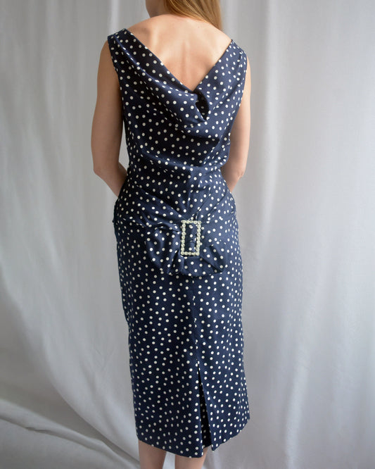Vintage 1950s Polka Dot Bow Back Wiggle Dress, Deadstock