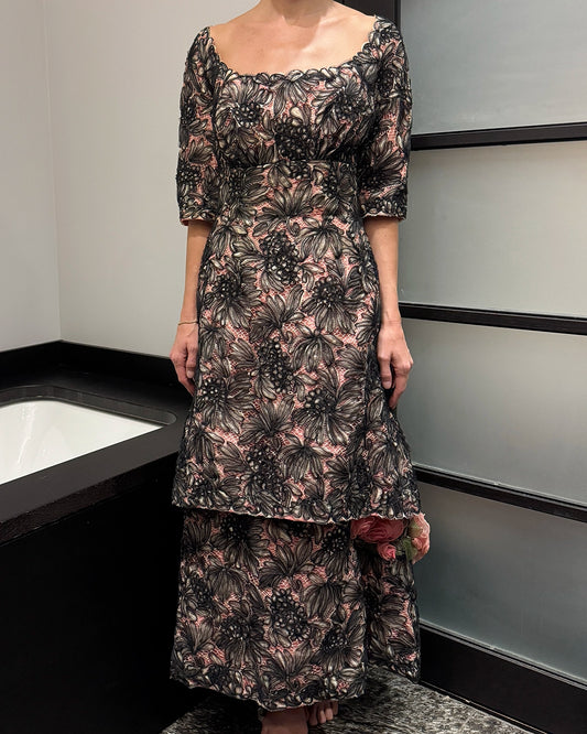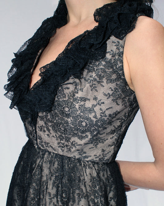 Vintage 1950s Tulle-Embroidered Lace Gown with Floral Appliqué