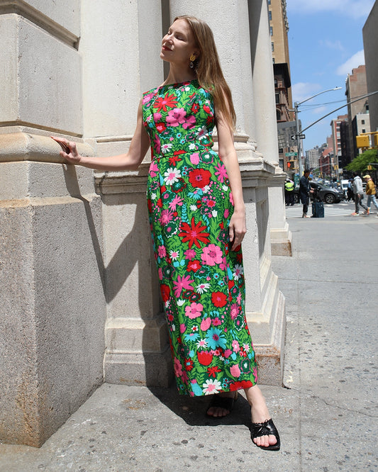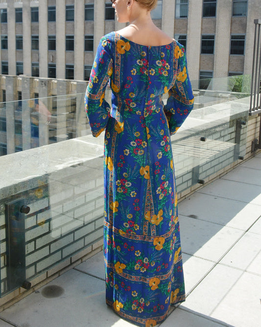 Vintage 1960s Folkloric Floral Print Silk Gown