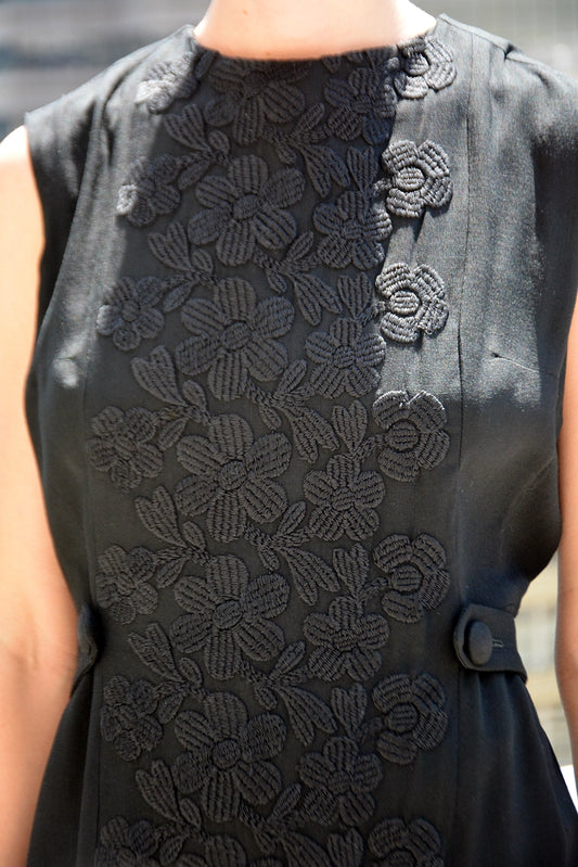 Vintage 1960s Floral Embroidered Black Sheath Dress