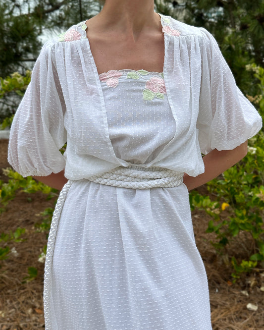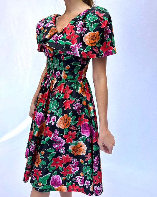 Vintage 1980s Floral Puff Sleeve Cape Neck Party Dress