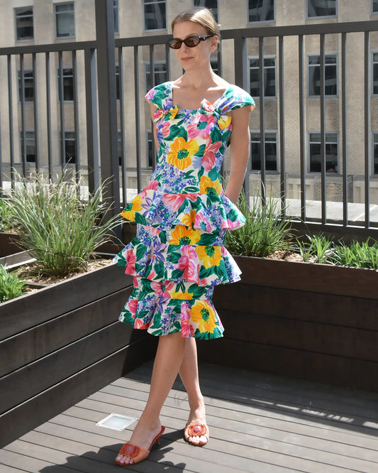 Vintage 1980s Floral Silk Drop-Waist Dress with Tiered Flounce Skirt