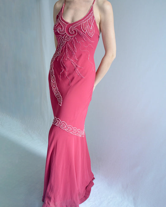 Vintage Bias-Cut Open-Back Beaded Mermaid Gown