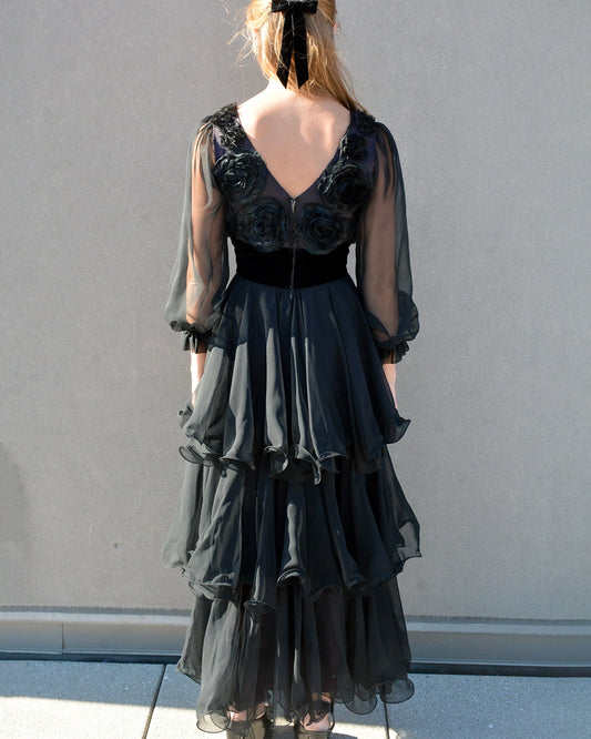 Vintage Black Tiered-Flounce Gown with Rosette Appliqué