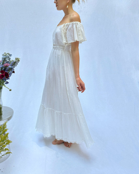 Vintage Ivory Gauze Off-The-Shoulder Dress