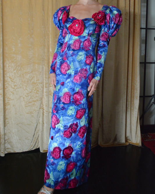 Vintage Puff Sleeve Flocked Floral Gown with Flower Appliqué