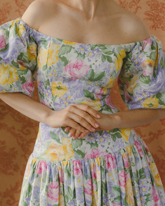 1980s Victor Costa Puff-Sleeve Pastel Floral Drop Waist Dress