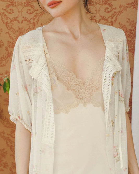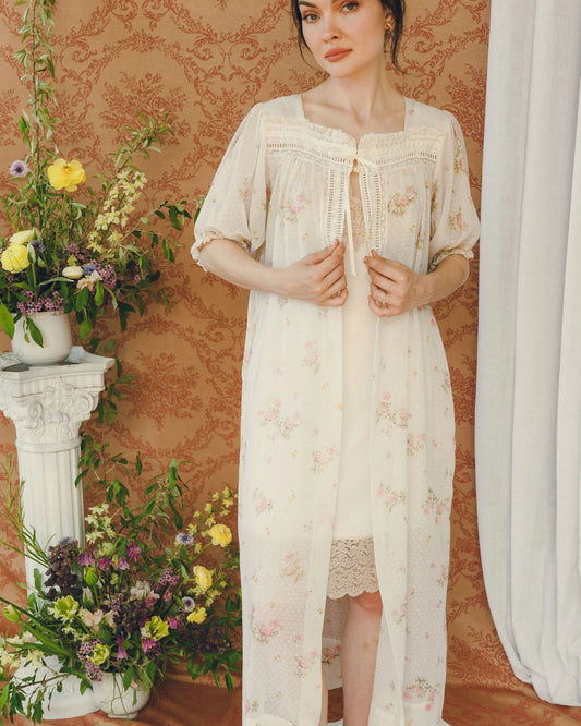 Vintage Christian Dior Floral Swiss Dot Peignoir With Lace Trim