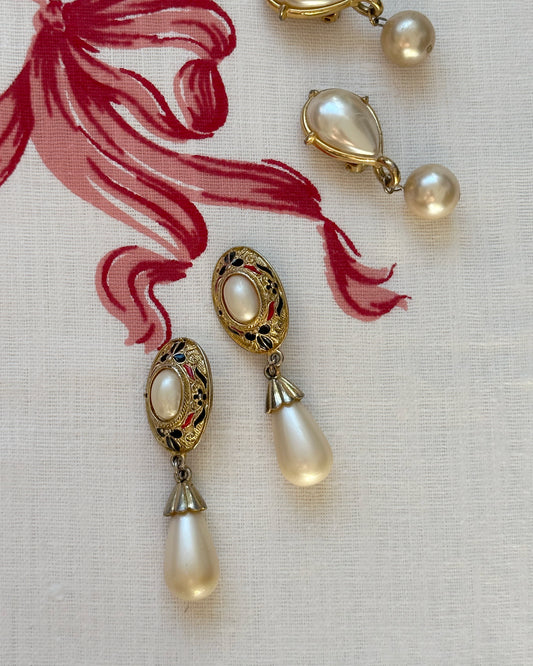 Vintage Enameled Gold Pearl Drop Standard Earrings