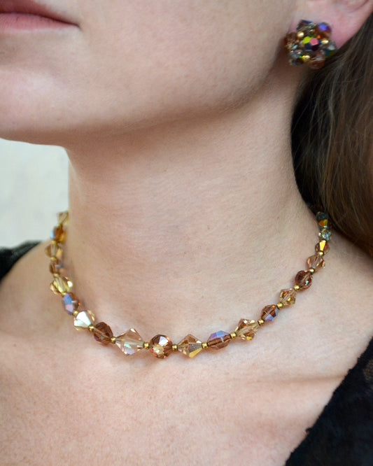 Vintage 1950s Aurora Borealis Topaz Bead Choker + Earrings Parure