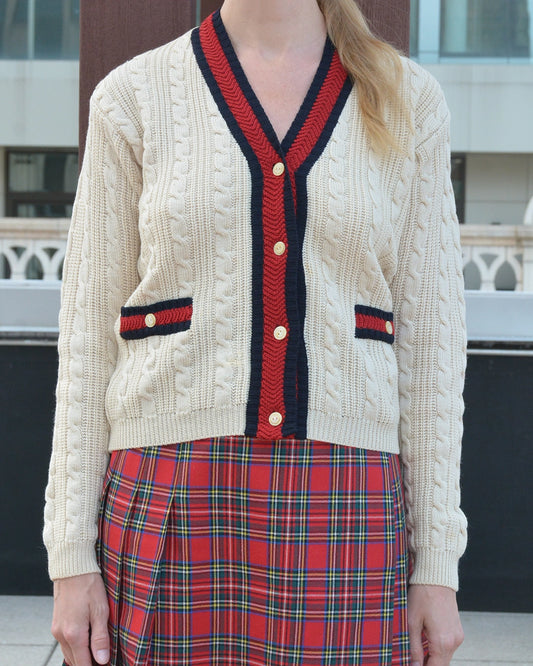 Vintage Cable Knit V-Neck Cardigan with Stripe Details