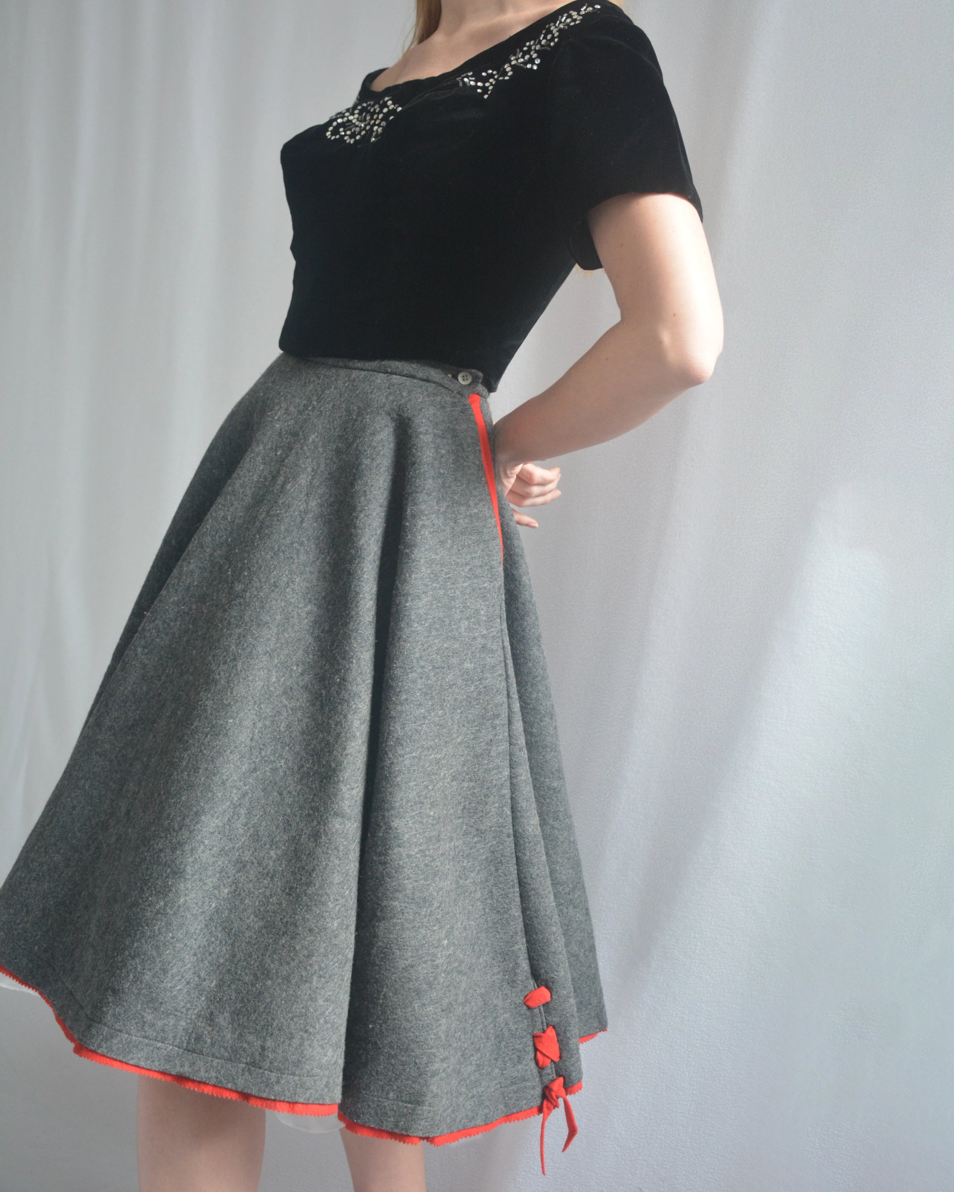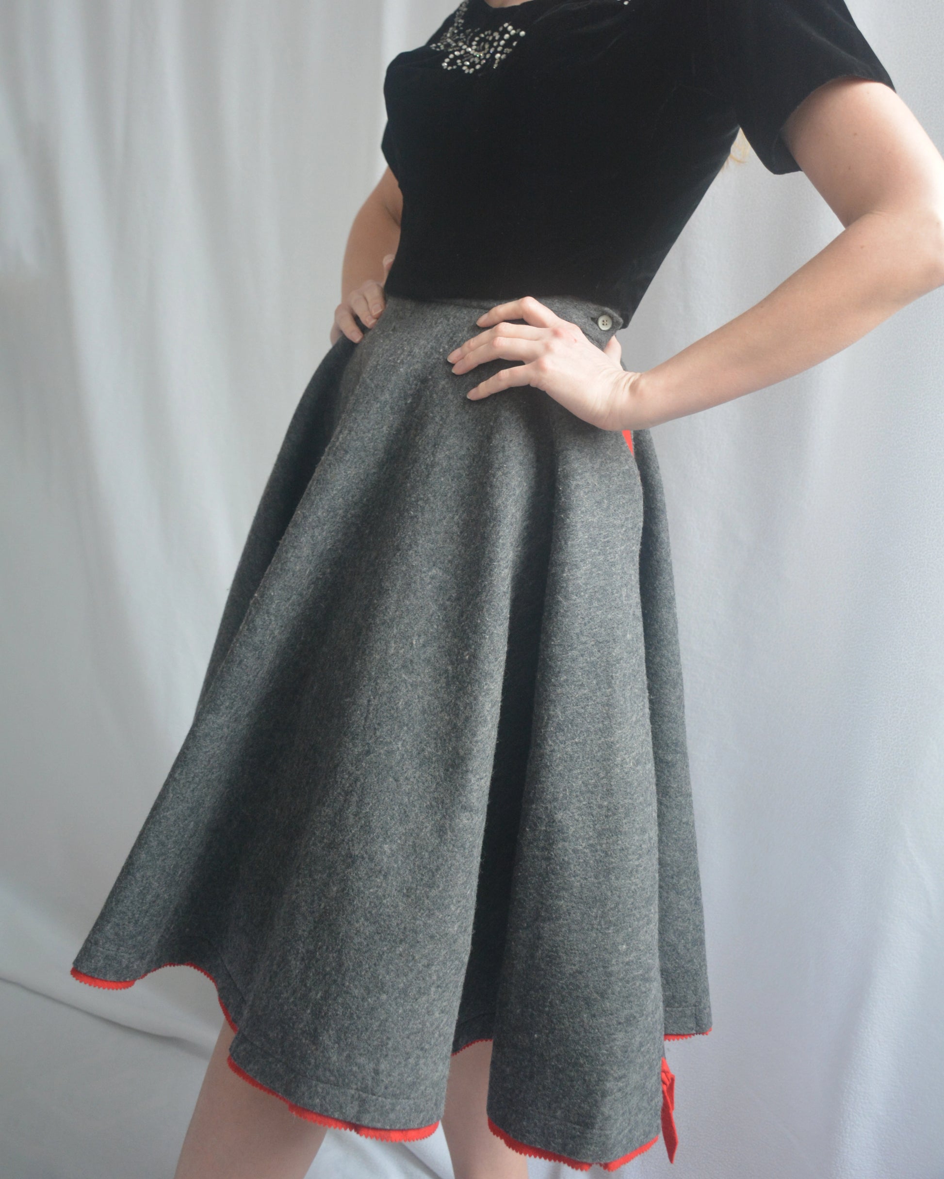 This classic 1950s circle skirt is crafted from a gorgeous quality wool felt. Its heather grey color is accented by peekaboo red trim, including lace-up details at the hem. It was made by Saks Fifth Avenue "The Young Circle" label. It has pockets on either side! It is shown both with and without a crinoline petticoat— you could even wear an even fuller one for that exaggerated 1950s look, but it also looks perfect worn solo. It closes with a zipper and button at side waist. No fiber contents are listed but it feels like 100% wool.