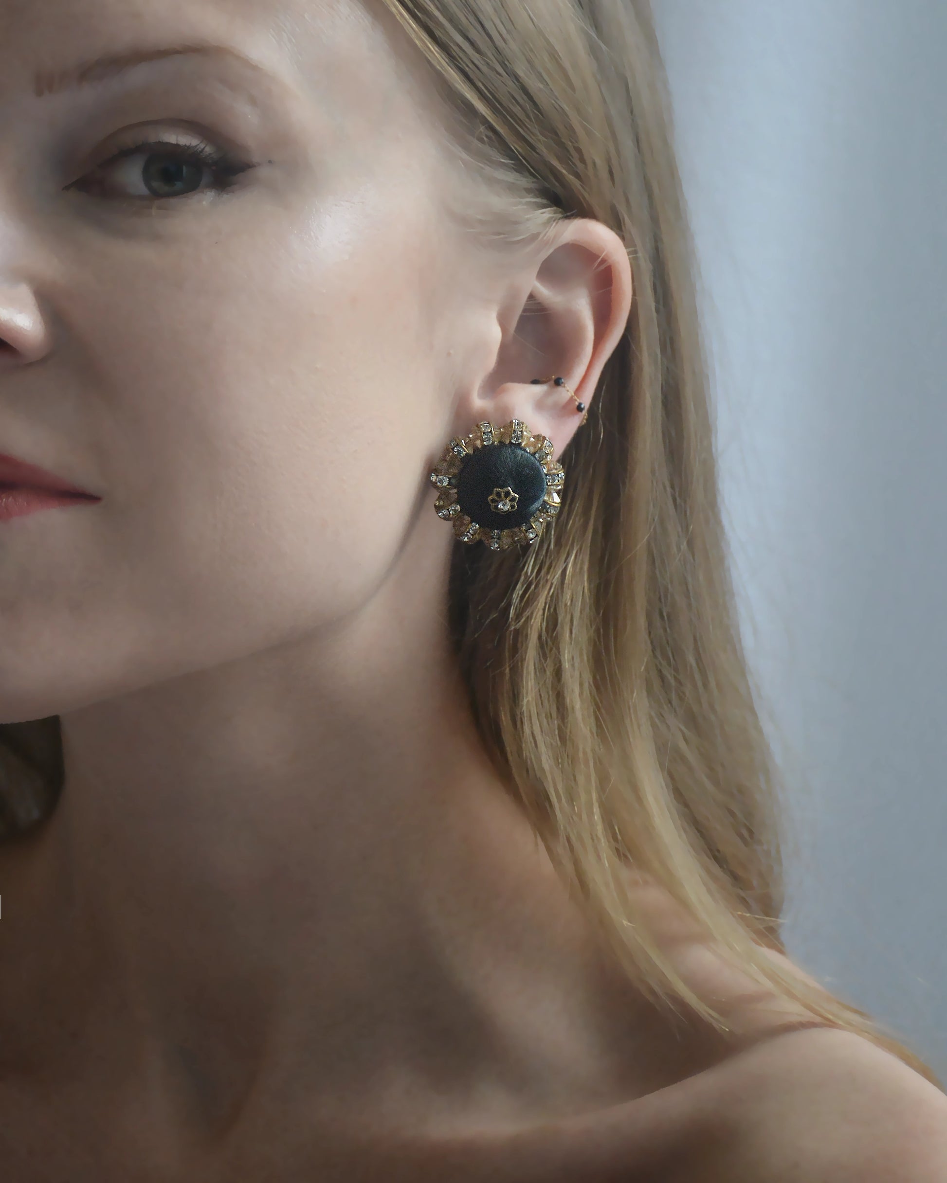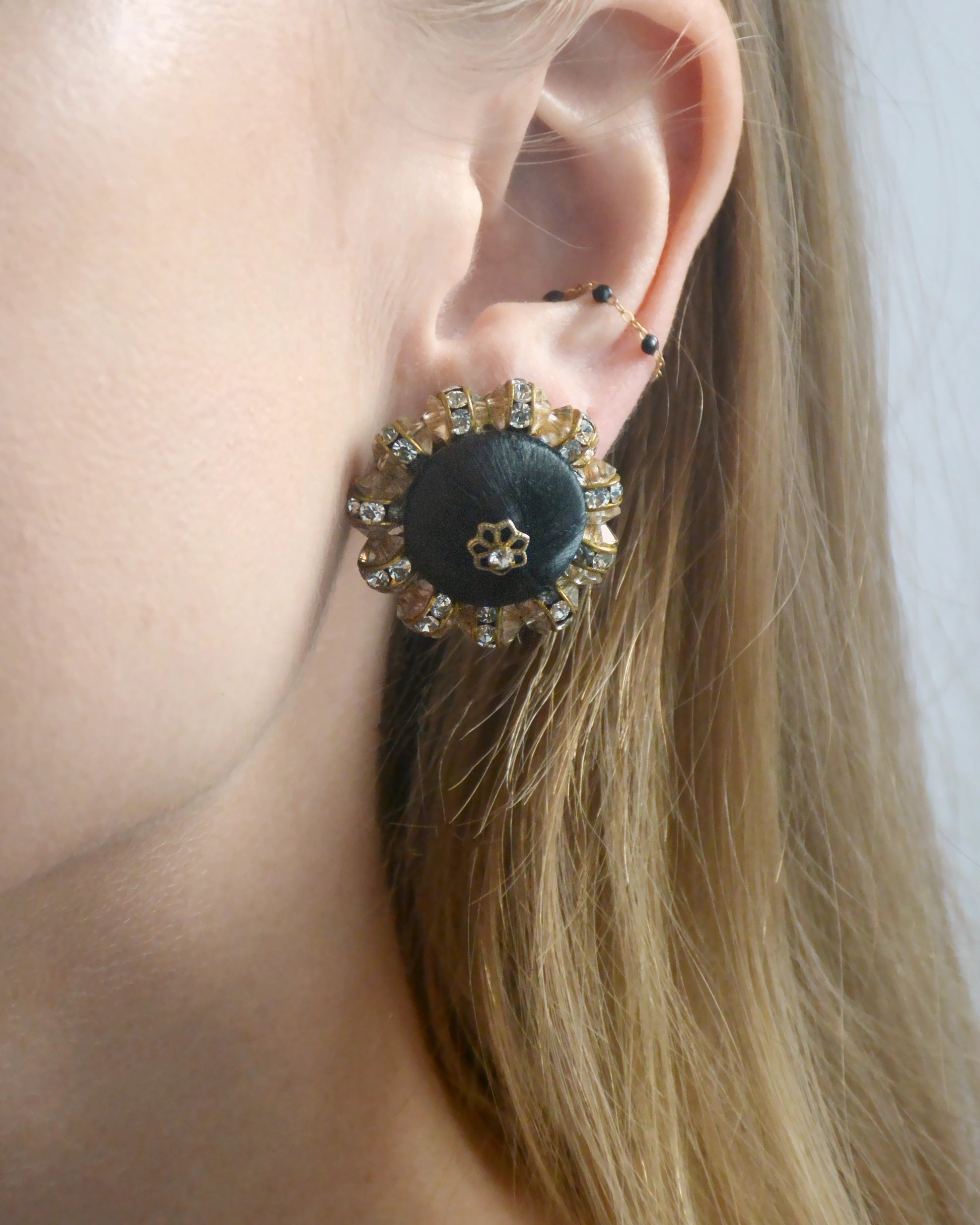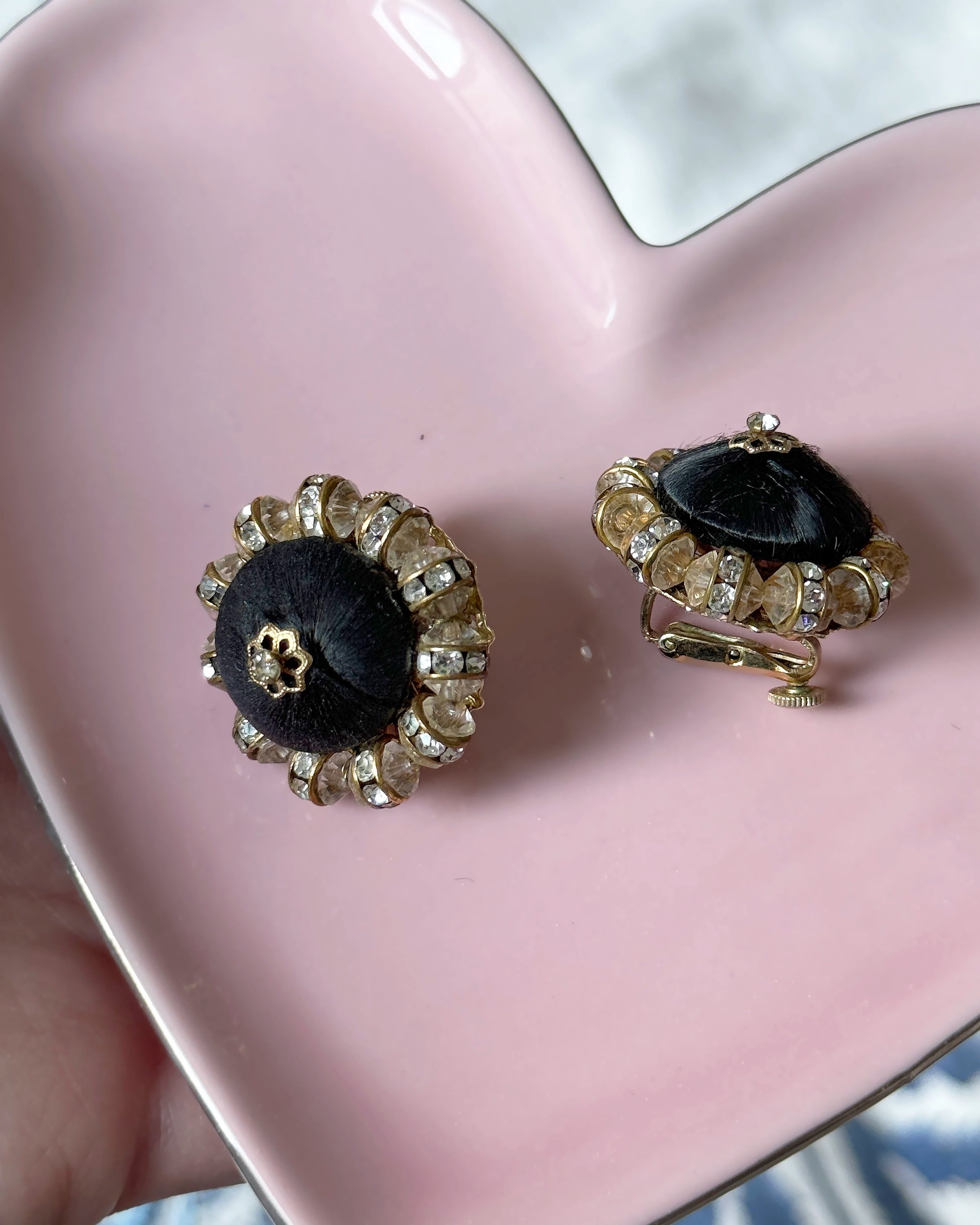 Made by Vendome in the 1950s/early 1960s, these vintage earrings are incredibly unique and unusual. Vendome is well known for the costume jewelry of incredible quality, from the 1940s through the 1960s. Vendome started as a subsidiary of the famed Coro jewelry brand, and their pieces are highly collectible. These earrings feature a cushion-shaped center, formed by threads of black silk, punctuated with a finial in the center. The crystal halo is also eye-catchingly distinct, featuring larger beads banded with tiny crystals. The combination of light-reflecting stones and glass, contrasted by the black, creates a gorgeous sparkle. They are signed "Vendome" and close with aa clip-on lever back— vintage clip-ons are so much more comfortable and secure to wear compared to their modern counterparts, largely due to the quality and thought that went into their hand-made construction. Measures about 3 cm diameter.