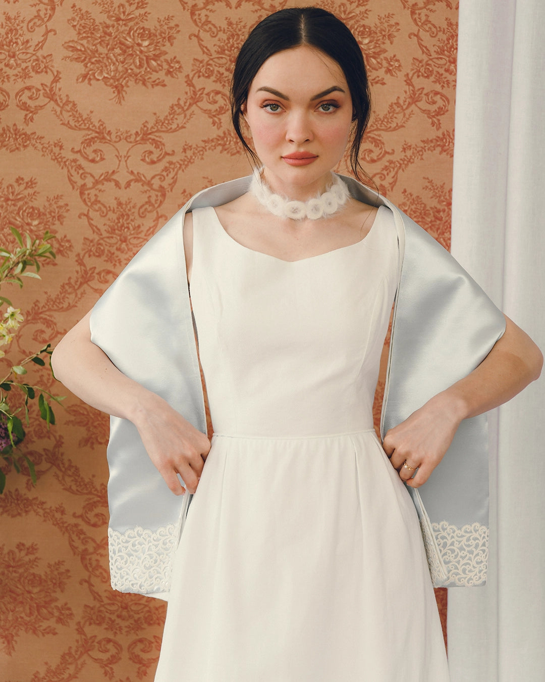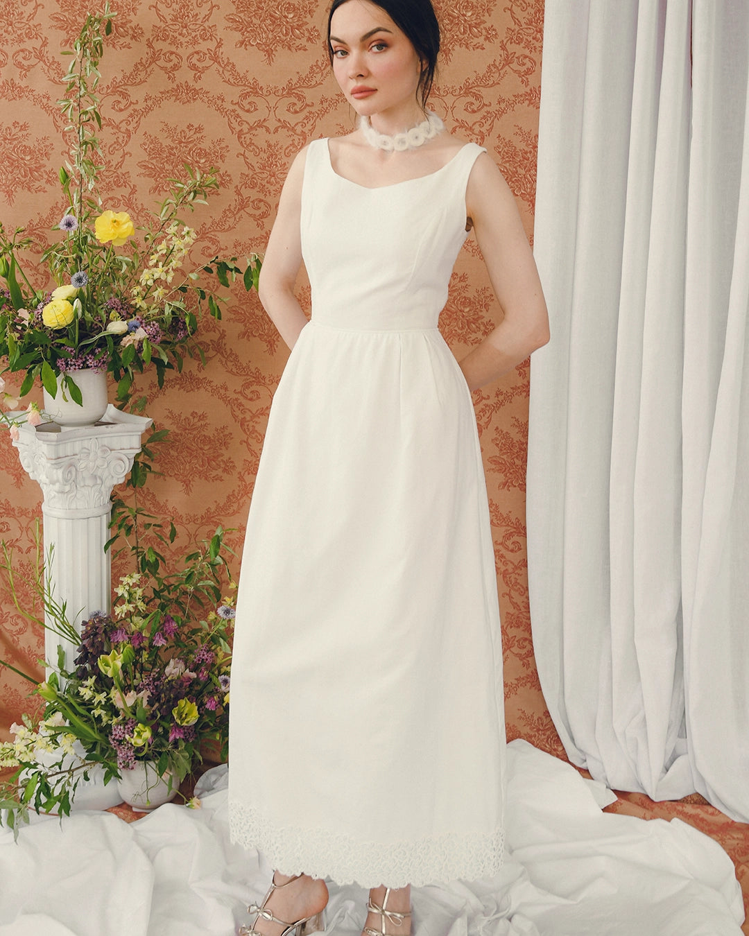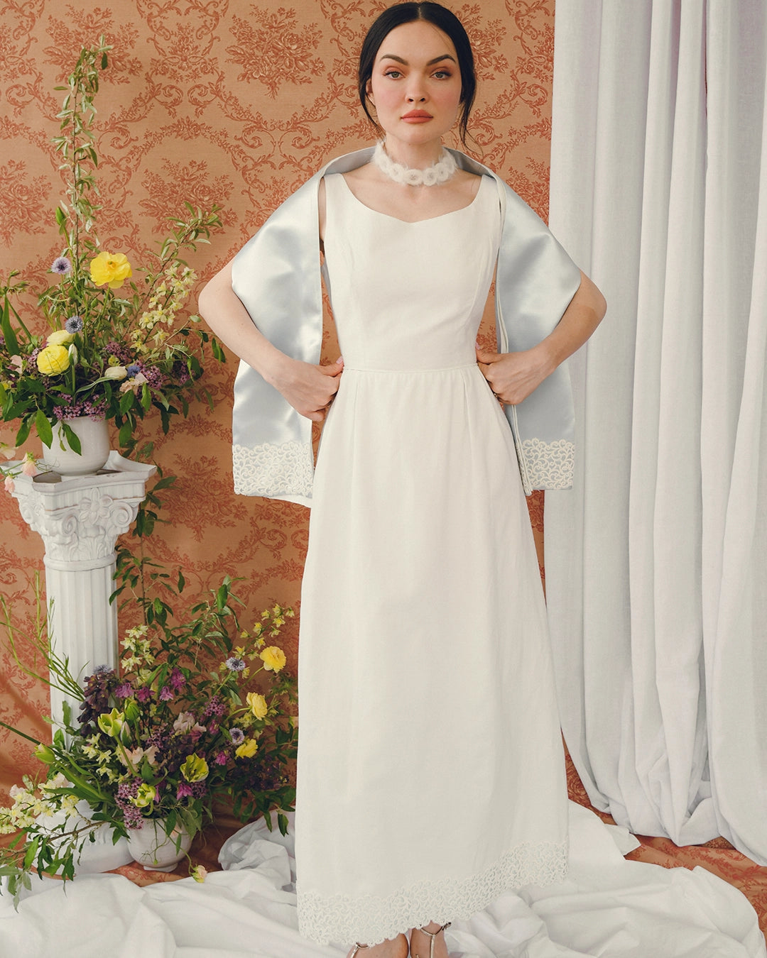 This chic vintage ivory column dress is classic 1960s and would make such a great option for a bridal look— Something Old! And the matching shawl adds a Something Blue as well. The fabric is a textured pique cotton-blend, which loans a somewhat relaxed feeling, offsetting the formality of the crochet lace appliqué at the hem, which is mirrored on the shawl.