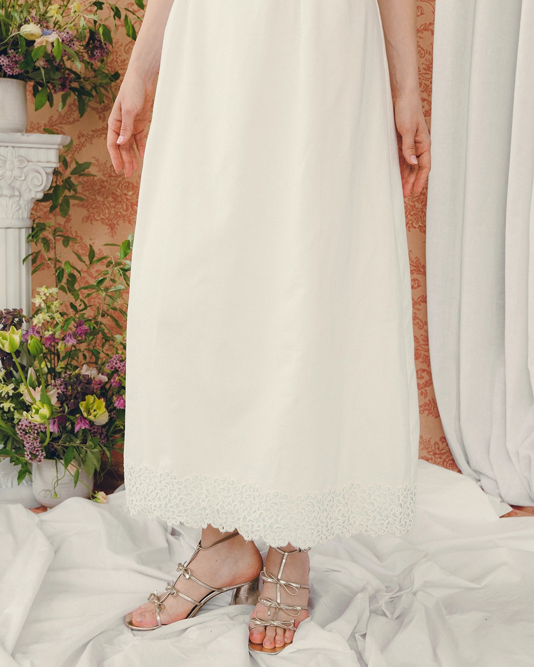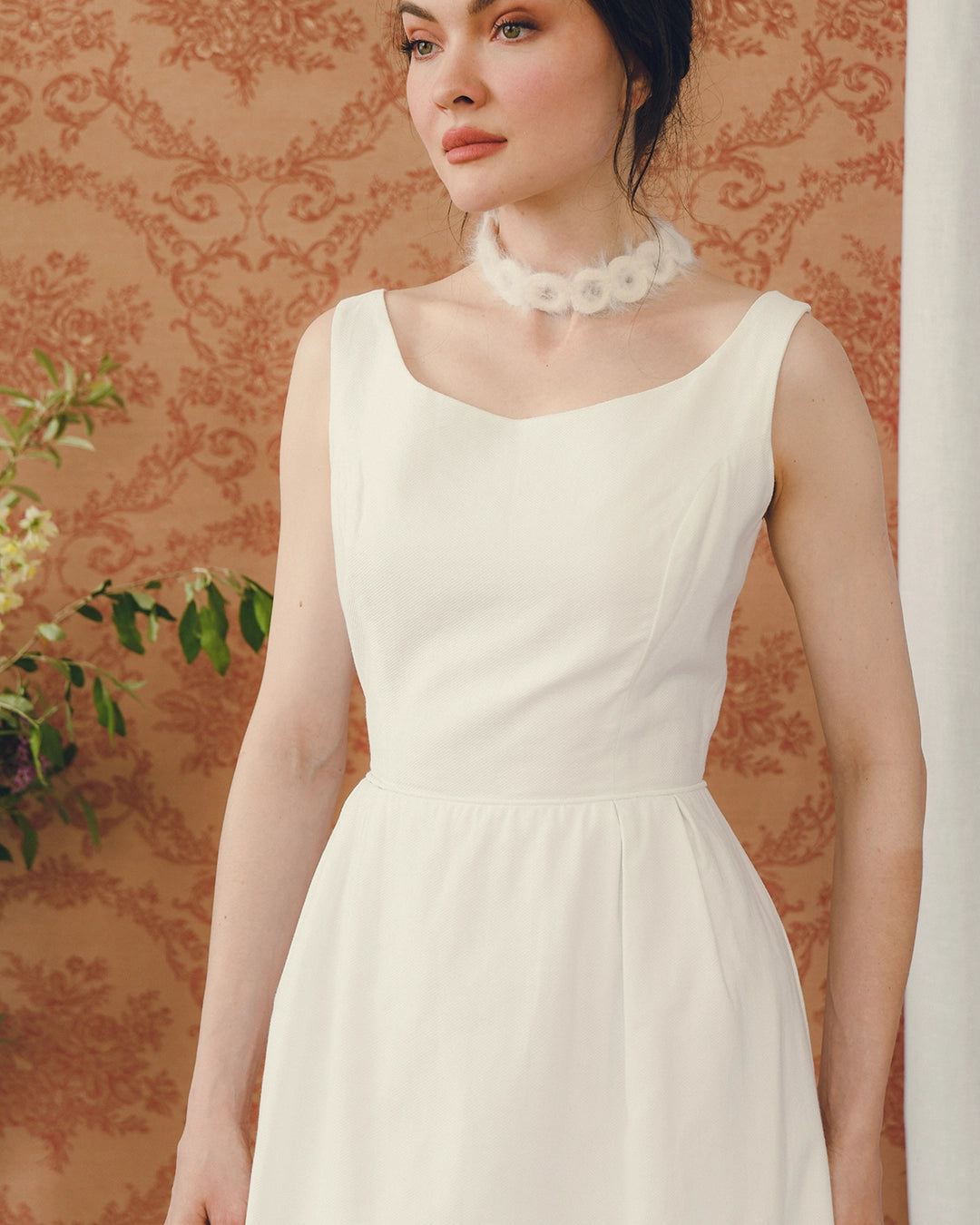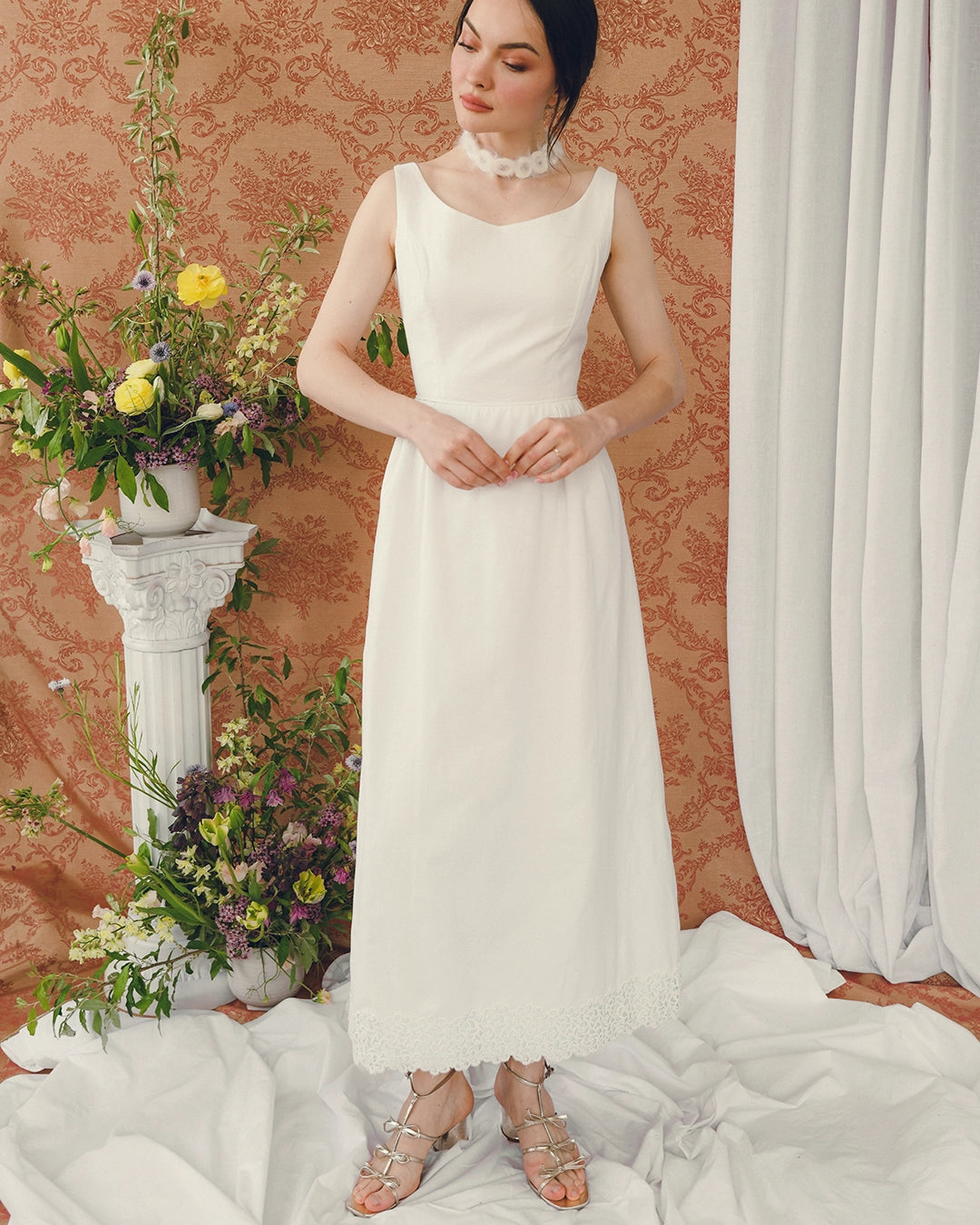 This chic vintage ivory column dress is classic 1960s and would make such a great option for a bridal look— Something Old! And the matching shawl adds a Something Blue as well. The fabric is a textured pique cotton-blend, which loans a somewhat relaxed feeling, offsetting the formality of the crochet lace appliqué at the hem, which is mirrored on the shawl.
