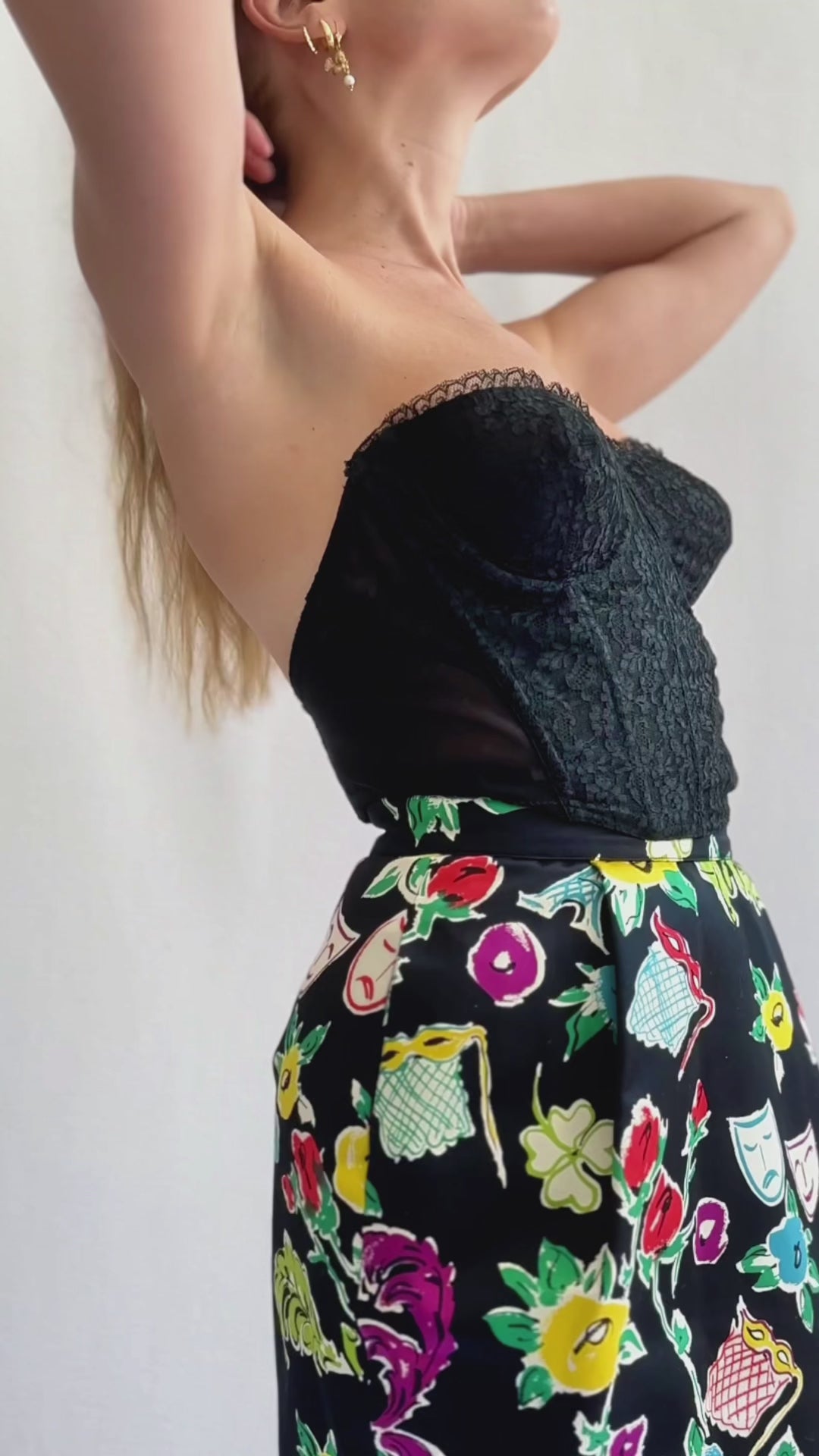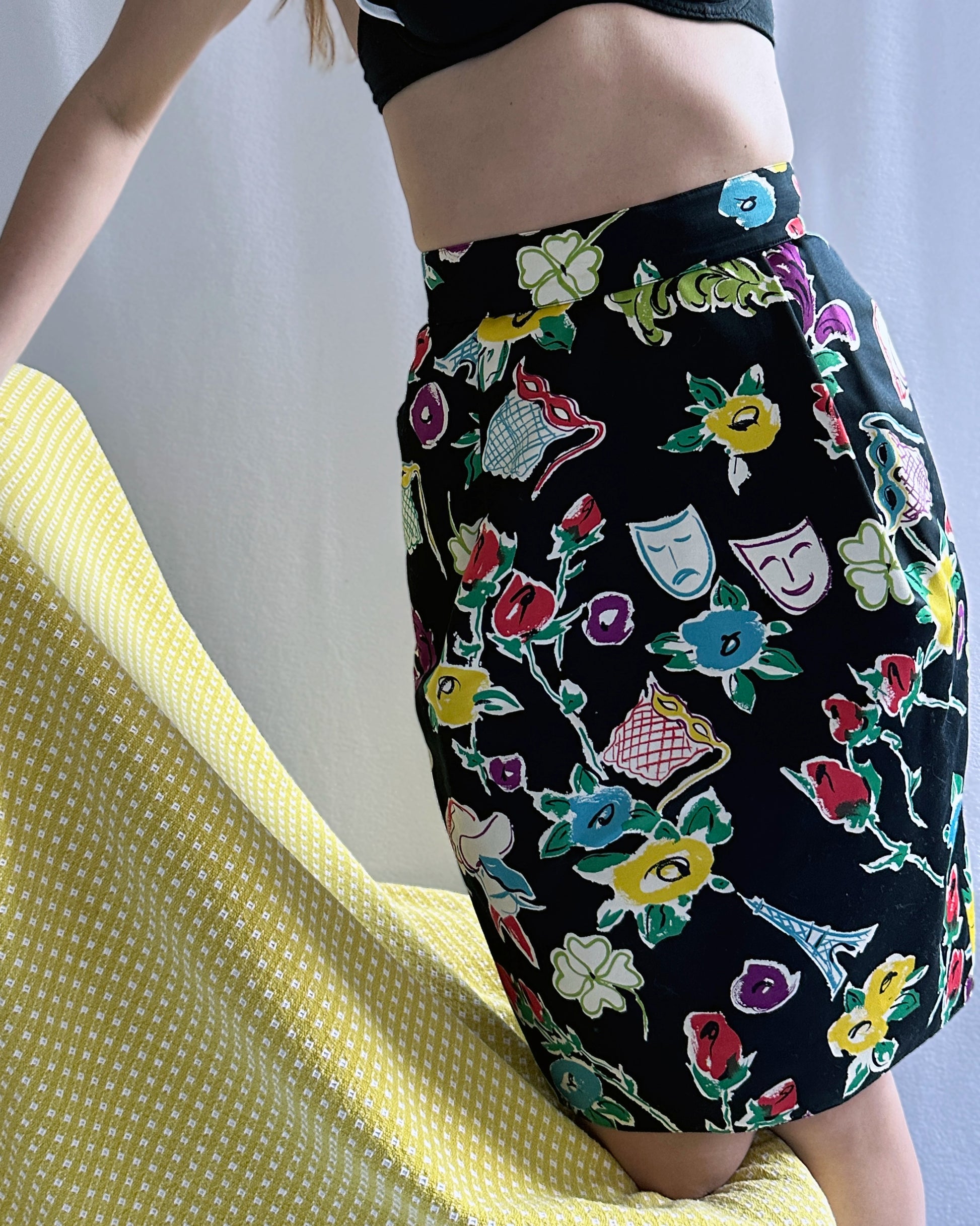This vintage Christian Lacroix skirt features the most uniquely whimsical print, but the shape makes it quite versatile. Made in the 1990s, it features a print of florals, Eiffel Towers, opera glasses and masks, in a great colorful palette that really pops agains the black. The skirt has a high waist, with a super fitted/pegged shape that tapers towards the knee, and pockets at the hips. The fabric is 100% cotton, but it has a sheen and feels more like silk! It's fully lined and exceptionally well made. Note: It is unfortunately missing the Christian Lacroix label, but this identical print was used by him. It does have a tag indicated it was made in Italy, which aligns with the other Lacroix pieces featuring this print.