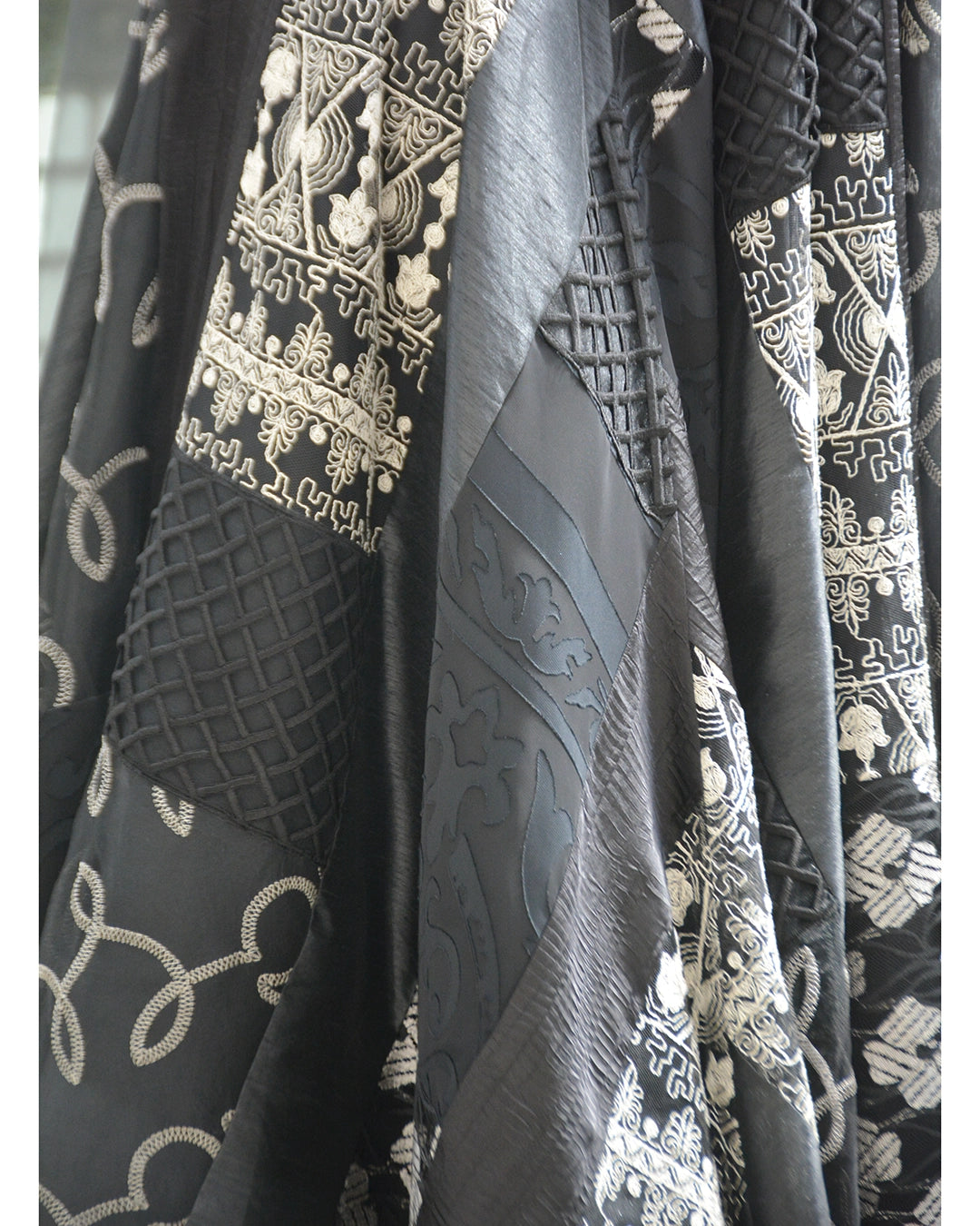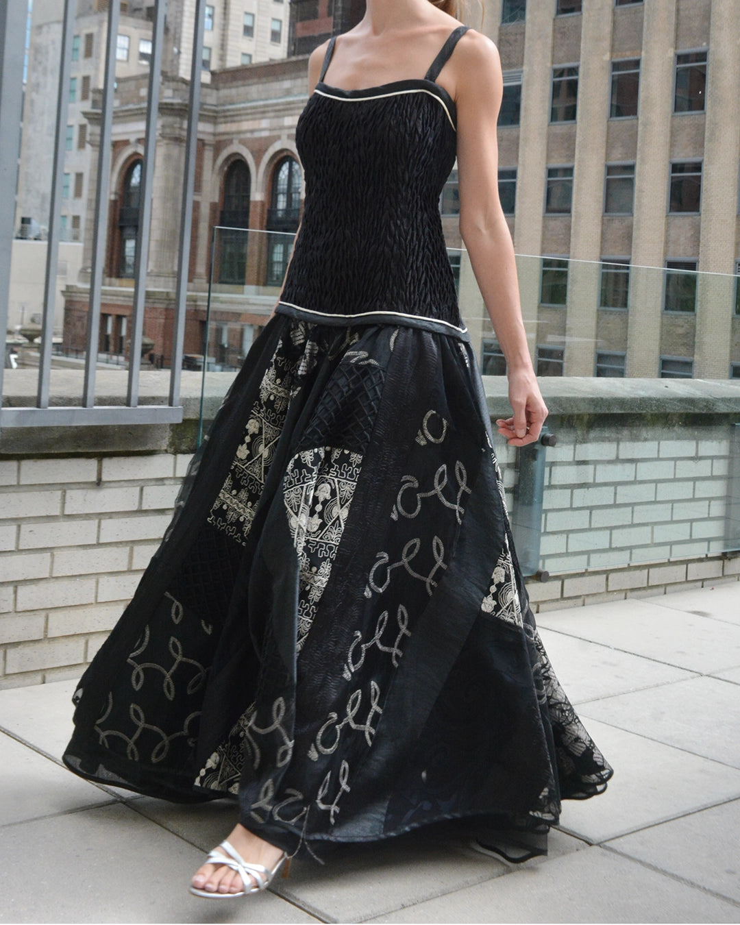 This vintage 1980s gown features a shirred drop waist and a full patchwork skirt, complete with a matching shawl with the same patchwork as the skirt. The bodice is so incredibly flattering— the elastic shirring creates a great amount of stretch, so that it conforms to the body (which also allows it to fit a range of sizes). I also love the beautiful texture of the shirring. The sweetheart neckline, emphasized with piping, contributes to this flattering hourglass effect, and I love how the V in the back shows a little extra skin for some drama. The skirt and shawl are a patchwork mosaic of dozens of different techniques: various embroidery patterns, large-scale crochet lace, appliqué, pleating, and more. It has an additional layer, which prevents sheerness but also creates dramatic volume and sweep. The embroidery is done in both white and silver against the back— this dress is very easy to pair with any color accessories/jewelry. It's a dress that's really easy to dress up or down as well— you could wear it for a black tie evening function, or dress it down with flats/sandals and wear to dinner! The shawl is a great size to wear a number of ways— I love the tassels, which add some drama. Made in the USA.