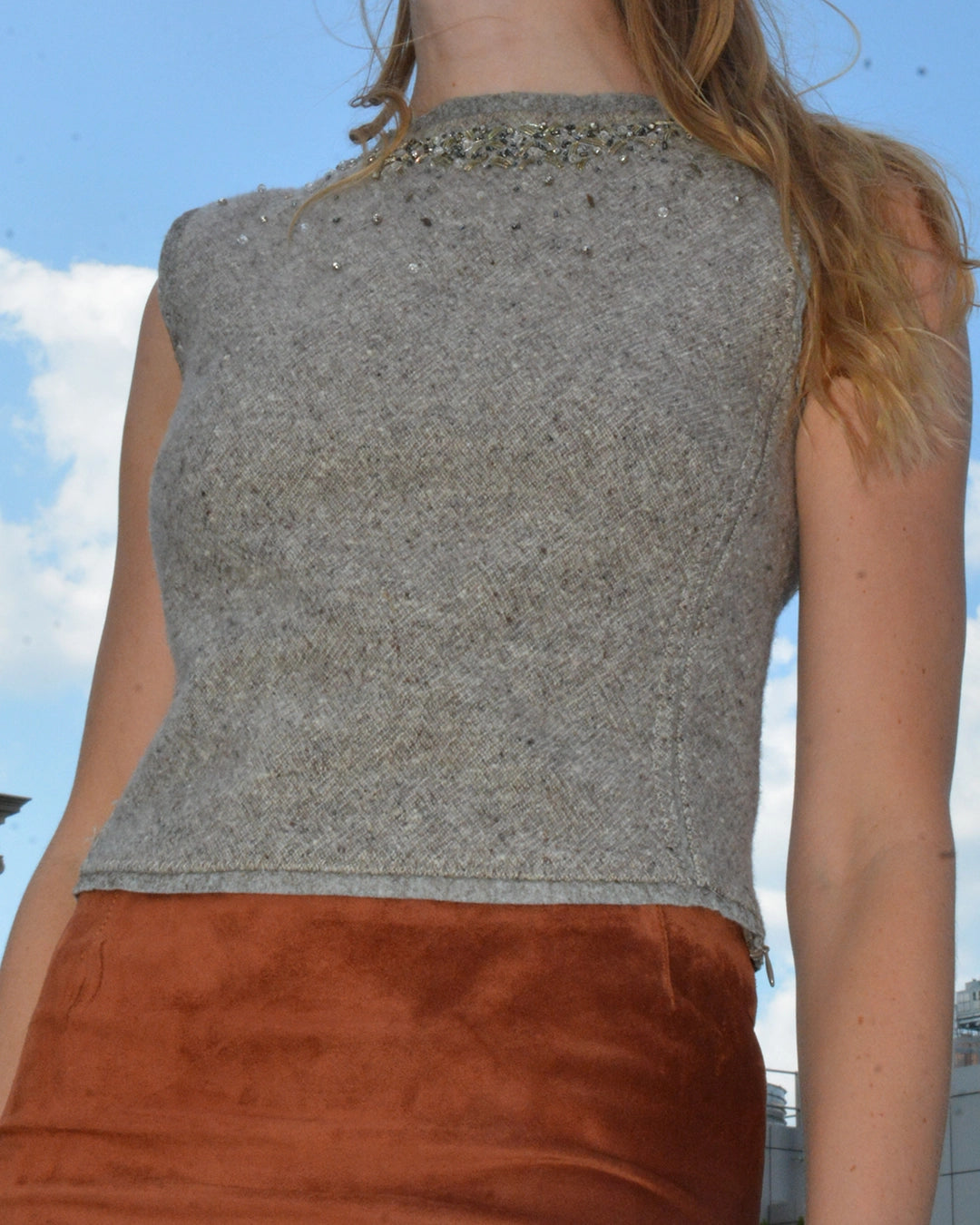This Alberta Ferretti embellished shell is made of the most gorgeous, lush cashmere wool blend, with cashmere inlay details at the seams and hem. The embellishment is subtle enough to remain neutral, but still adds something really special— the ultimate "quiet luxury." The shape is really nicely fitted throughout, with a zipper hidden in the bottom side seam to make it easy to get into. Made in Italy.