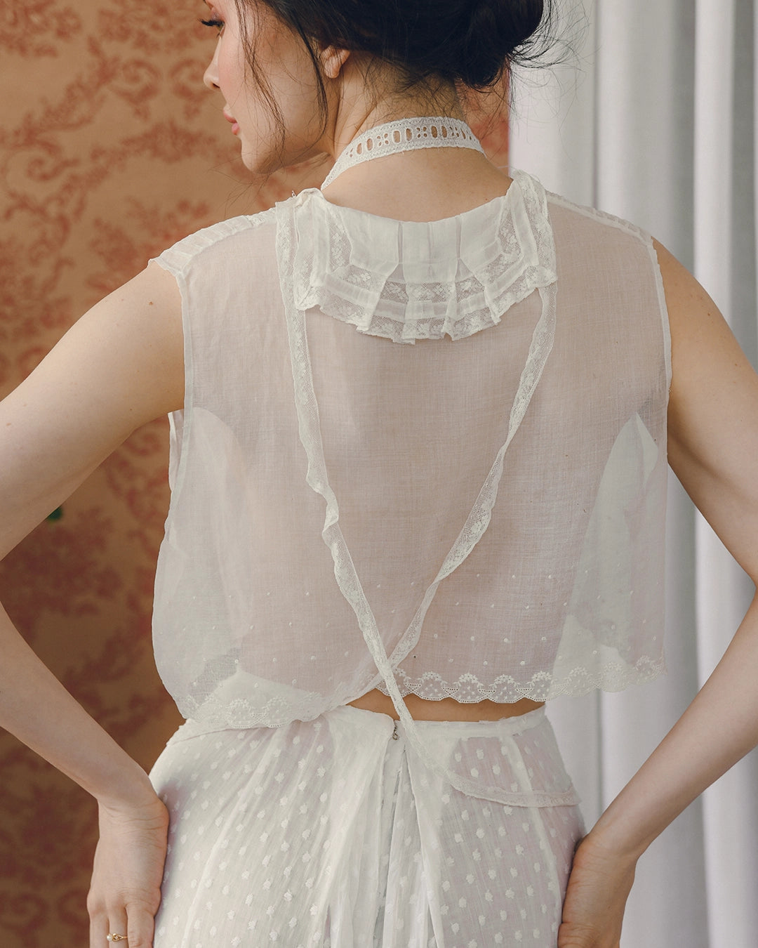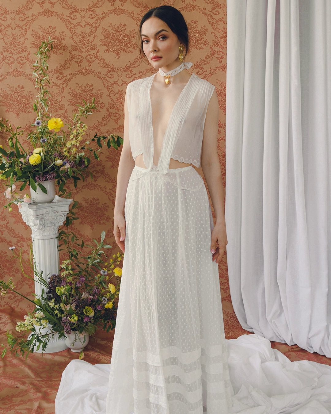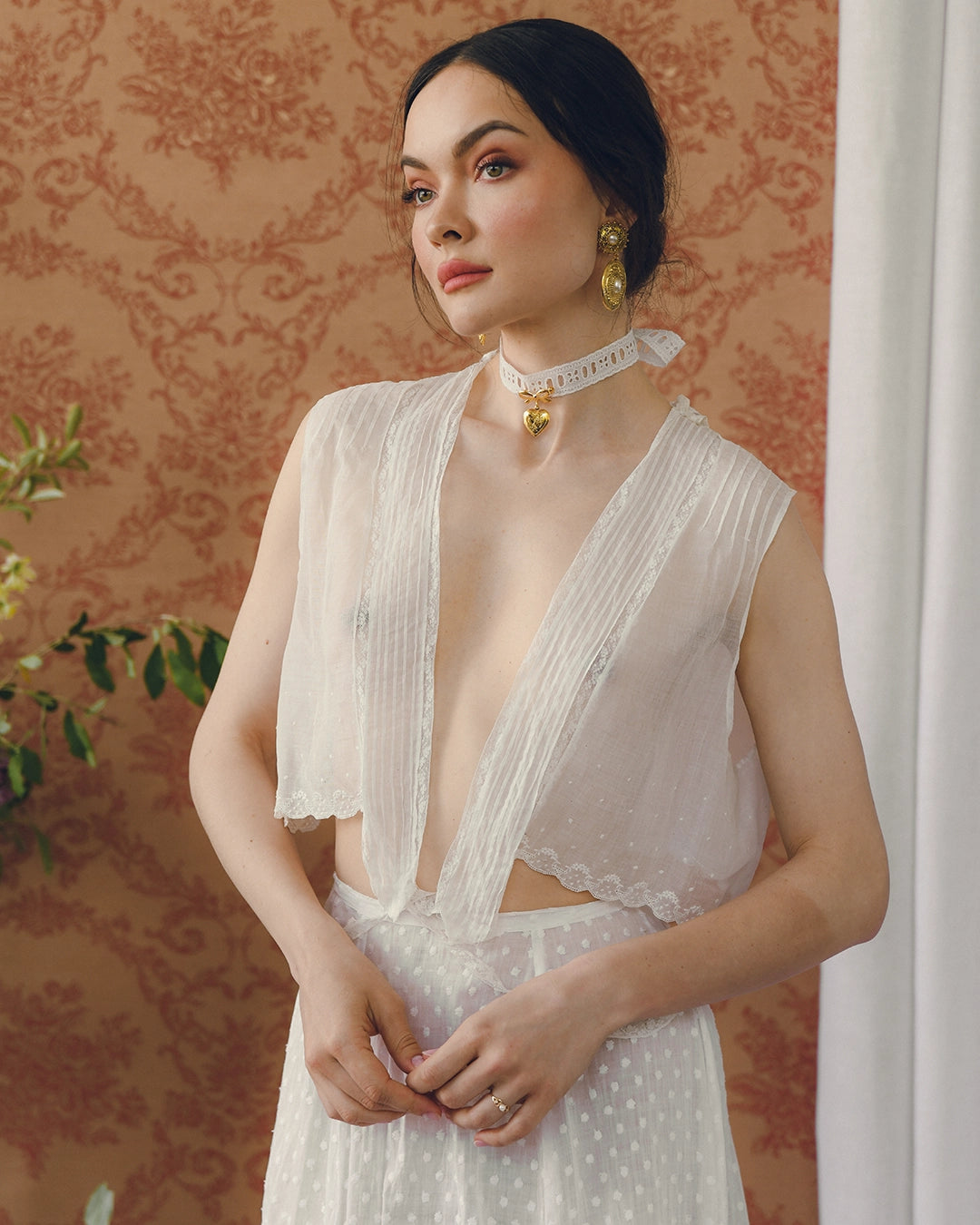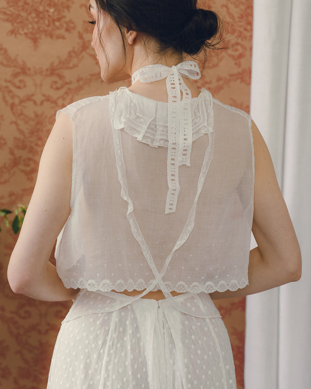The Antique Edwardian Swiss Dot Skirt, Vintage Earrings, and Vintage Ribbon Choker pictured are also available.