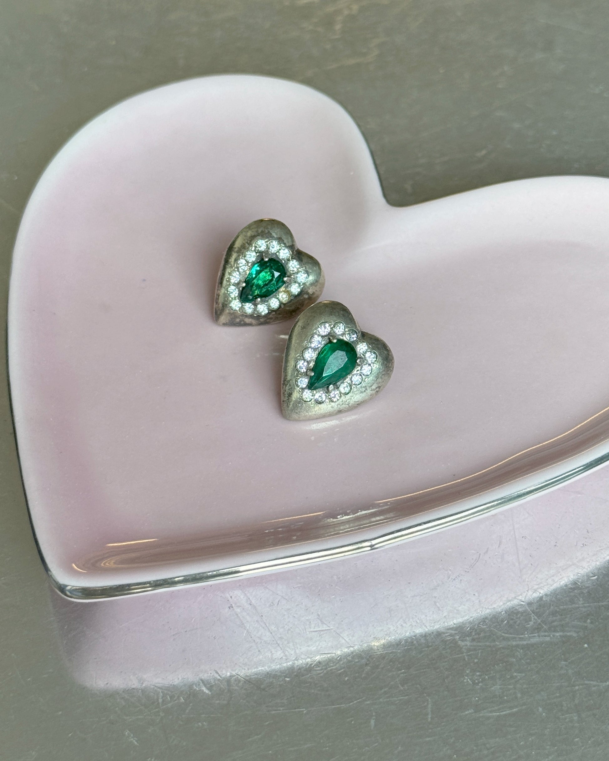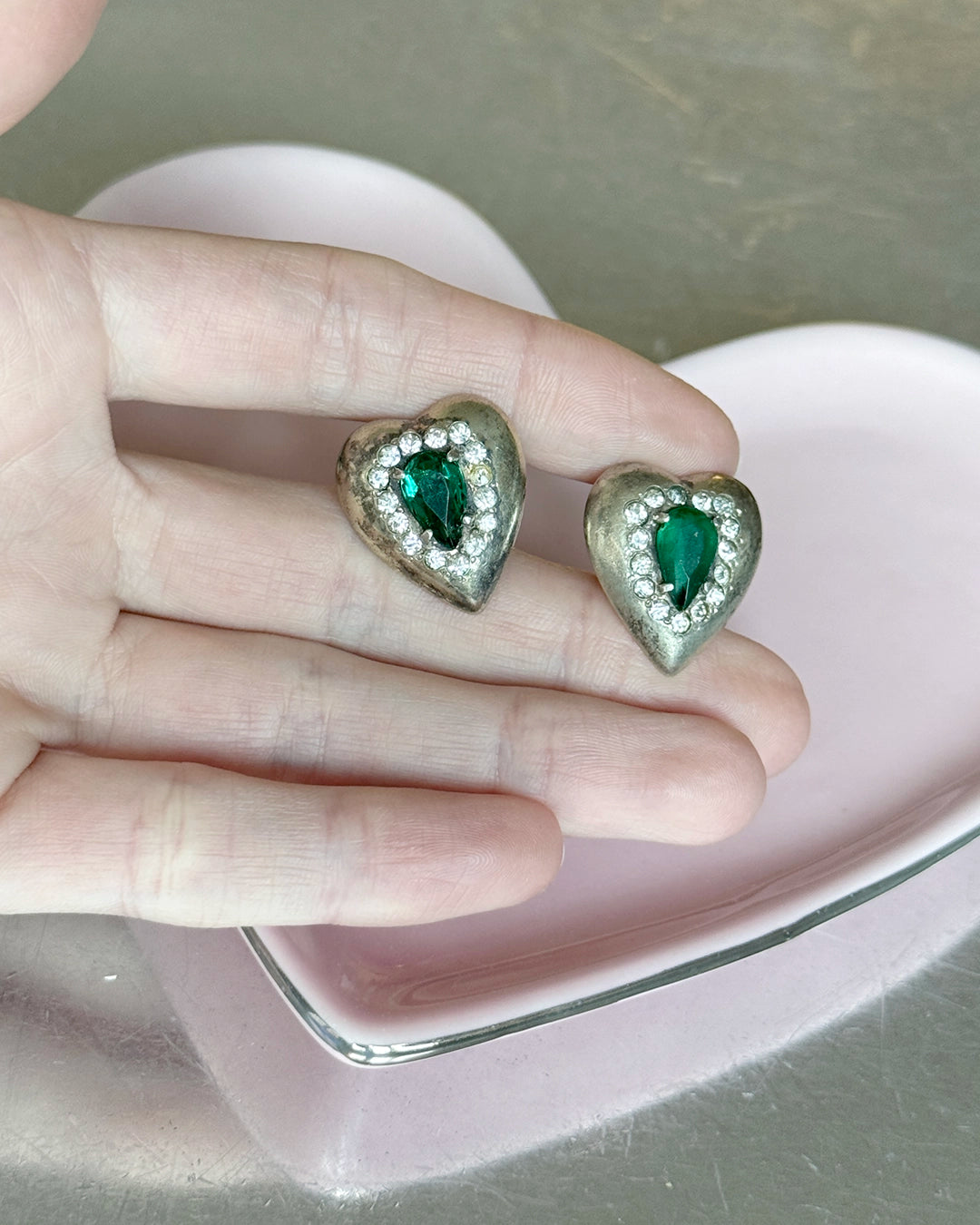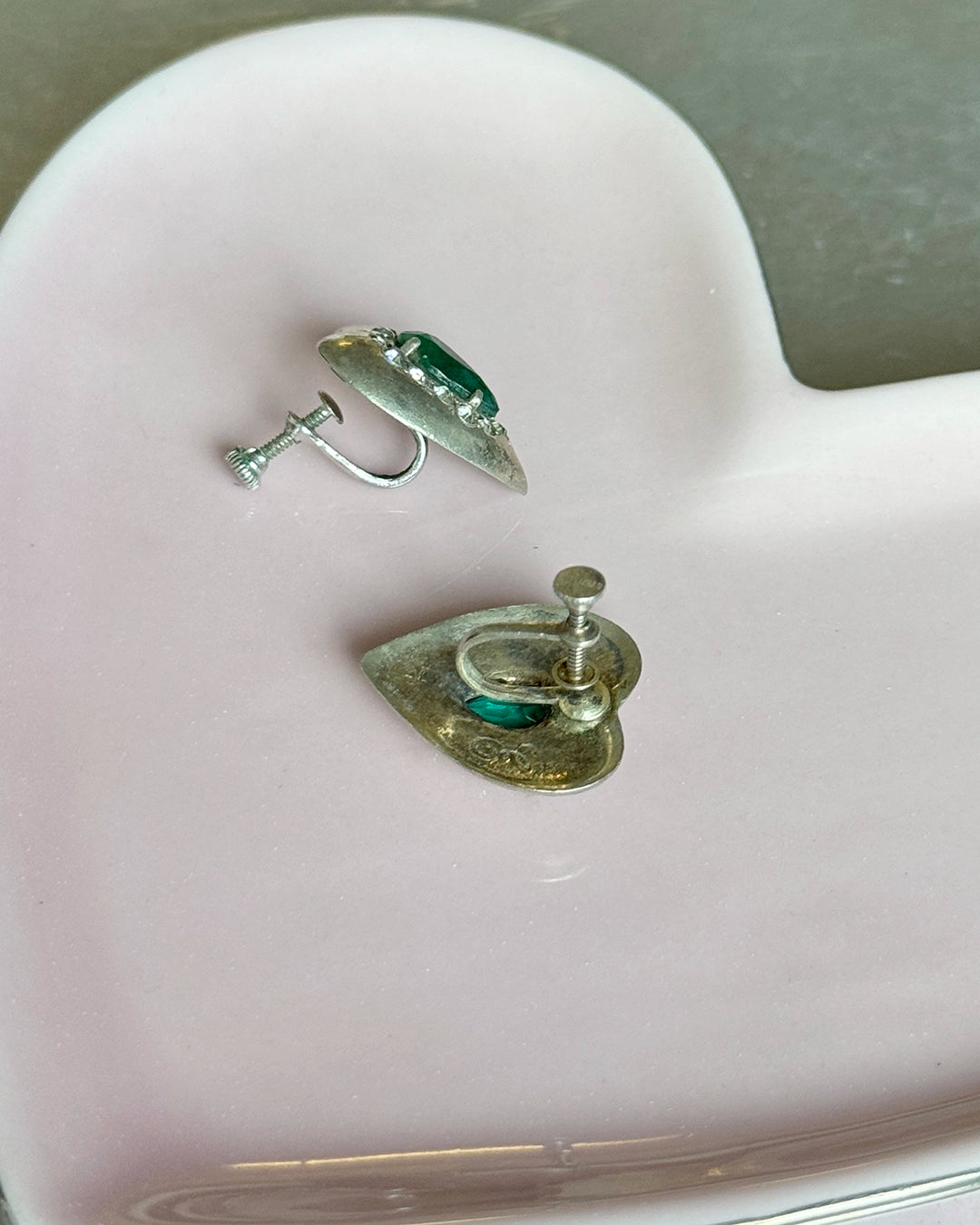 These antique 1920s Art Deco sterling silver heart earrings are a timeless heirloom-worthy jewel, and an amazing gift! They are crafted of sterling silver and set with emerald glass stones, with a halo of smaller colorless crystals. They are finished with a screw-back clip on closure; this type of vintage screw back is my favorite because it truly feels like nothing on the ear, and is so comfortable for extended periods of time, yet remains remarkably secure. (Vintage clip-ons are so much more comfortable and secure to wear compared to their modern counterparts, largely due to the quality and thought that went into their hand-made construction.) Hallmarked "STERLING" and signed with the letter "E." They measure 22 mm total length x 19 mm at widest point.