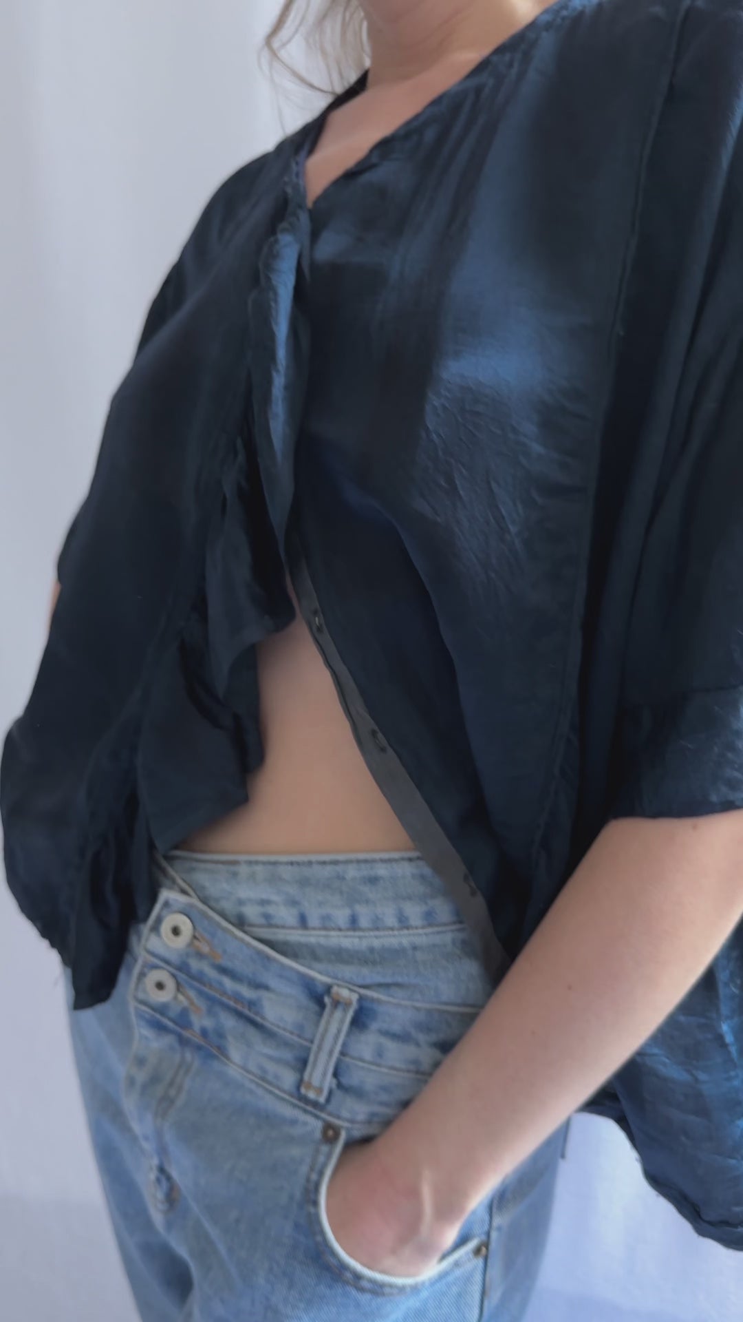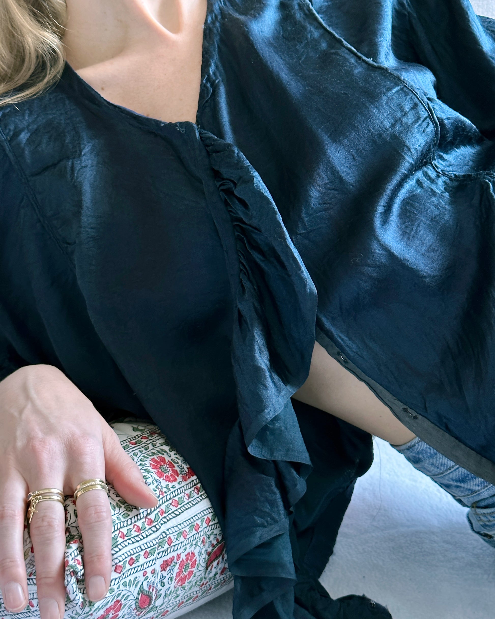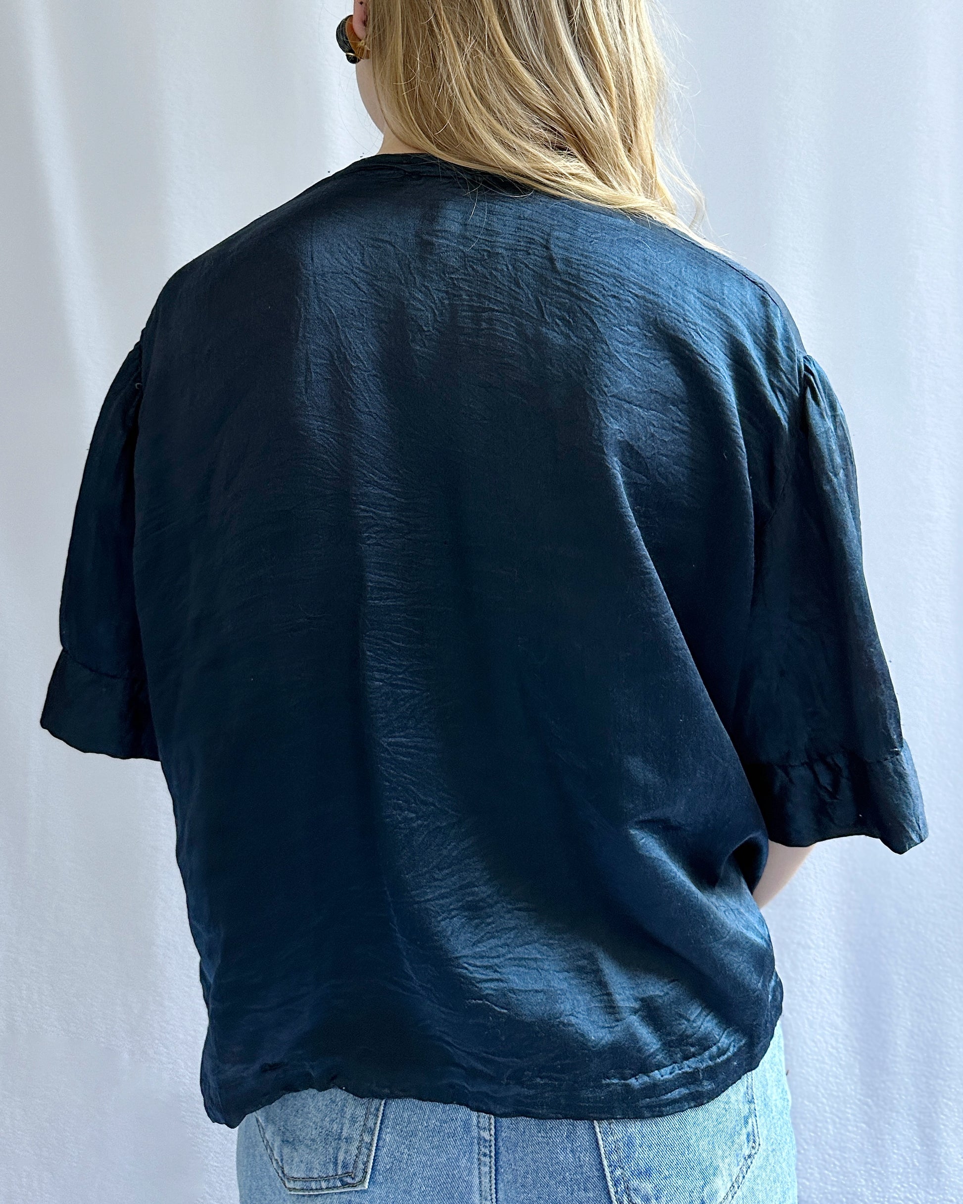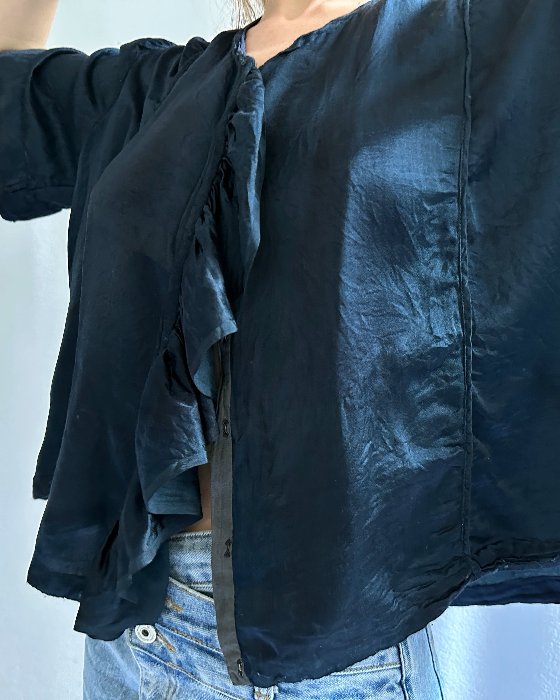 This vintage 1920s silk blouse is a little piece of flapper history, and a very rare find. The 1920s was a period of liberation in a sense for women, and a full departure from the corsetry of the 19th century: straight dropped waist, flowing silk, oversized sleeves, etc. This particular blouse is emblematic of that: the bodice flows away from the body and the arm holes are very dropped. It can be worn has both a blouse, and a jacket. The sapphire blue silk has an almost iridescent look, and a really soft and flowy feel to it. It closes with small hooks down the front, with a ruffle running down the lapel.