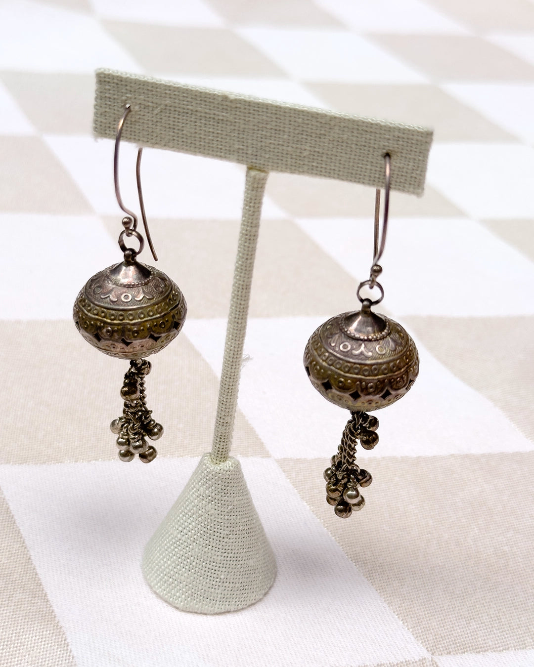 These one-of-a-kind antique Balkan silver filigree drop earrings are so special! They bear the signature shape and workmanship of jewelry from the Balkan region, carefully traced with embossing and etching, and filigree cutout work. These are one of those earrings that looks so much better in person! They are made some sort of silver alloy (not specifically sterling). They hang from an ear wire; despite their size, these earrings are lightweight and comfortable, as the entire orb is hollow, and they are hand-crafted. Measures just over 8cm total length.