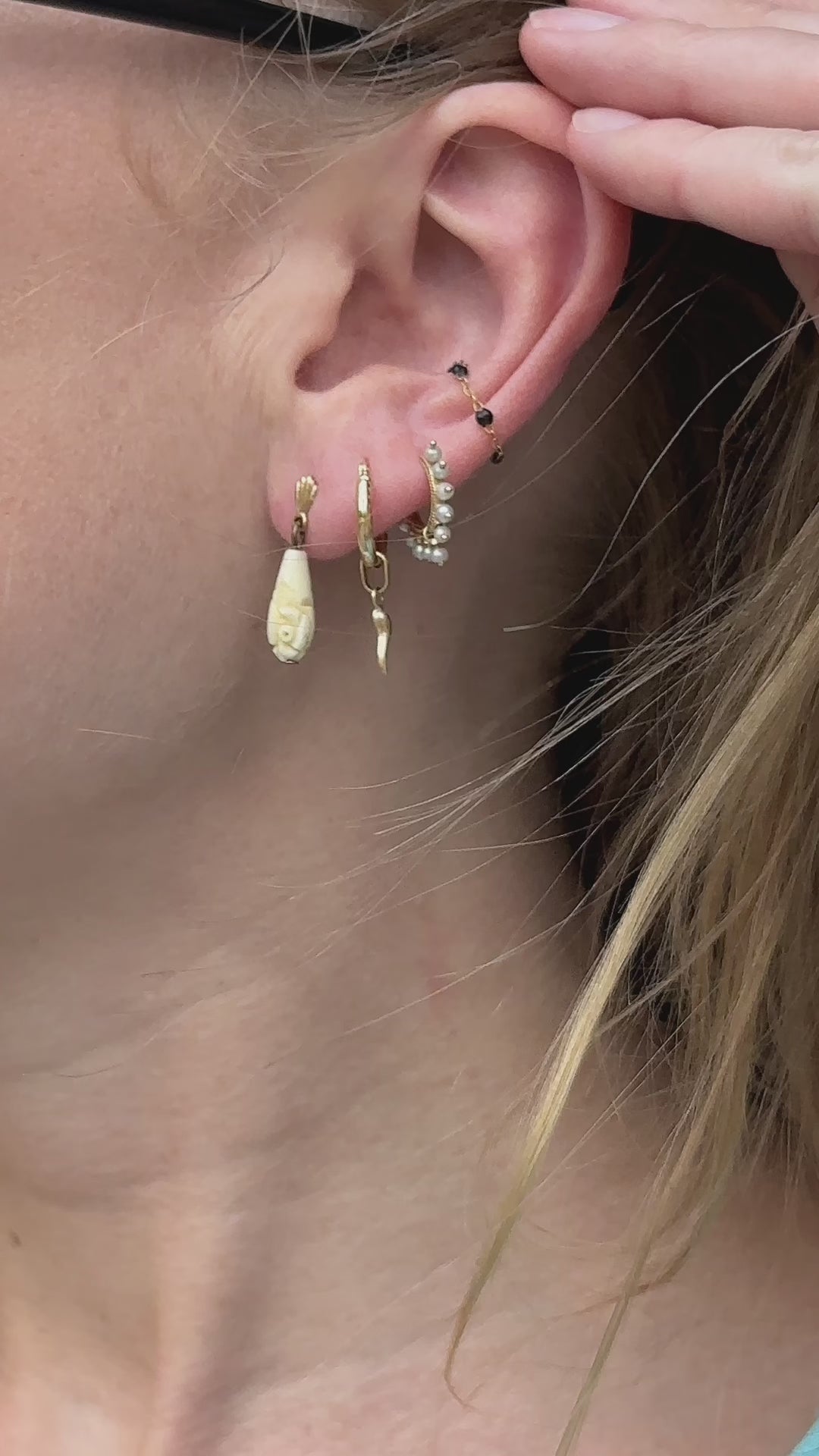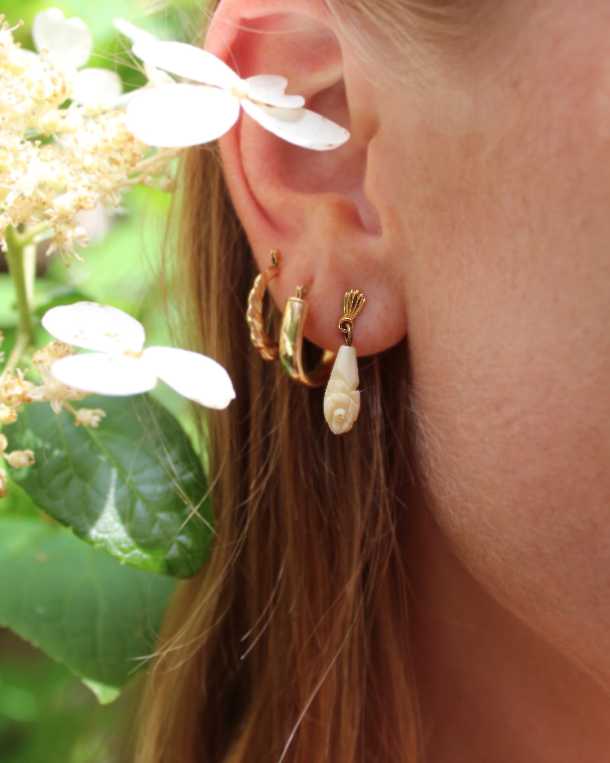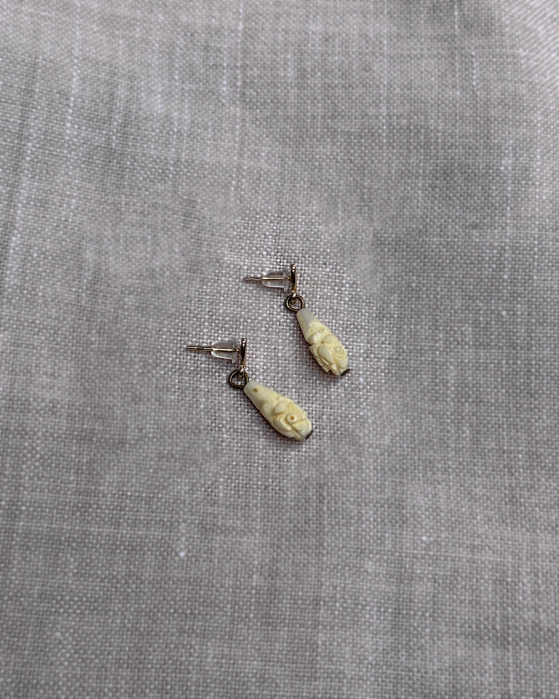 These antique carved bone drop earrings are a rare find— I've never seen a pair quite like these. What makes them special is the intricacy of the hand-carving on the elongated teardrop, depicting a rose motif. More commonly, you will see carved bone earrings and other jewelry sculpted on a much larger scale, which is of course easier. The tradition, however, goes back millennia: the earliest jewelry created by man used readily-available materials like animal teeth and bones as opposed to metal. Circa 19th century and made in Europe, these earrings are suspended on a gold-filled post— the next-closest metal to solid gold, which is resistant to tarnishing and safe for the skin. They are so incredibly lightweight and basically feel like nothing on the ears— the small size make them perfect for layering with other earrings in your ear stack. The have a post back for pierced ears and measure 22 mm long.
