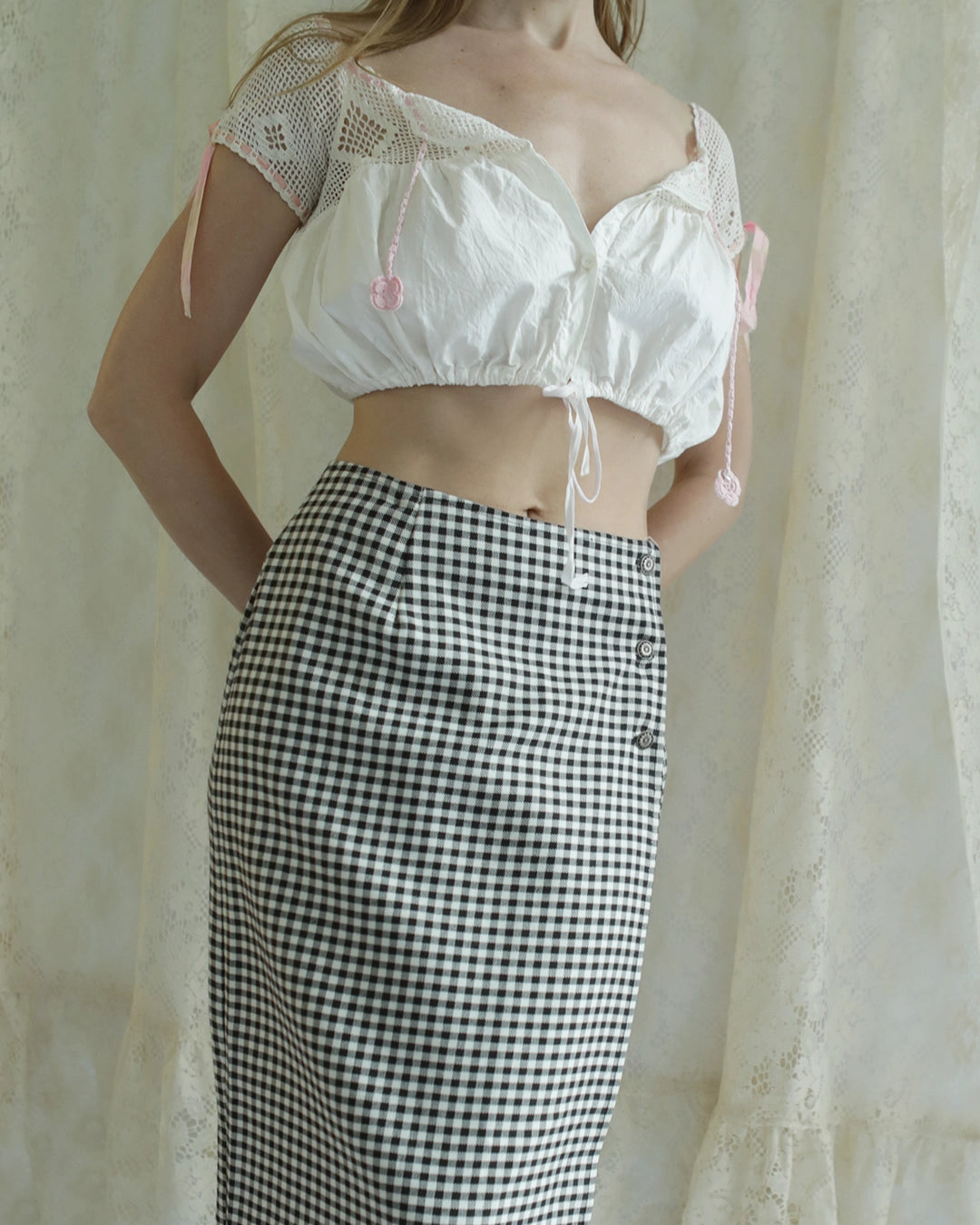 This antique Edwardian corset cover (made circa 1914) features filet crochet yoke neckline, all crocheted by hand, complete with pink ribbon ties at the sleeves (which have a sort of hand-dyed, ombré feel), and pink crochet flower ties at the neckline (which I believe were added at a later point). Below the neckline, the bodice is very full from gathering, creating that quintessential Edwardian "pigeon-breasted" shape, buttoning down the front and stopping at the natural waist. It has an original drawstring tie at the waist, with a lot of flexibility in the waist measurement due to all the gathering. It's not always easy to find these antique corset covers in sizes that aren't tiny!