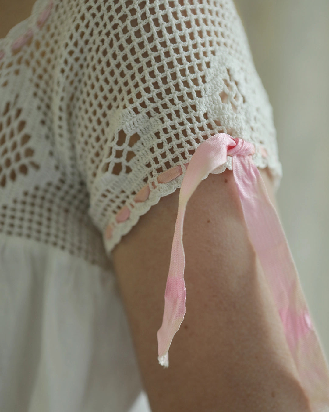 Great antique condition, with wear commensurate with age. Keep in mind this piece is well over 100 years old. The pink ribbon ties at the sleeves appear to almost be hand-dyed/ombré effect because of the uneven color; upon closer inspection, it appears it's from fading of the original color, but it genuinely looks intentional and adds to the unique antique charm of the piece. The ribbon could also be replaced easily. With any questions about the specific condition or size, please email shop@verybreezy.com for additional photos or measurements, as all sales are final.