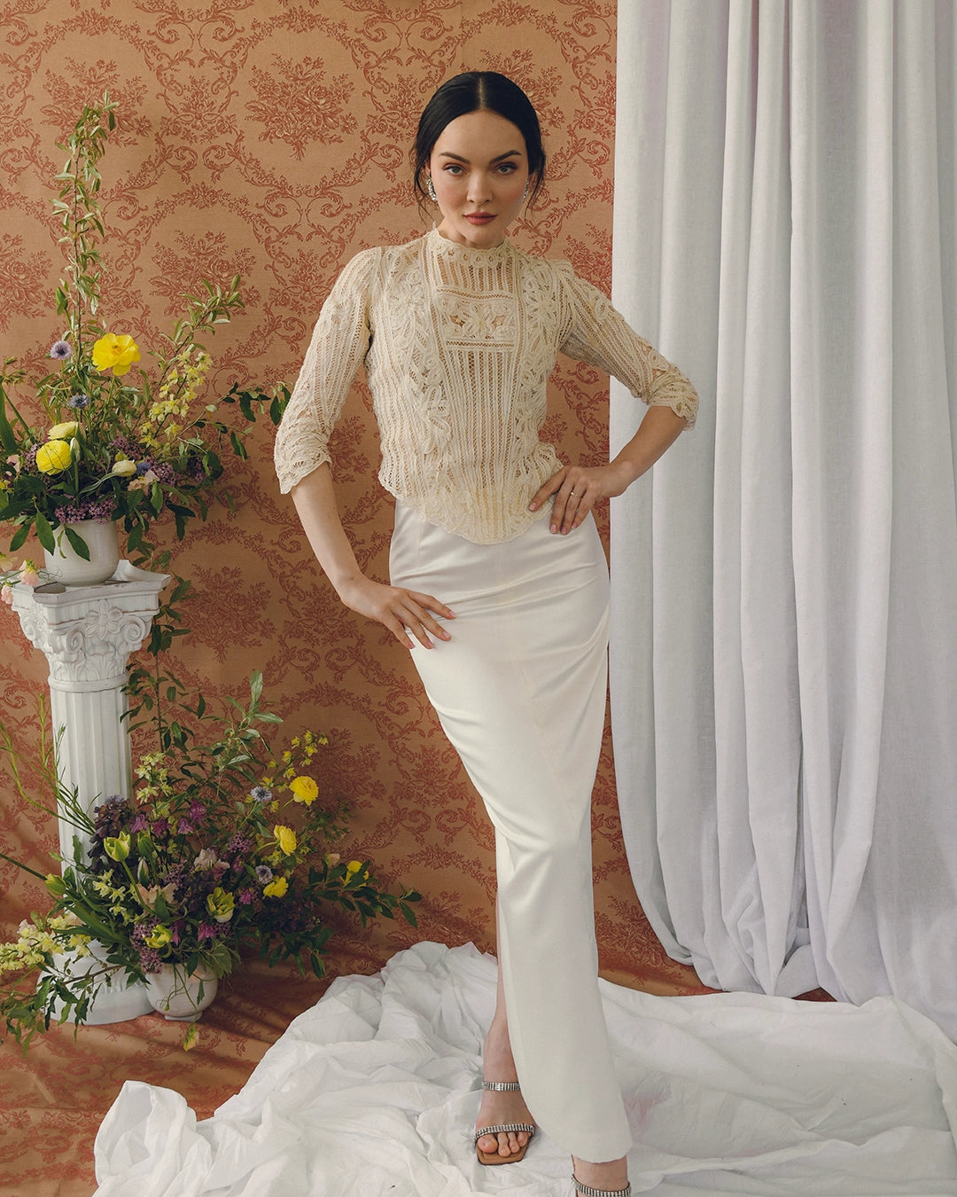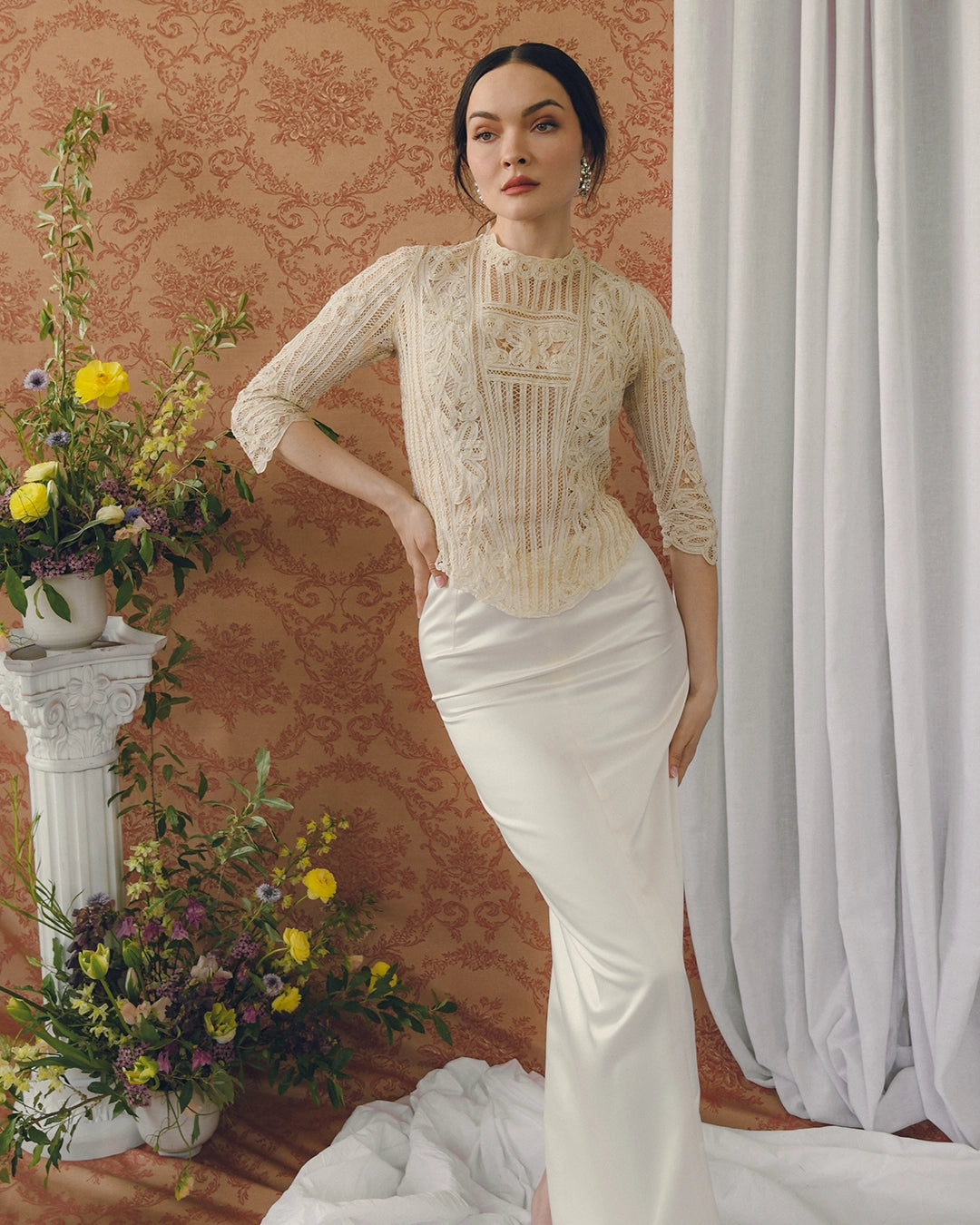The Designer Vintage Satin Column Skirt and Vintage Diamanté Earrings pictured are also available.