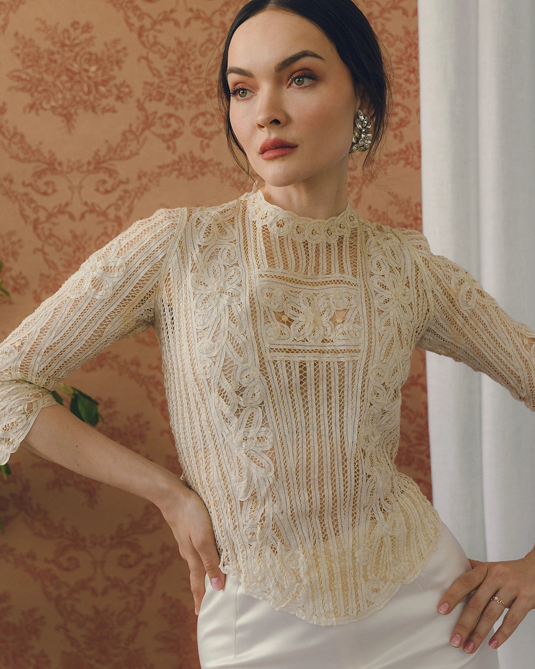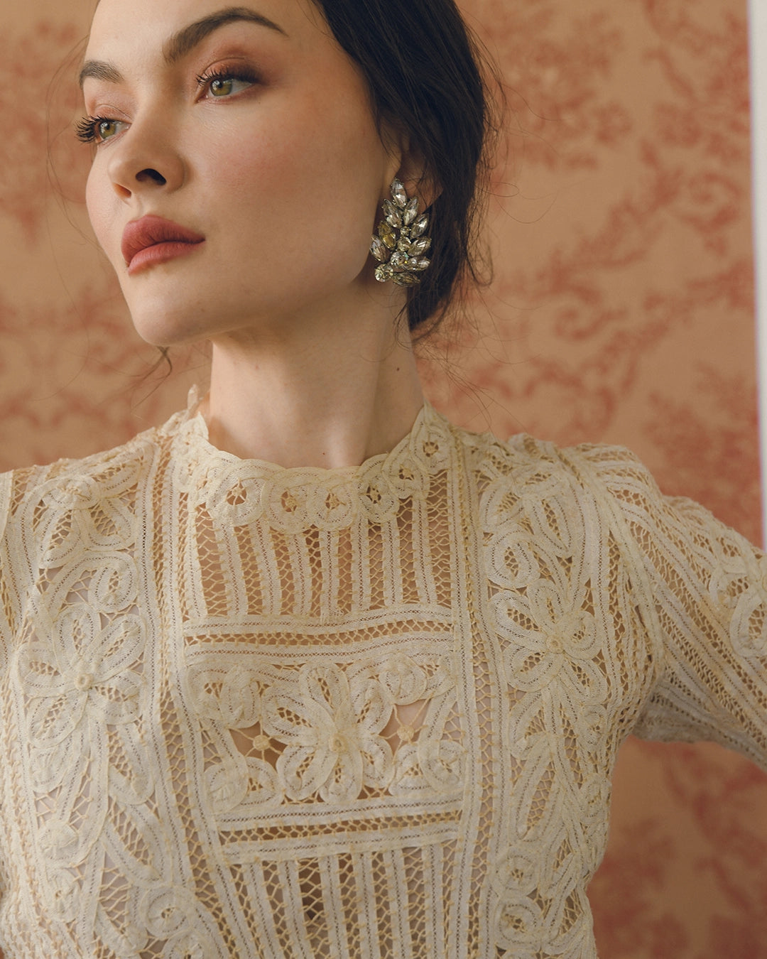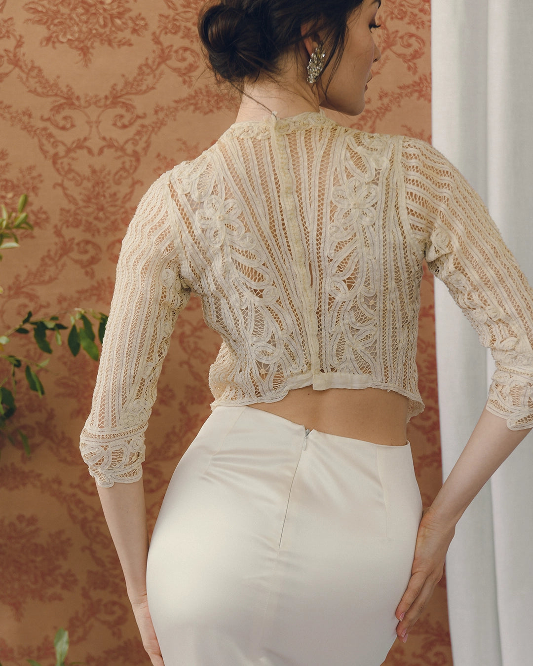 This incredible antique Victorian bodice is crafted of Battenburg lace and completely made by hand, in the late 19th century— it's really remarkable to see all the details in person. I love antique clothing because you will never find a modern piece with this workmanship and attention to detail. It features a silhouette typical of the late 19th and very early 20th century, with a basque-shaped waistline that comes to a point in the front, and is much shorter in the back. It closes with hidden hooks and eyes in the back.