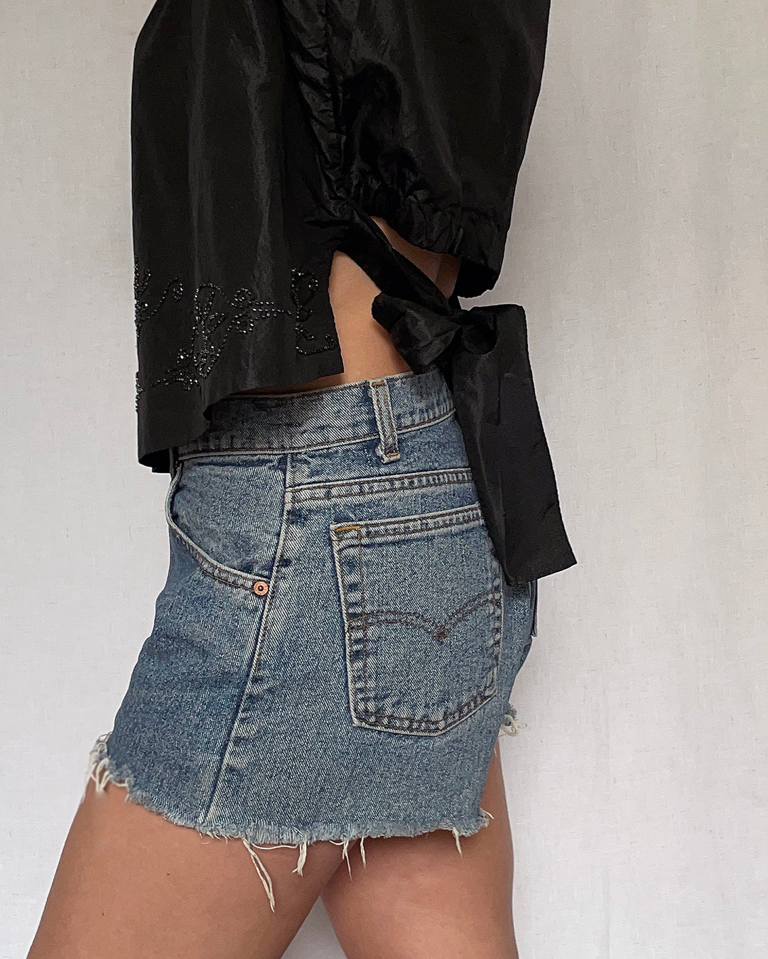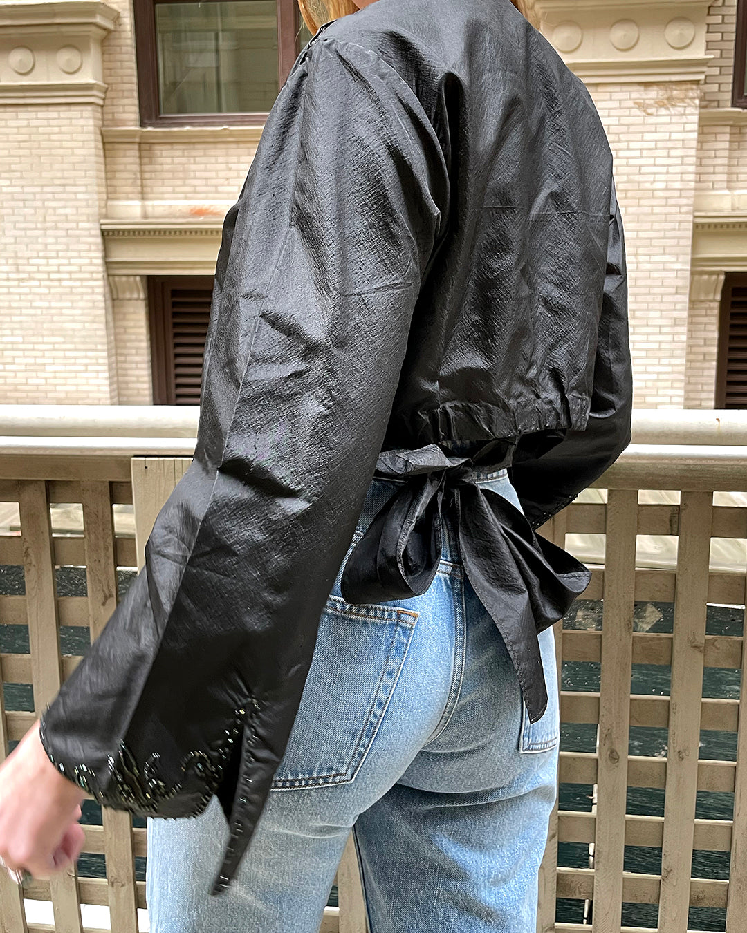 This incredibly rare blouse was made during the Victorian era— pieces from this period are increasingly difficult to come by, making them all the more collectible. Like in some earlier periods, the Victorians took mourning dress very seriously and would wear black for a designated period of time after the death of a loved one. But, thanks to Queen Victoria, wearing black actually became quite fashionable — after the death of her husband, she wore black for 40 years! This blouse is made of a gorgeous lustrous black silk, with iridescent tonal beading. What's important to consider is that all of this embellishment was done by hand! When you look close and see how tiny the beads and stitches are, it's really impressive, and I love the regal design they create. The silk is very unique— it has nearly the sheen of taffeta, but is much lighter and and more drapey, similar to silk Habotai. The blouse is finished with a covered-elastic waistband. Refer to the image where it is hanging: the strap hanging lower is going around the front of my waist when worn, and covered by the front of the blouse, but you could also keep it in the back so that there would be two of these straps in the back. There is a ribbon "belt" which I've tied in a bow. It closes with hidden snaps at the shoulder.