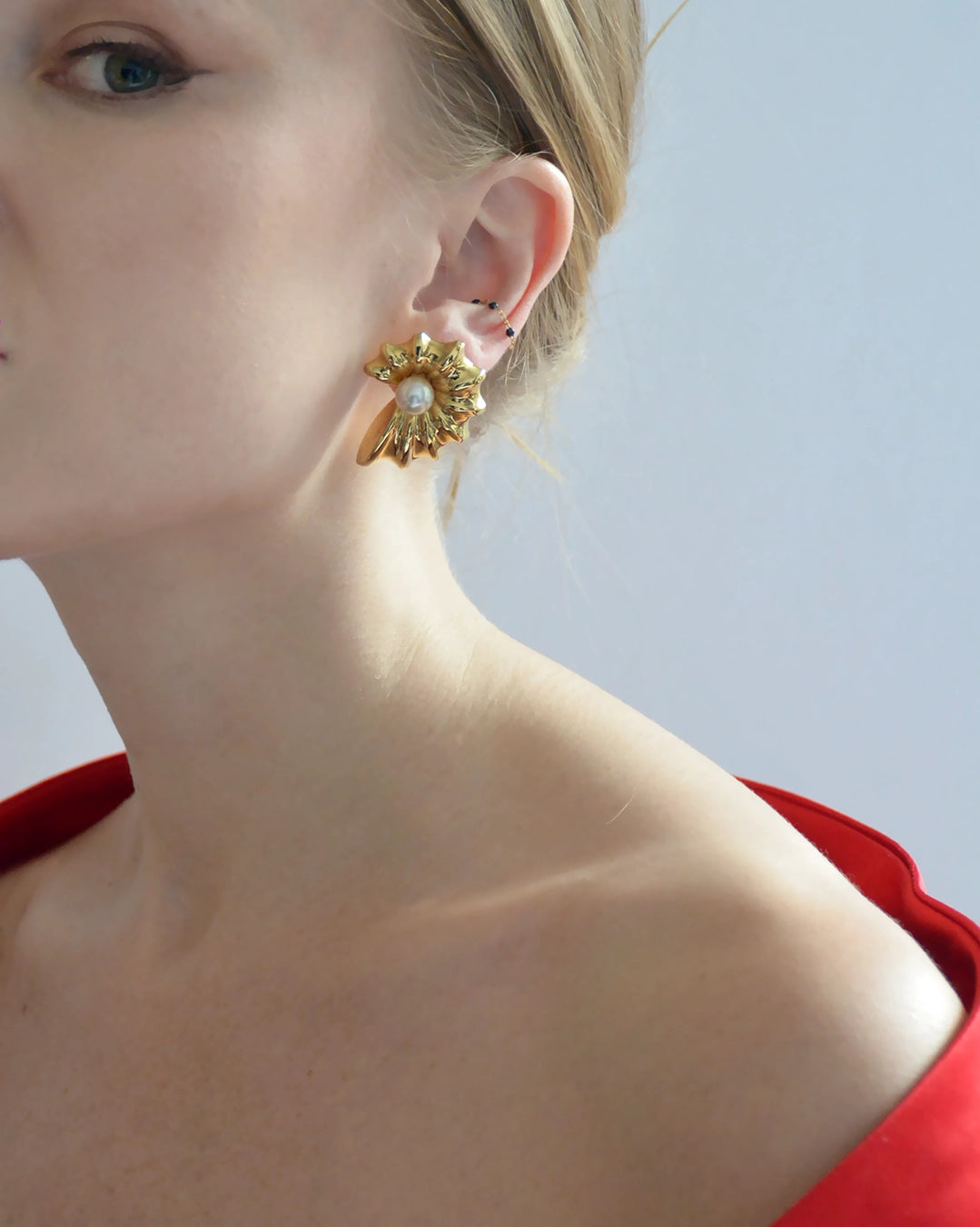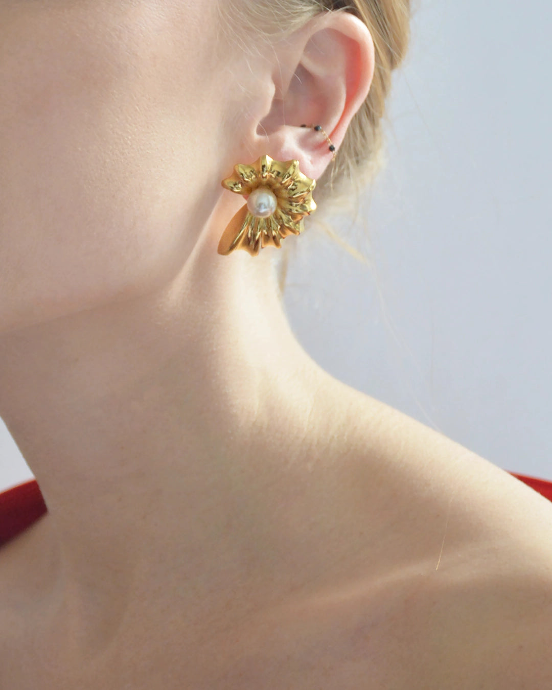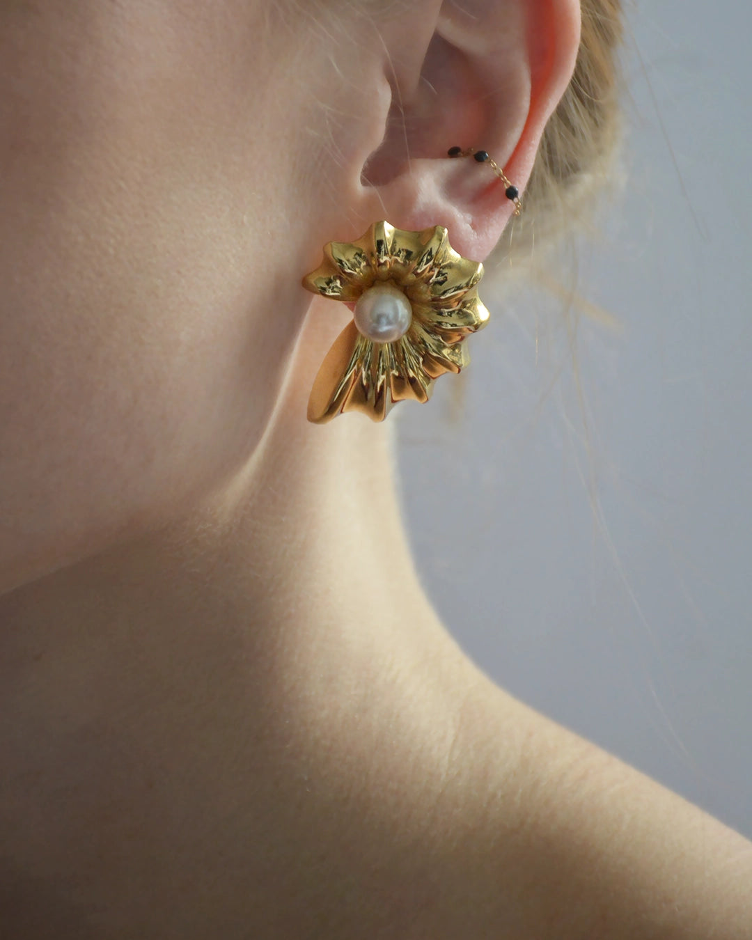Circa 1980s, these vintage gold and pearl earrings resemble a seashell, with their spiny ridges and spiral shape. It's abstract enough, though, that it's not overtly themed. They are punctuated in the center with a pearl detail. They are finished with a post back (which is not always easy to find in vintage earrings) and are very lightweight and comfortable to wear, due to their strategic construction. Vintage earrings are so much more comfortable to wear compared to their modern counterparts, largely due to the quality and thought that went into their hand-made construction. Measures 42 mm long x 29 mm wide.