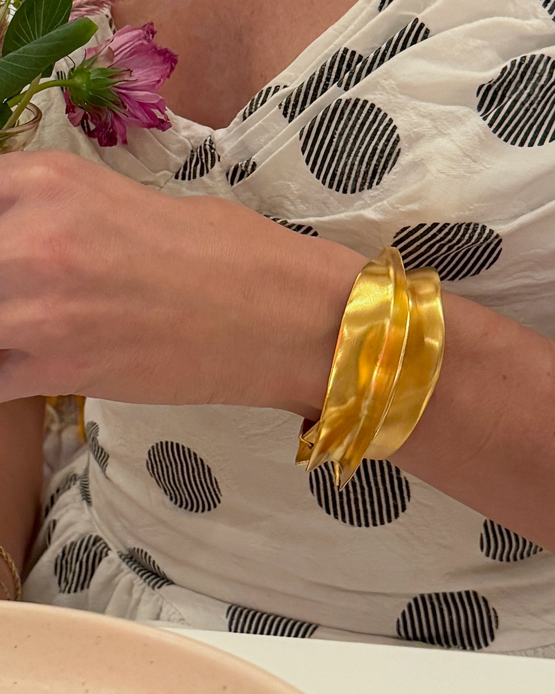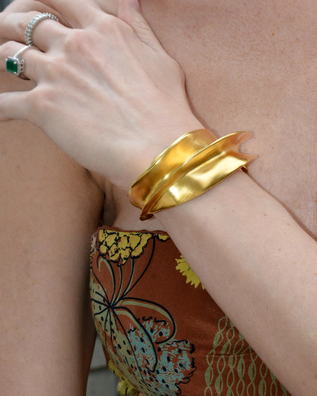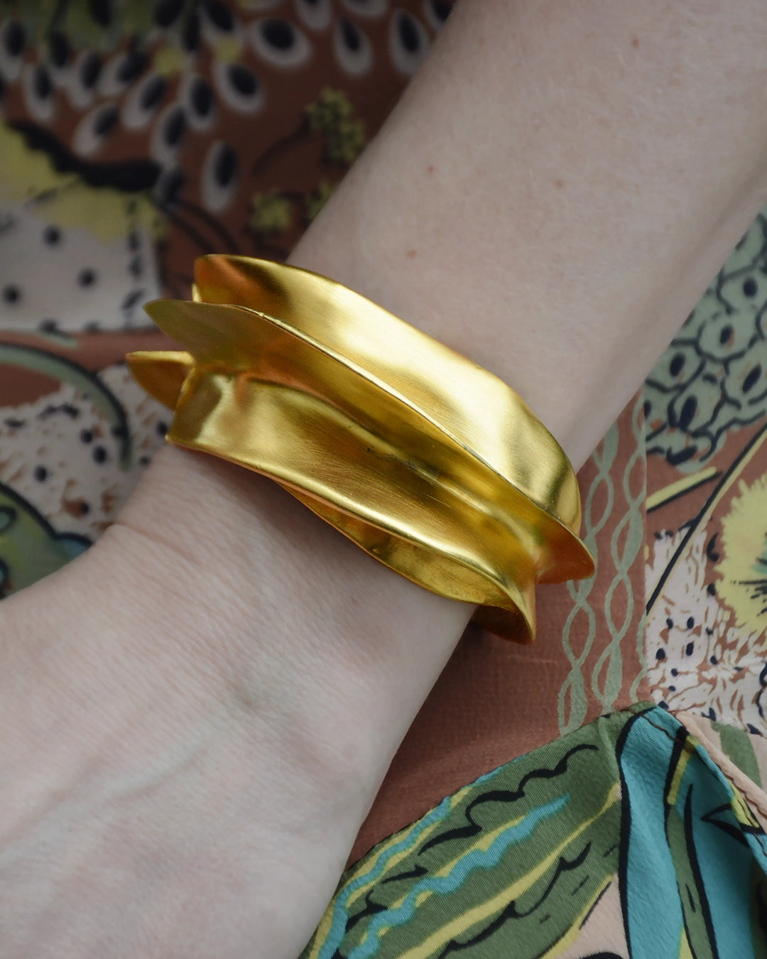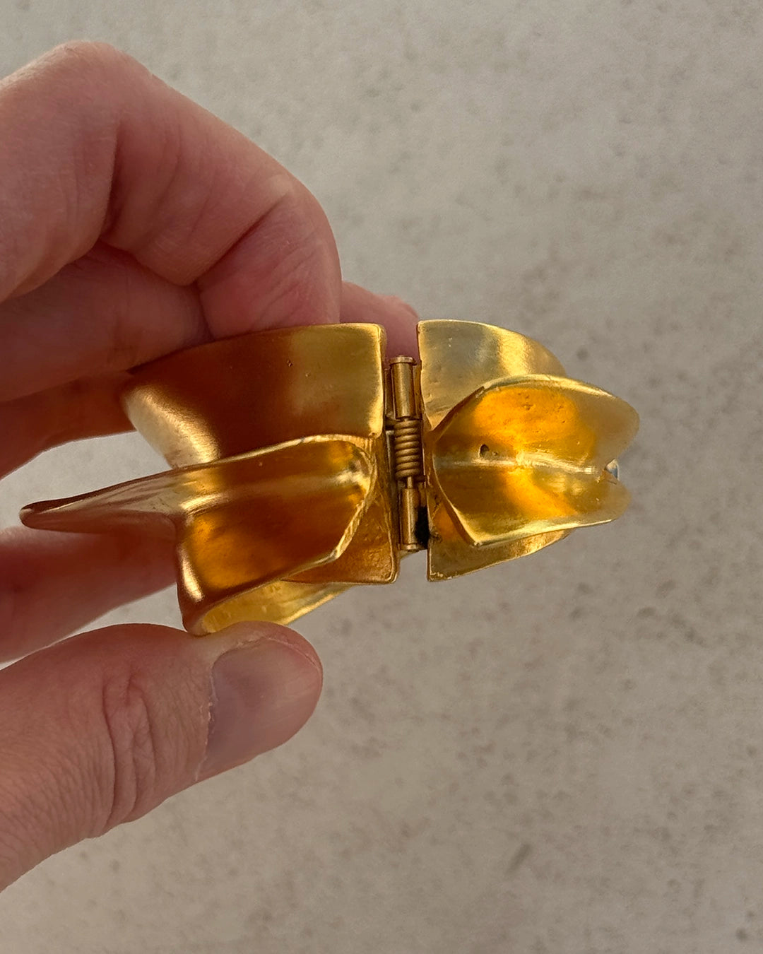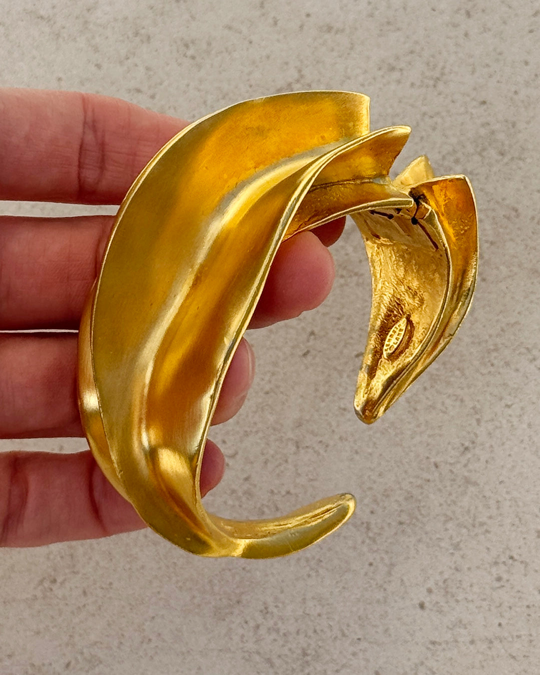 This Kenneth Lane sculptural gold cuff is an excellent example of artful pieces produced by prolific costume jeweler Kenneth Jay Lane. The sculptural shape is definitely conversation-starting, but it's so easy to wear and pair with anything. The matte brushed gold surface gives the appearance of genuine high-karat gold, with a rich buttery tone. It has a hidden hinge, so that it slips on easily but really stays in place. It's great for layering with other bracelets in your jewelry stack! The width of the opening is about 55mm laid flat, but the hinge allows for flexibility.