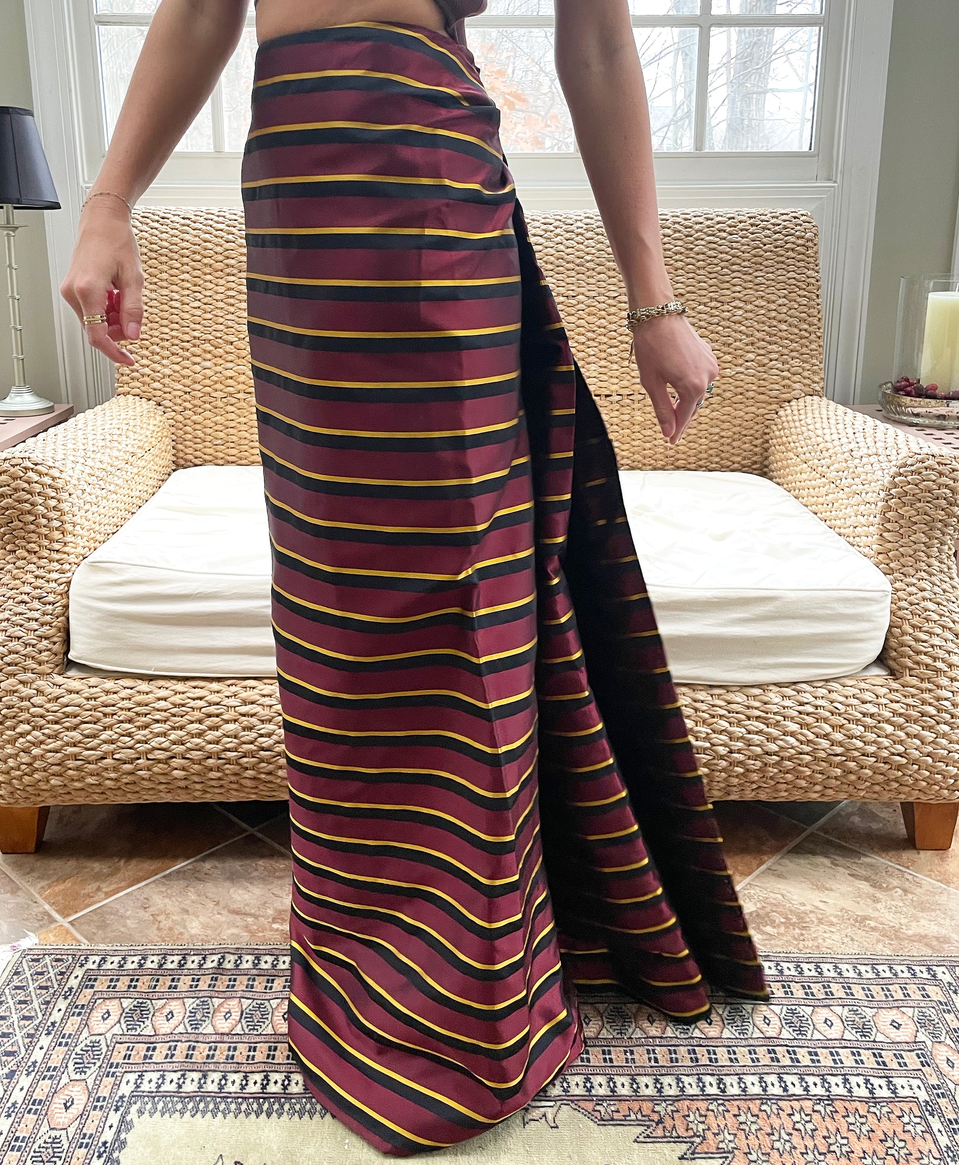 This vintage silk faille ball skirt is an amazing statement piece— I love it as an unexpected alternative to a gown for a formal or black tie event. Made by Michael Kors Collection circa early 2000s, this piece still has its original tags and was never worn, with an original retail of $1700. (On a side note, it's so sad to me that the Michael Kors brand has become so synonymous with a certain diluted, dowdy sensibility, because his main label collection has always so incredibly well made, and just the epitome of luxury.) If you look at the tailoring, you can see how well crafted this piece is, but once you put it on, it takes the experience to a whole new level. I love the use of menswear-inspired stripes, and the juxtaposition of this pattern with the ultra-feminine, Edwardian-inspired bustle. The skirt has a narrow column shape in the front, and an incredibly intricate bustle mechanism in the back, held in place by multiple snaps. There is a slight train in the back, but it's mostly volume rather than length. The construction here is seriously couture-level. Made in Italy of 100% silk.