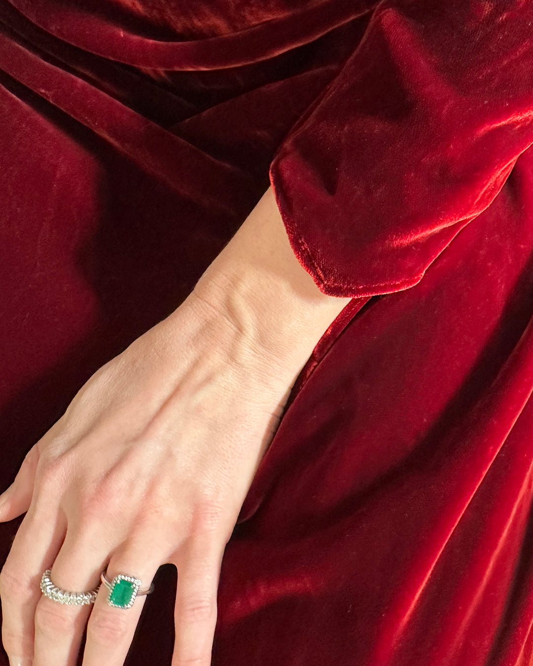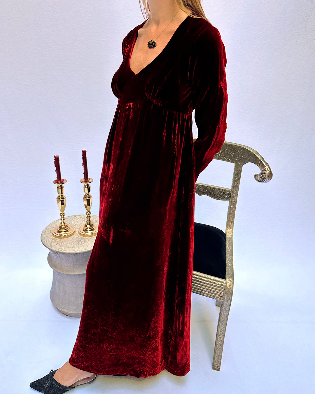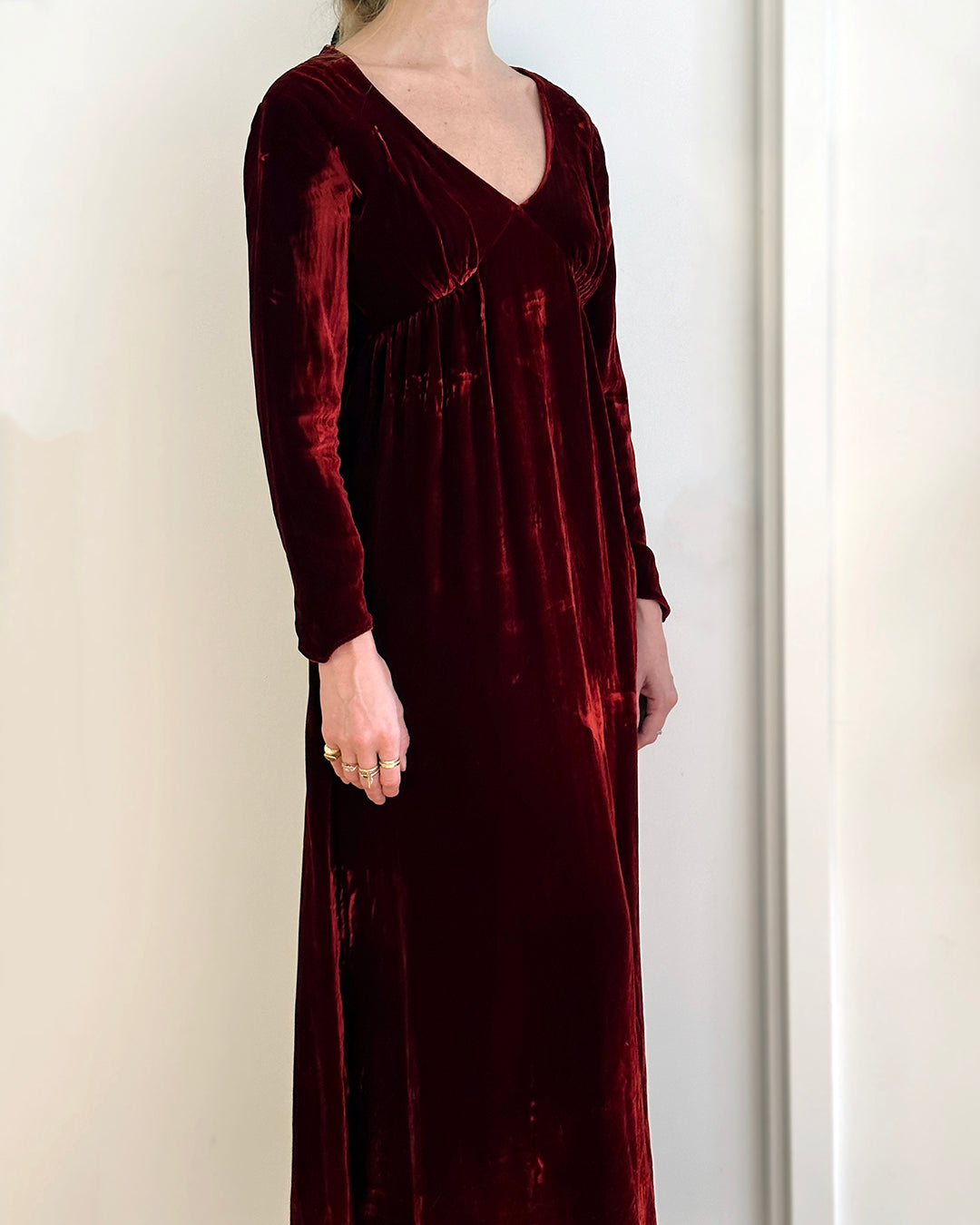This romantic vintage red velvet dress was custom-made in the late 1930s (possibly early 1940s), and is entirely one-of-a-kind. The maxi-length crushed red velvet is so rich. It features a gathered empire waist, with long tailored sleeves that come to a point at the cuff. It was reworked and modernized around the 1970s, with a zipper added in the back, making it easier to wear. Because of the empire waist, this can also be an incredible vintage maternity dress. Closes in the back with a zipper.
