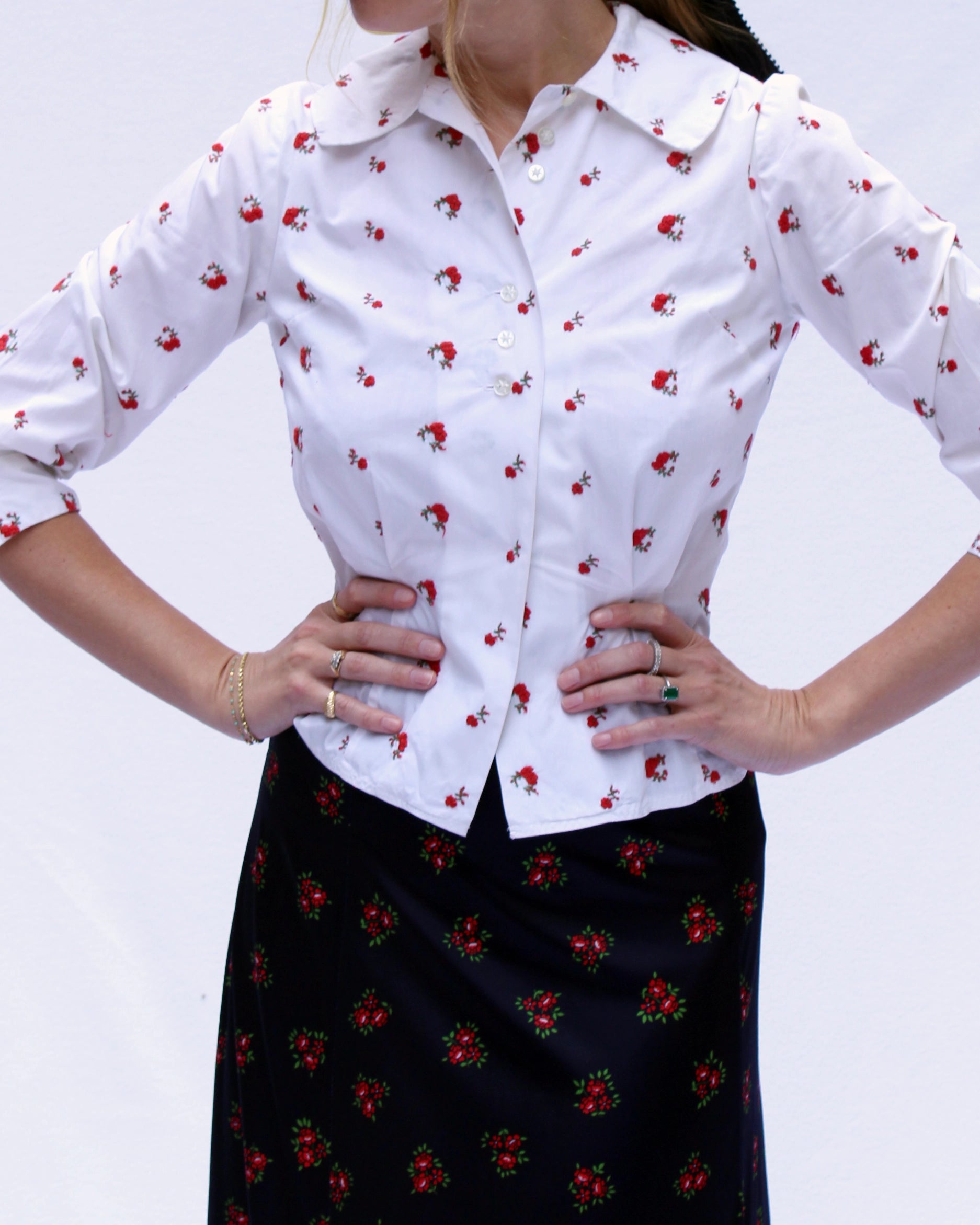 Incredible one-of-a-kind blouse made in the 1940s, with a beautifully tailored, fitted bodice. 3/4 sleeves with French cuffs, nipped waist, and hand-embroidered roses. Fits like a size X-Small. Additional images and measurements will be updated shortly.