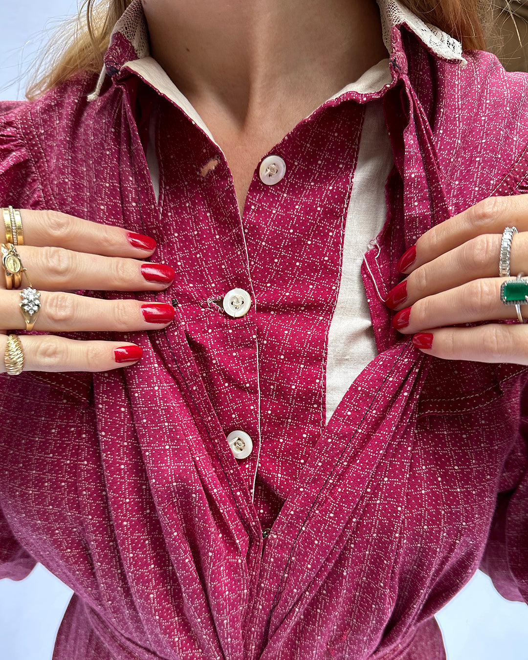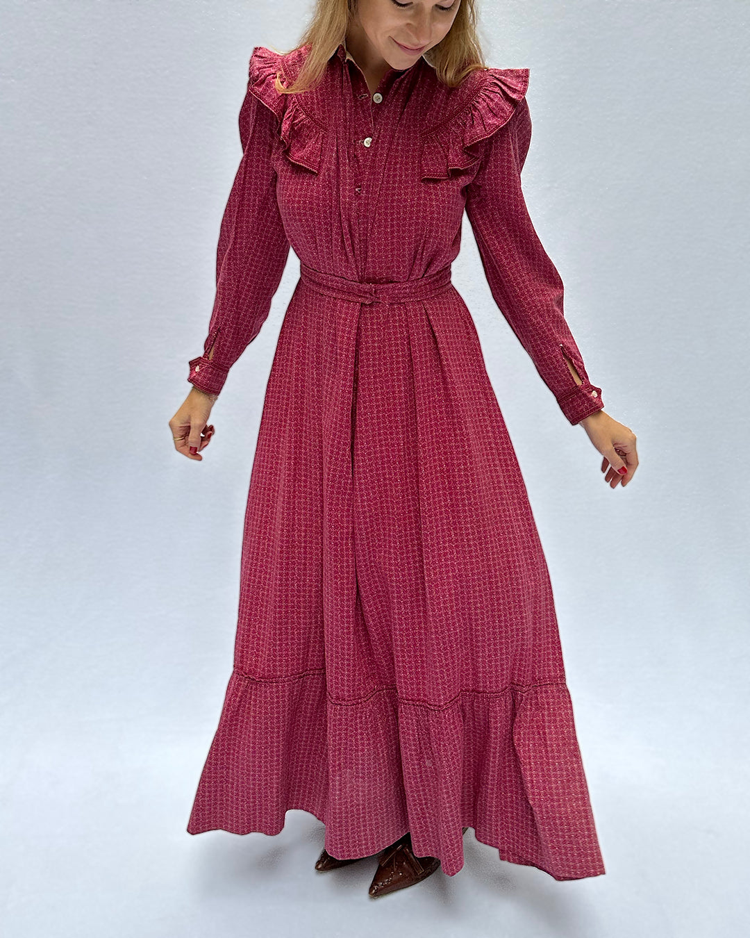I am so excited to share this incredibly rare Victorian calico dress; it's so difficult to find clothing from this era in a wearable condition, and this dress is just lovely. Circa 1880s, this is what was known as a "wrapper dress," or a casual dress that would have been worn around the home and in one's private quarters. Throughout the 1970s and 1980s, designers like Laura Ashley and Gunne Sax borrowed from these Victorian designs, but this is the original. The cotton calico is a lovely shade of cranberry red, with ivory details and an ecru lace collar. Although it looks simple, the construction is relatively elaborate by today's standards. The bodice features an attached dickie, with the outer layer hooking closed under the under-layer, which buttons up, or could be worn more undone (see images). And the ruffles at the shoulders are just everything! The belt is attached in the back, and can be fastened with the hook closure, or simply tied. A NOTE: it is very rare to find these dresses at all, let alone with a belt in tact, so this dress is very special in a number of ways!