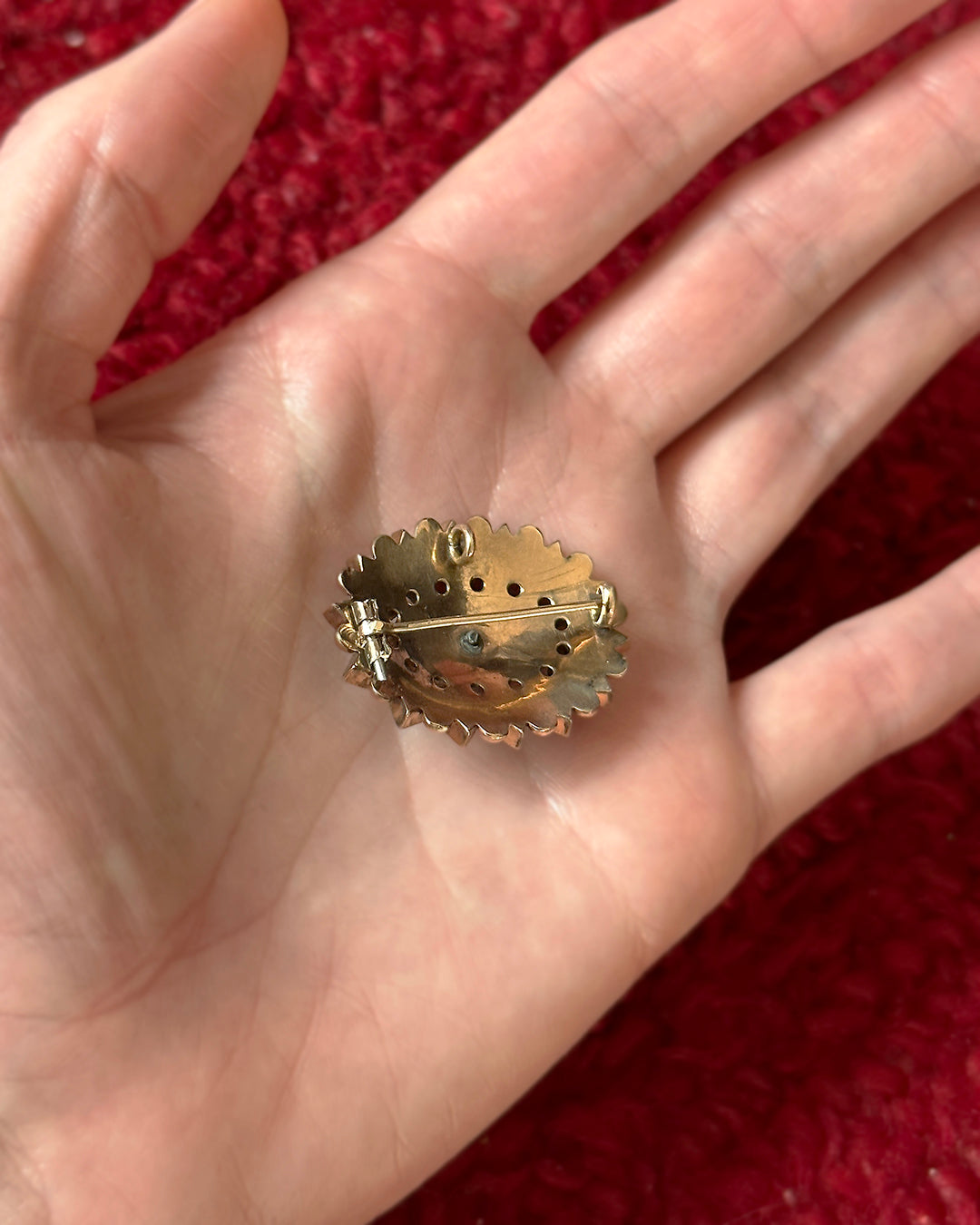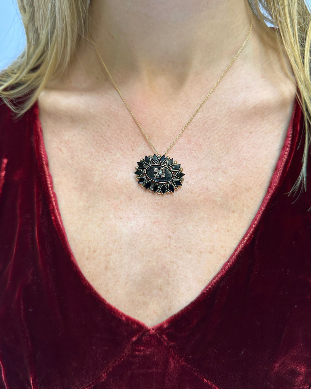 This rare antique Victorian pendant (or brooch) features an unusual starburst motif. Although stars are common through Victorian jewelry, more often they were emblazoned in a locket or otherwise circular piece; it's much less common to find the piece of jewelry itself in a starburst shape, as is seen here. The black onyx denotes that this is mourning jewelry, meant to commemorate the loss of a loved one. While she famously grieved her husband Prince Albert's death in 1861 for the forty years that followed, Queen Victoria popularized black jewelry and mourning elements of all sorts. In this piece, circa 1880, the seed pearl set in the center symbolized the tears shed by those left behind. The metal is solid 10k gold. It is finished in the back with a hidden pin as well as a hidden bale, so it can easily be worn as a brooch or pendant. I must point out: often in this antique pieces that can be worn interchangeable as a pin or pendant, the pin closure on the back extends outward so far that it's visible from the front of the piece, which especially disrupts the look of the piece when worn on a chain as a necklace; this is NOT the case here and that makes it all the more special to me! It's so incredibly well-crafted. The pendant is available on its own, or possible to add on a chain if you need one. Measures 3 cm x just over 2 cm. The Vintage 1970s Red Velvet Dress pictured is also available.