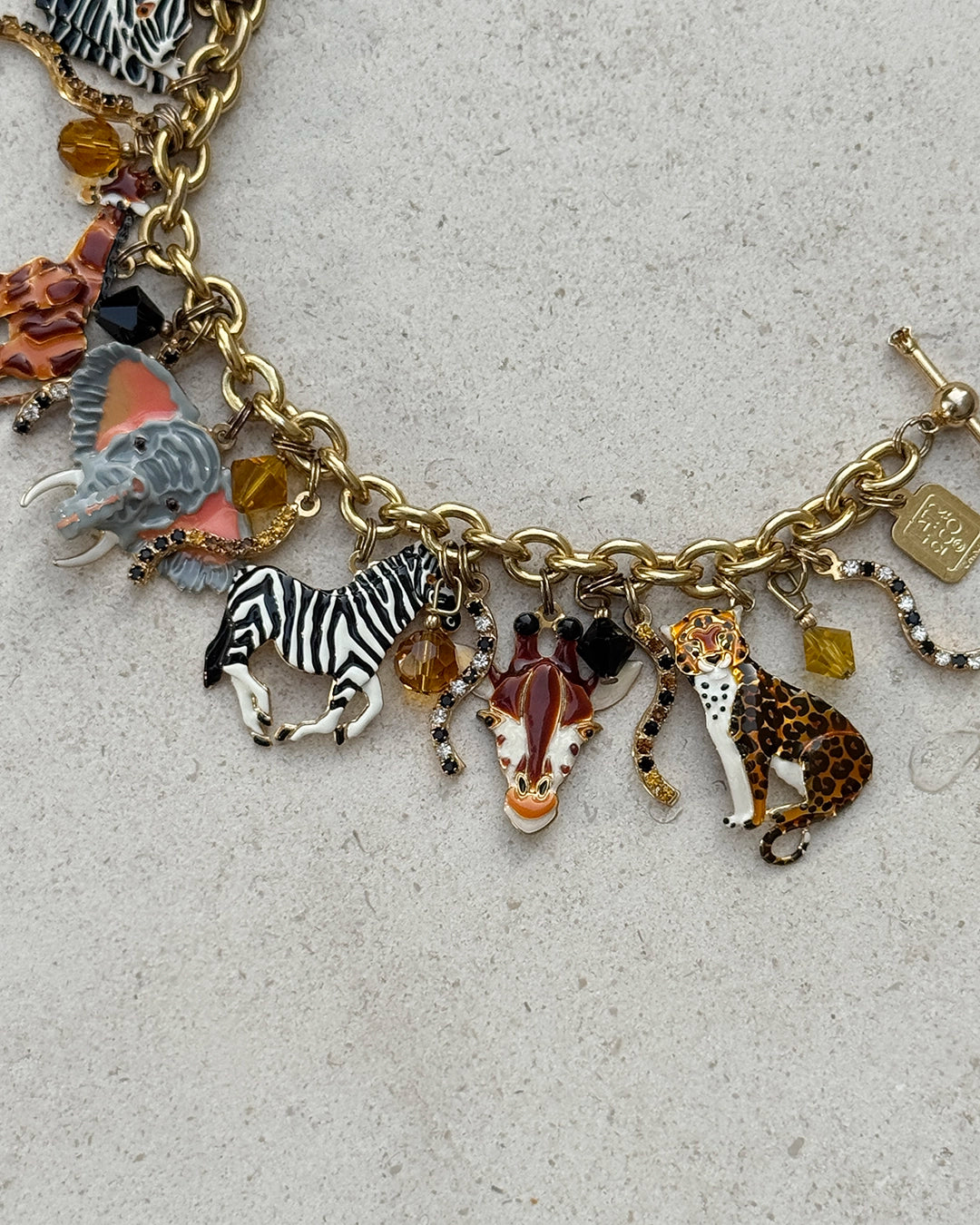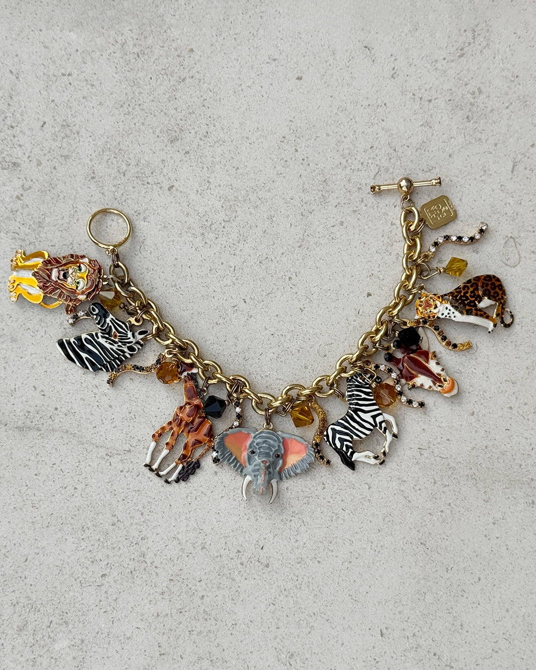 This whimsical vintage gold charm bracelet features various safari animals, plated with 22-karat gold and complete with Austrian crystals and hand-enameled details. In full intricate color, it features a lion, zebra, cheetah, two different giraffes, elephant. Additionally, dangling crystals and interspersed throughout, and I love that the snake is represented by abstract squiggle charms, set with Austrian crystals in a gradated palette. It was made by Lunch at the Ritz, a jewelry brand founded in 1982, knows for its whimsical designs. It is finished with a crystal-set T-bar clasp, and measures just shy og 8" long. Signed "LATR" for the brand.