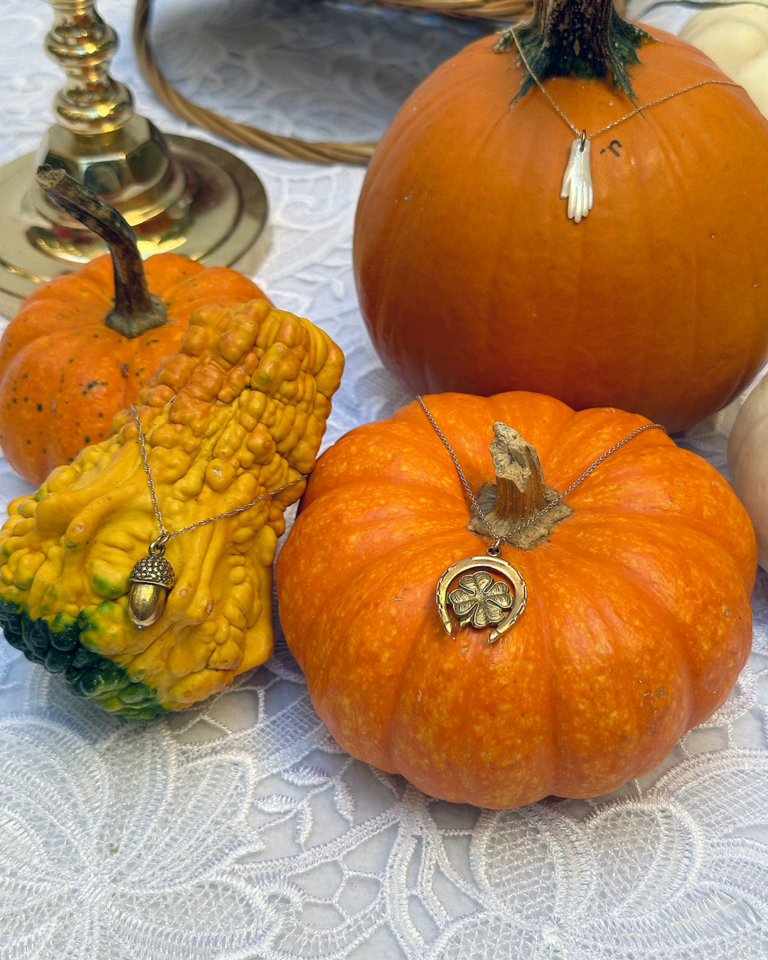 The Antique Acorn Pendant and Antique Victorian Horseshoe Pendant pictured are also available.