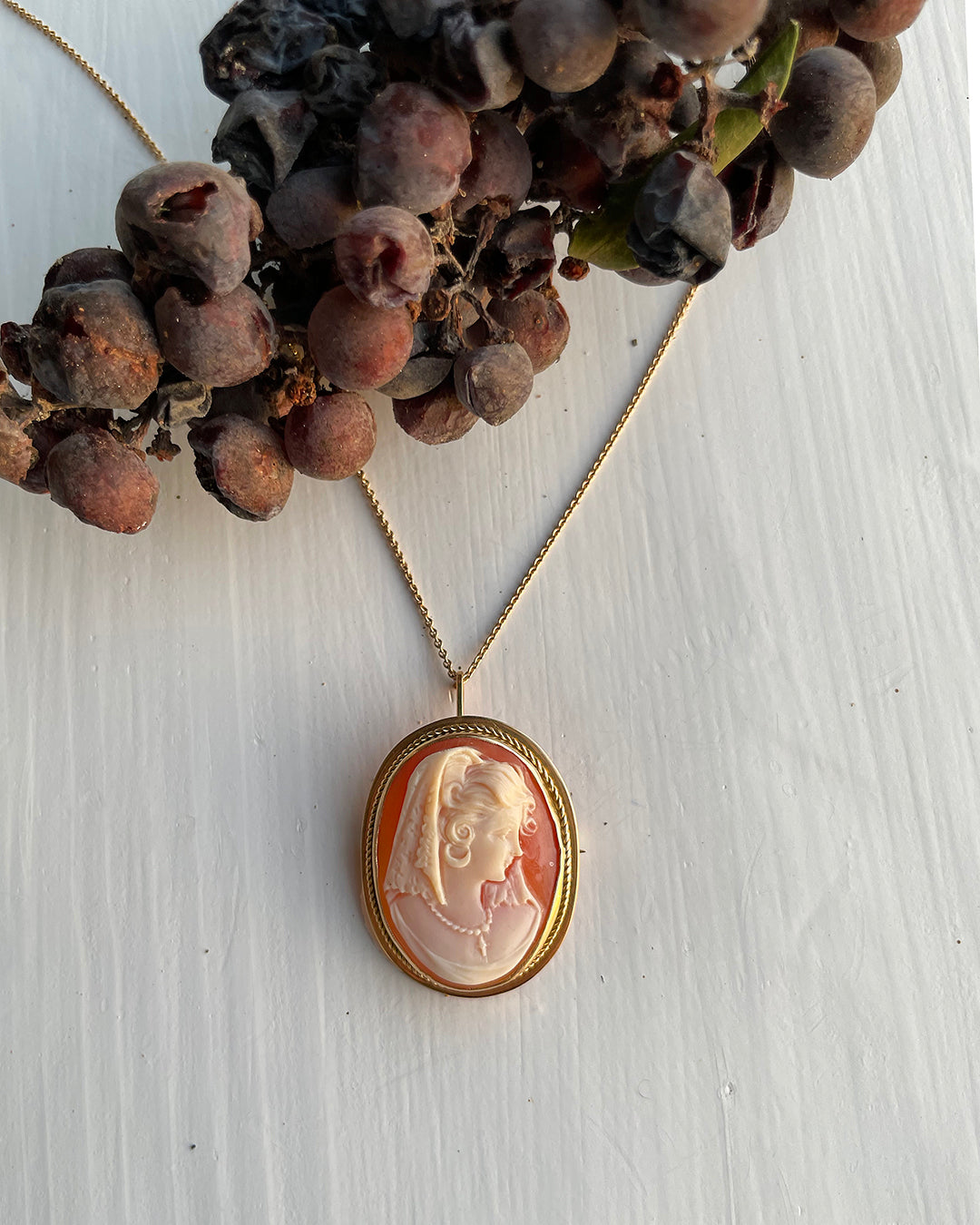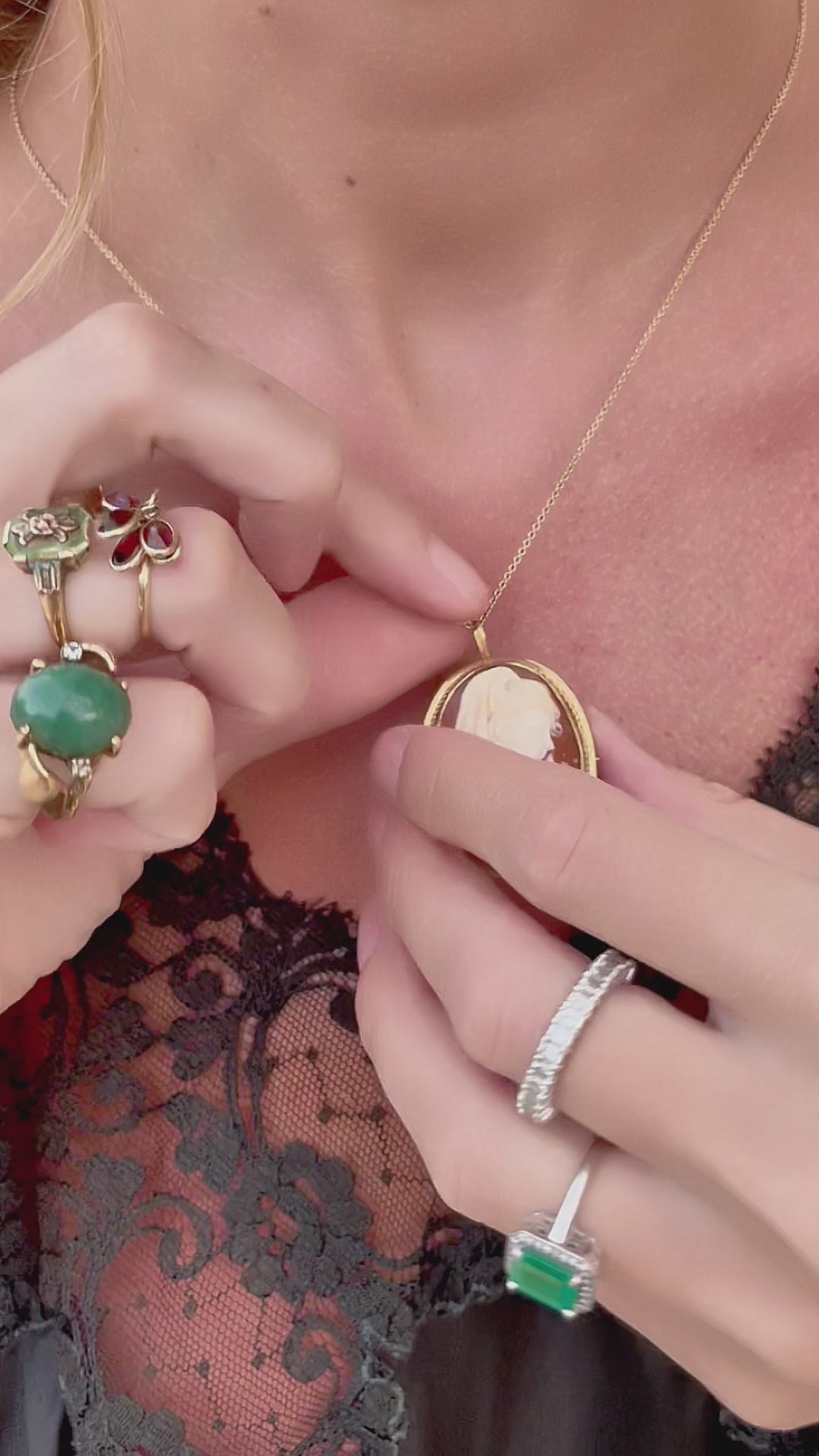 There is something so magical to me about vintage and antique cameos: the way the portraits are rendered in such incredible detail seems to tell a person's mystery. This cameo is carved from genuine shell with such impressive precision, and it's set in solid 18k gold. It is both a pendant, and a brooch; the pin back is not visible when it's worn as a pendant, and I love the way the bail dangles down and disappears when it's worn as brooch, making it truly two pieces in one. It was likely made in the 1930s, but it's also possible that the cameo itself was made even earlier, and the brooch fastener was later added around the 1930s or 1940s. This cameo depicts a Spanish woman, wearing a mantilla comb and veil, cross necklace, and hoop earrings. My favorite detail is how the curls at her hairline are emphasized. Cameos are truly timeless, and this is an heirloom piece you will have in your collection forever. Measures 32 mm long x 25 mm wide, with a bail 6.5mm long, which will accomodate pretty much any chain you have. Hallmarked 750 for 18k gold purity. Note that the chain is not included, but you have the option to add on a chain (pictured here). The Vintage Jade Pinky Ring, Vintage Black Lace Slip, and Vintage Silk Scarf pictured are also available.