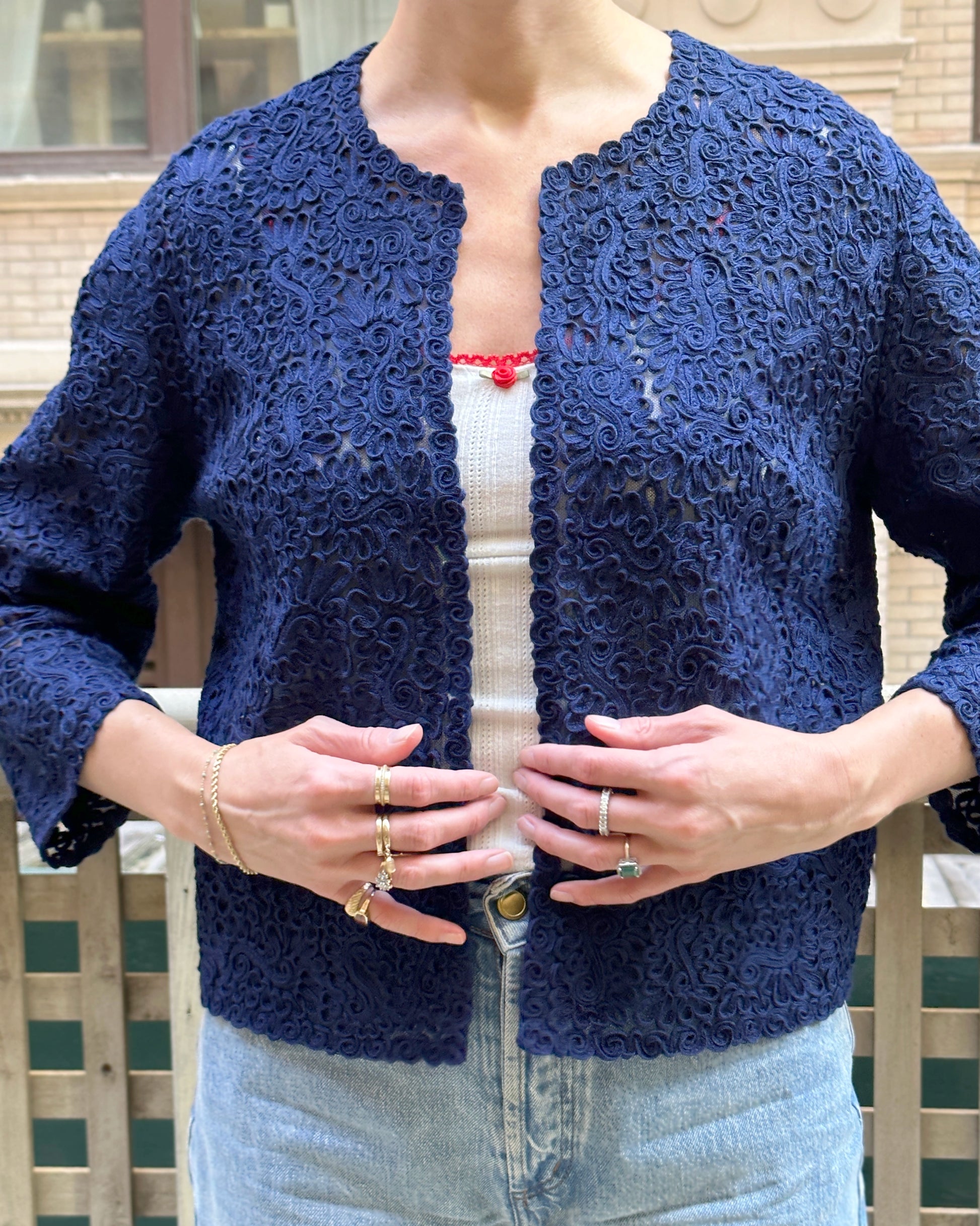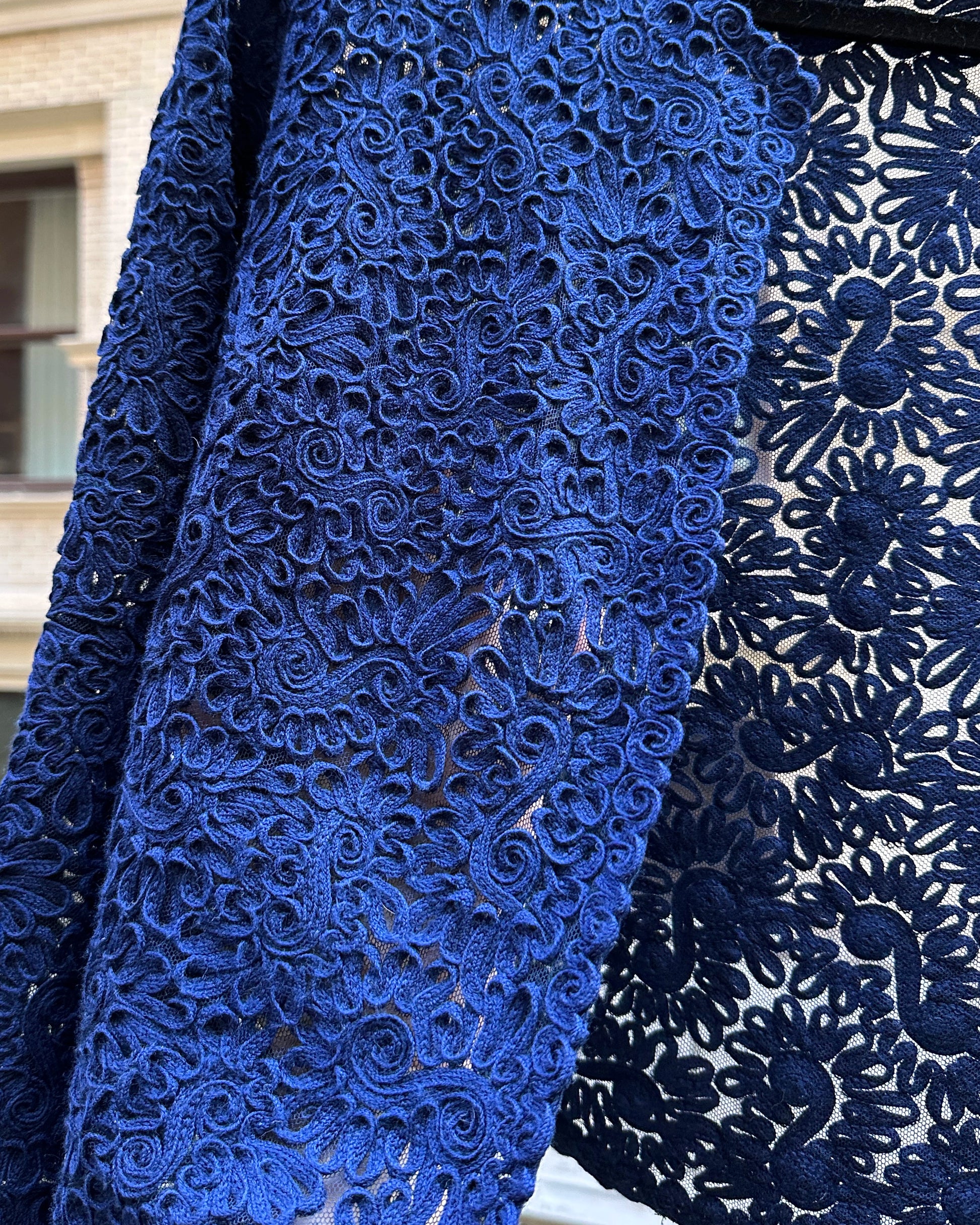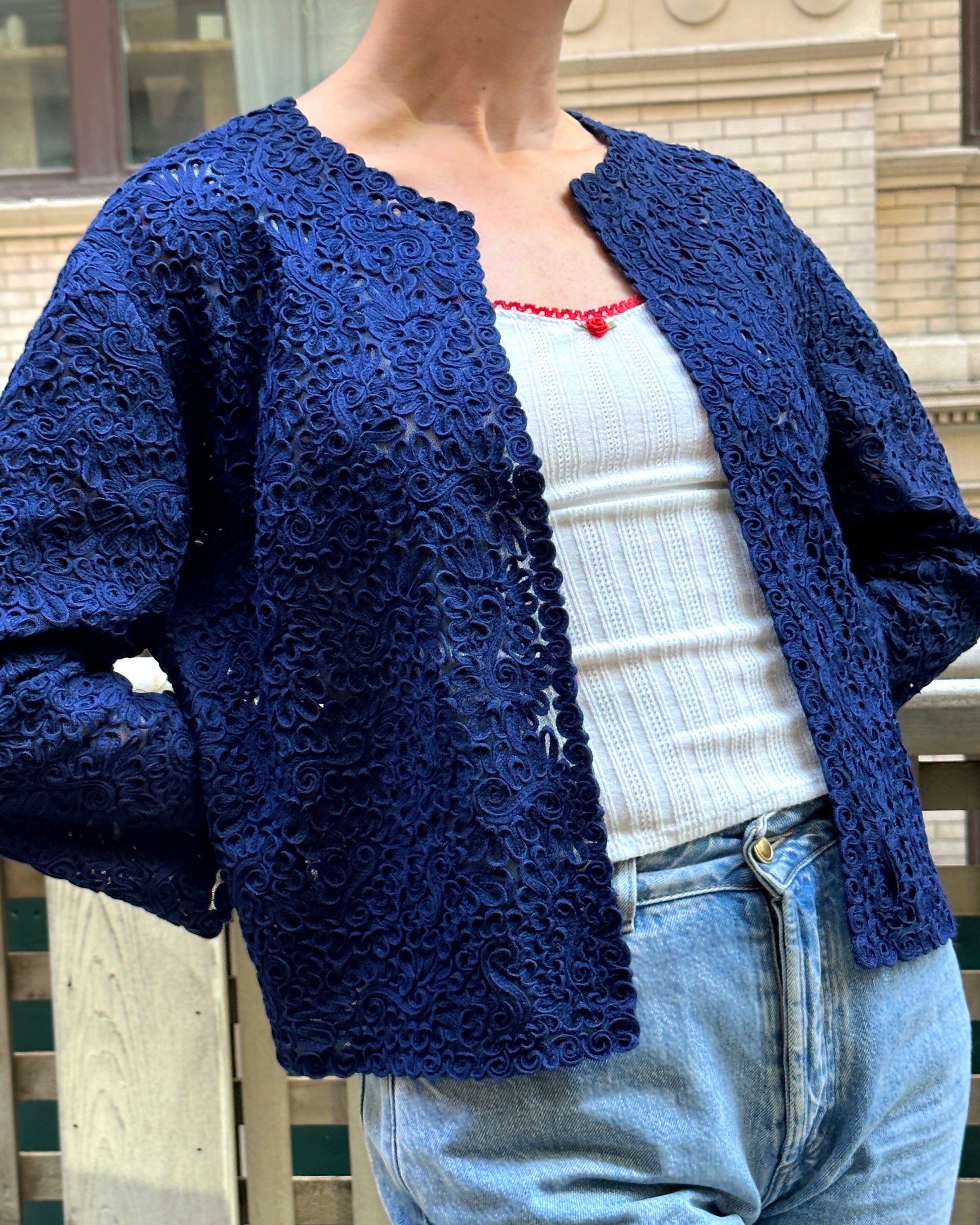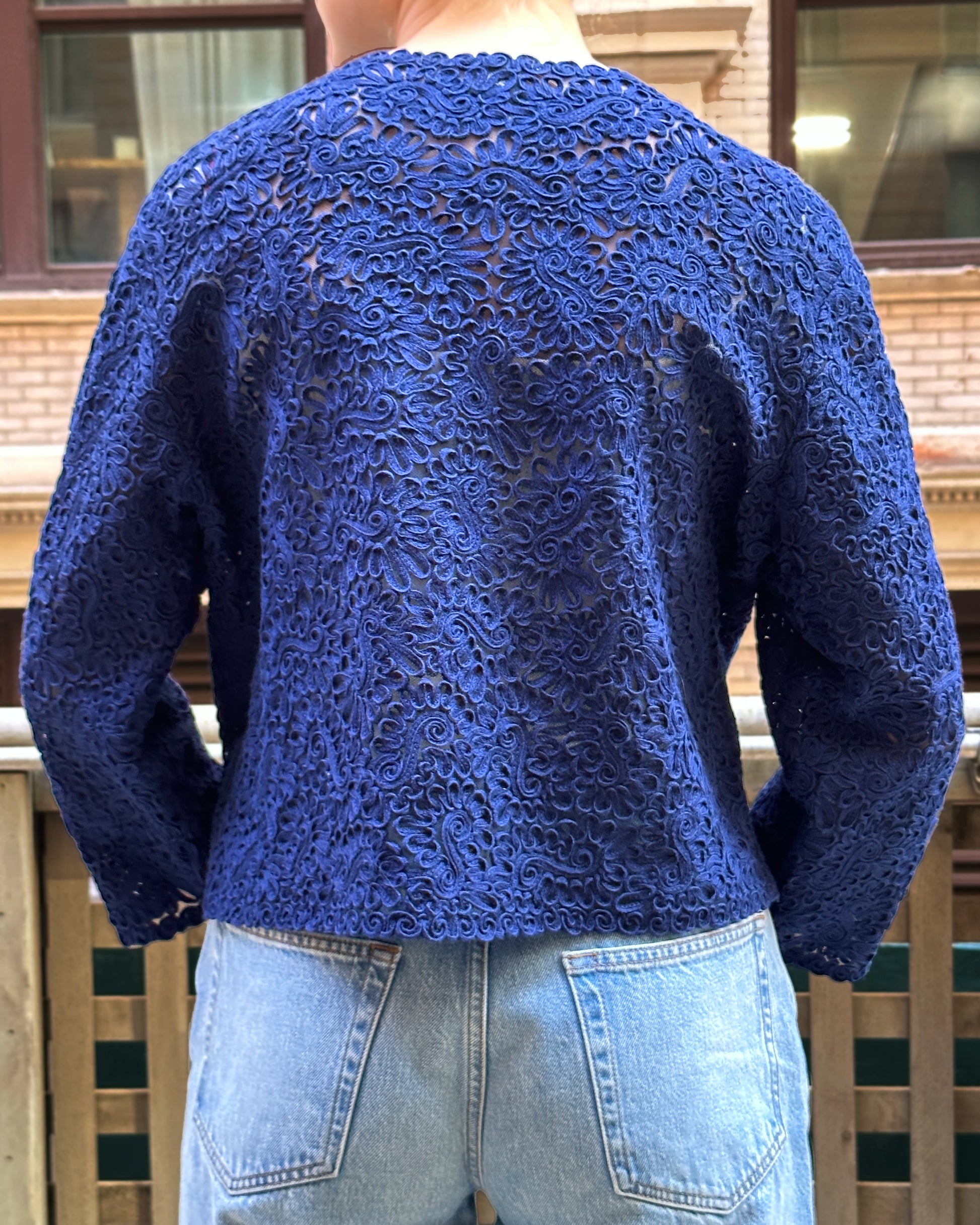 This beautifully unique vintage cardigan was made in Austria in the late 1930s/early 1940s. It features a gorgeous allover cotton soutache embroidery on a woolen mesh, in a deep indigo blue. It has a slightly oversized shape but darts at the chest make it flattering, providing some shape, along with the balance of the sloped shoulders and bracelet-length sleeves. There are no closures, as it is meant to be worn open, but it would be easy to add some hooks if desired.