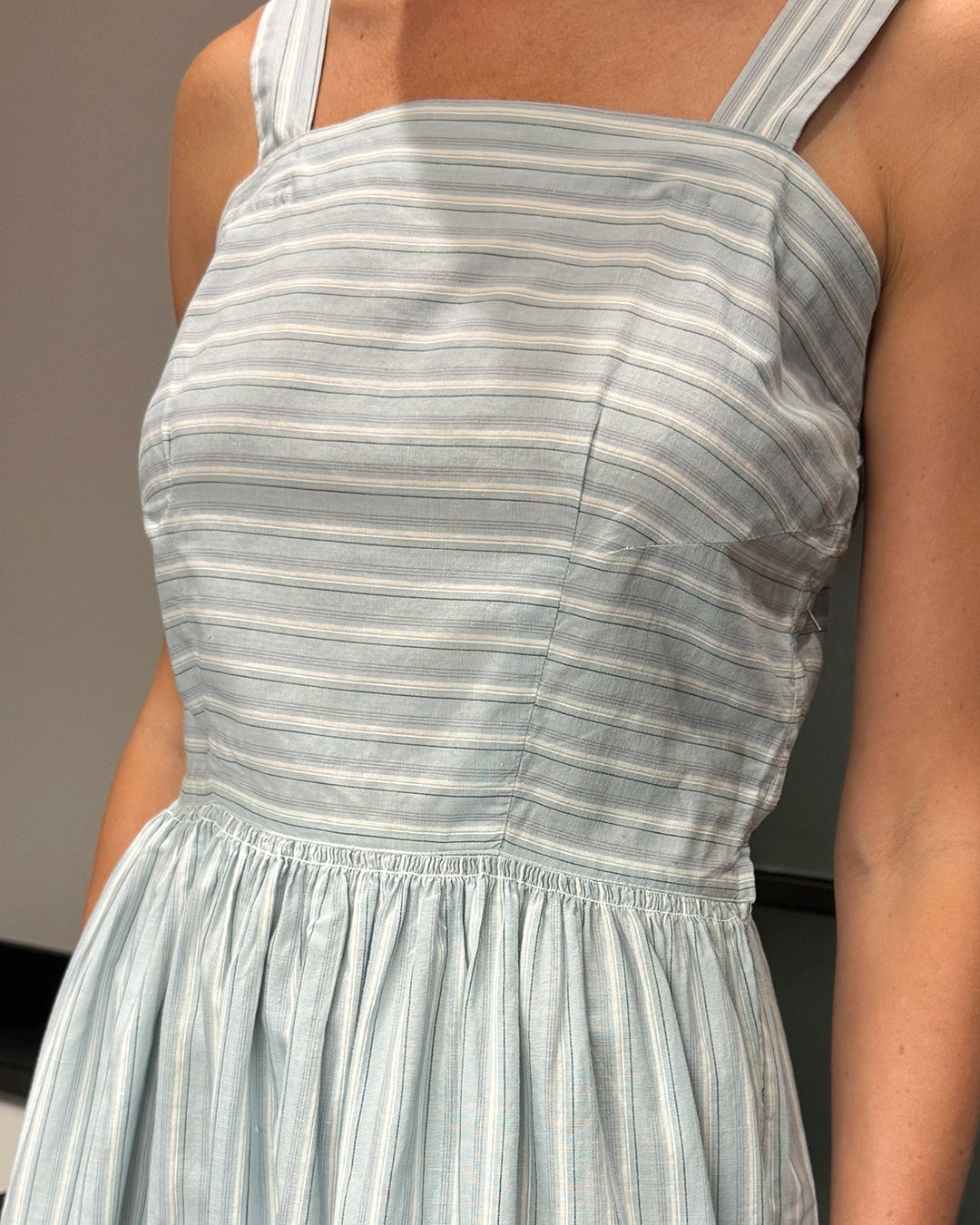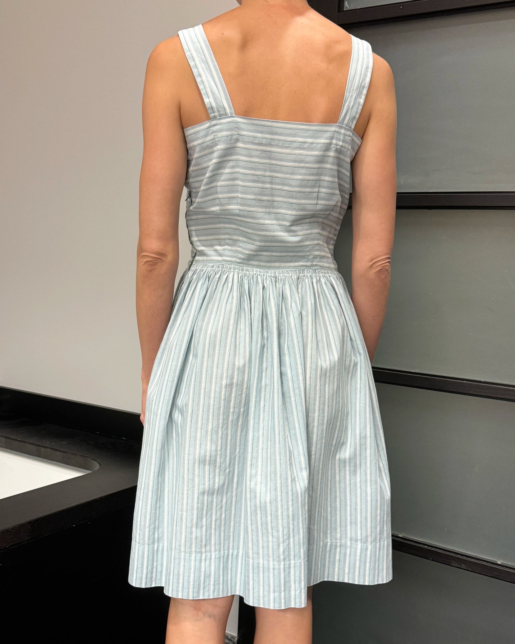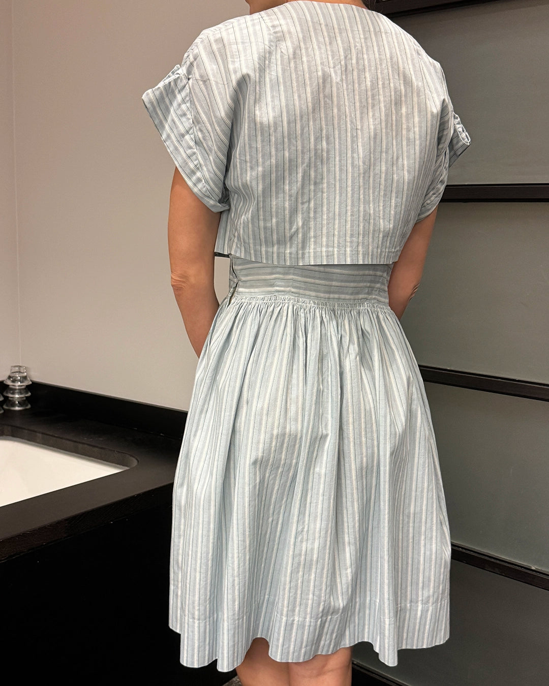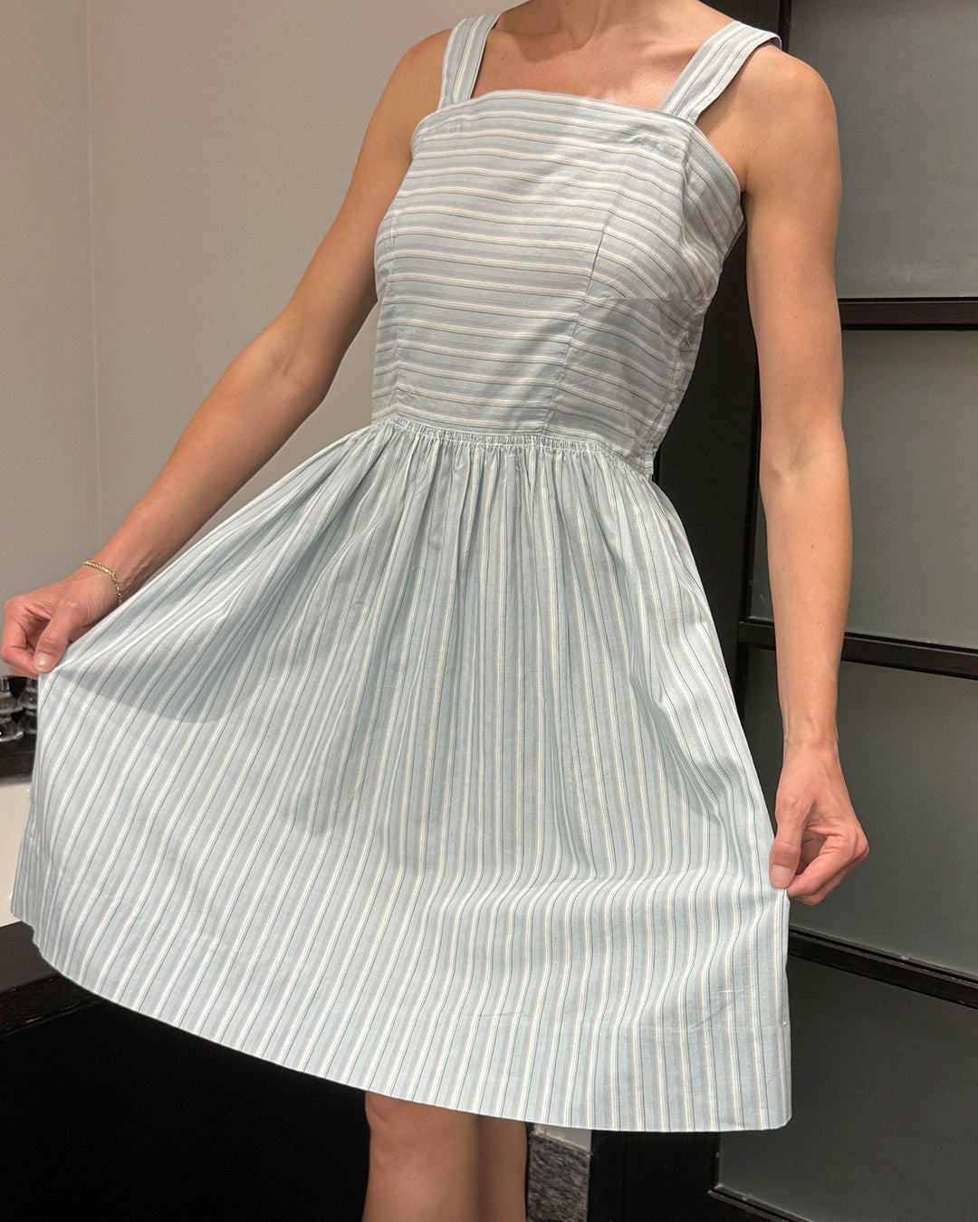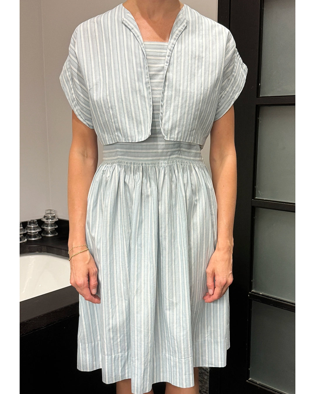This vintage 1940s cotton striped sundress comes with a matching bolero, and is the perfect ultra-wearable everyday dress. It's such a breezy look, crafted in a lightweight cotton that's perfect for hot weather, unlined for maximum comfort and breathability. The blue stripes are reminiscent of the type you would find on mens boxer shorts or Oxford shirts. The dress has square-neck bodice, fitted at the waist with beautifully artful gathering at the waistband giving way to a full skirt. The little bolero is the perfect shape, with dolman sleeves and no closure. Thoughtfully made, the cuffs and the corners of the collar are tacked in place. Each piece can be worn separately, giving you numerous looks with one set. The dress closes with a side zipper, and the bolero has no closure.