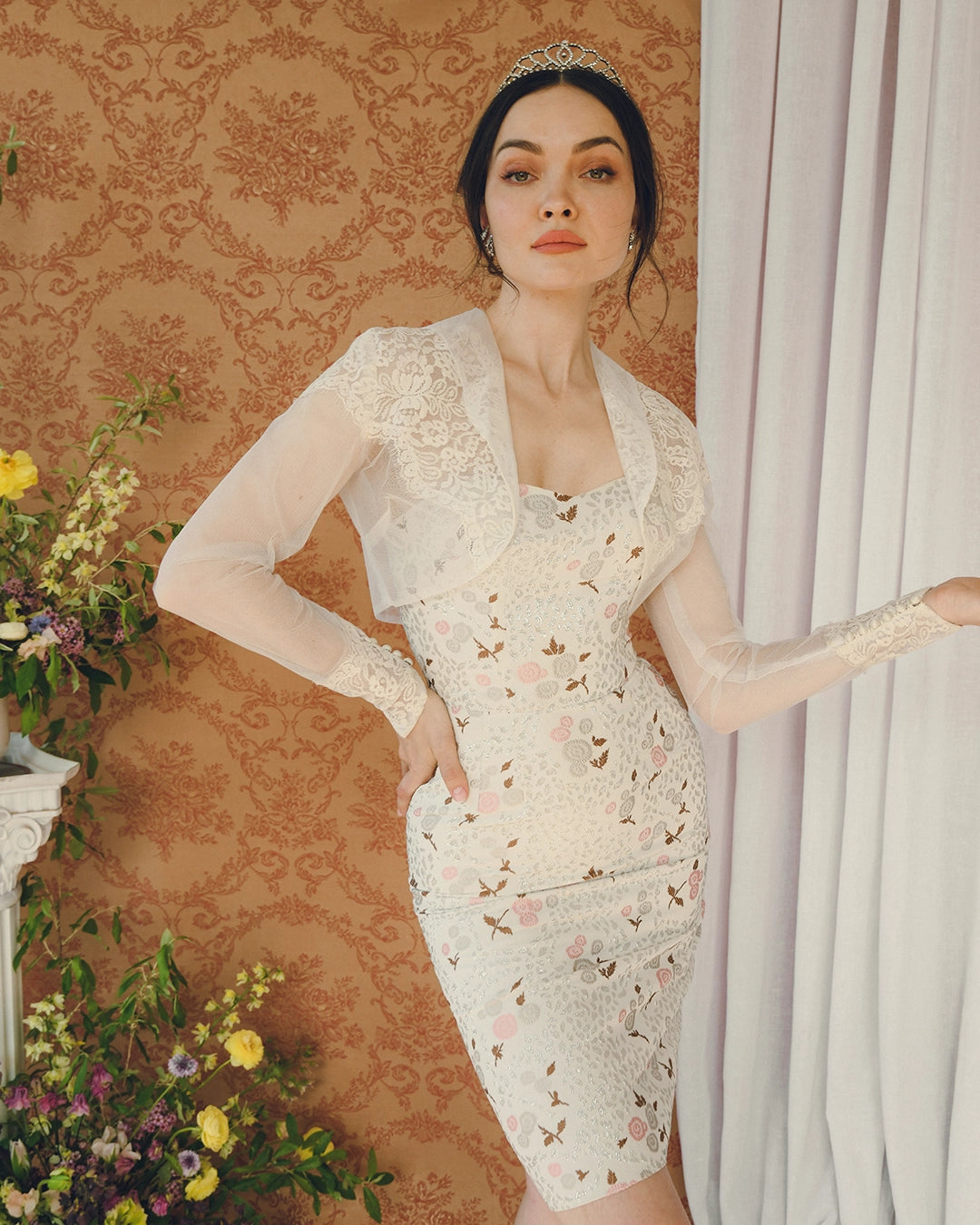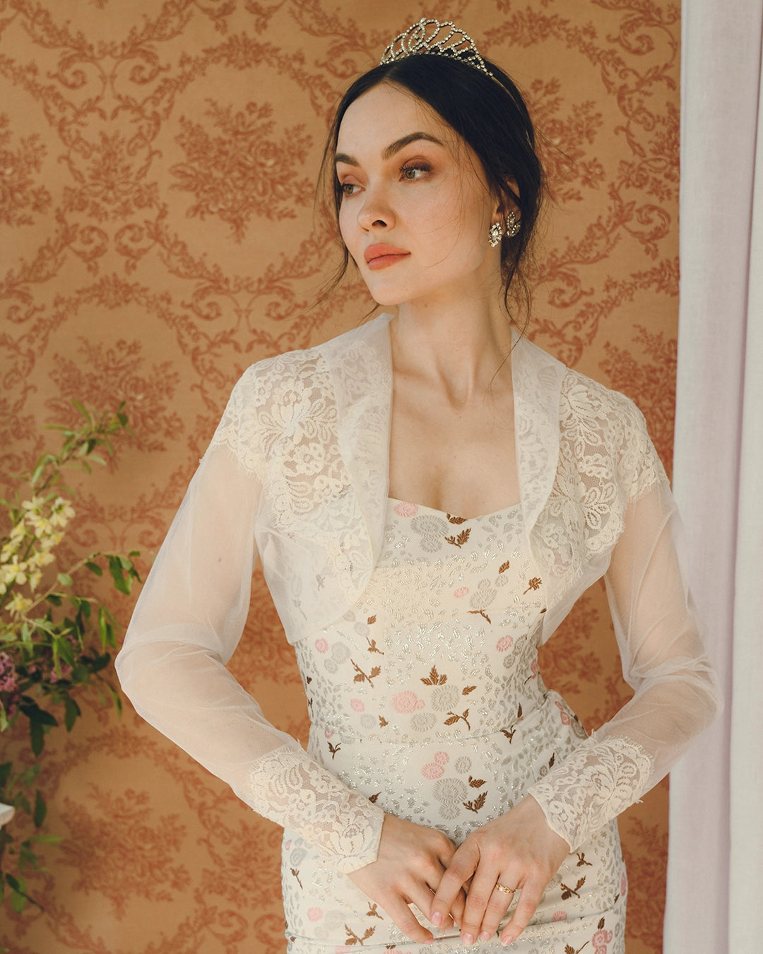 This vintage ivory lace and tulle bolero was made in the 1940s and is one-of-a-kind. It's so versatile, and it's ivory lace fabrication makes it the perfect topper for a vintage bridal look— Something Old! But also, something that will be worn for years to come. Handmade with two layers of mesh and beautiful lace appliqué, I love the lace's eyelash trim, and the shape of the collar. There is no closure down the front, and it fits like more of a "sleeve." The shape has a very Edwardian-inspired feeling. The sleeves really taper towards the cuff, with custom fabric-covered buttons at the pointed cuffs.