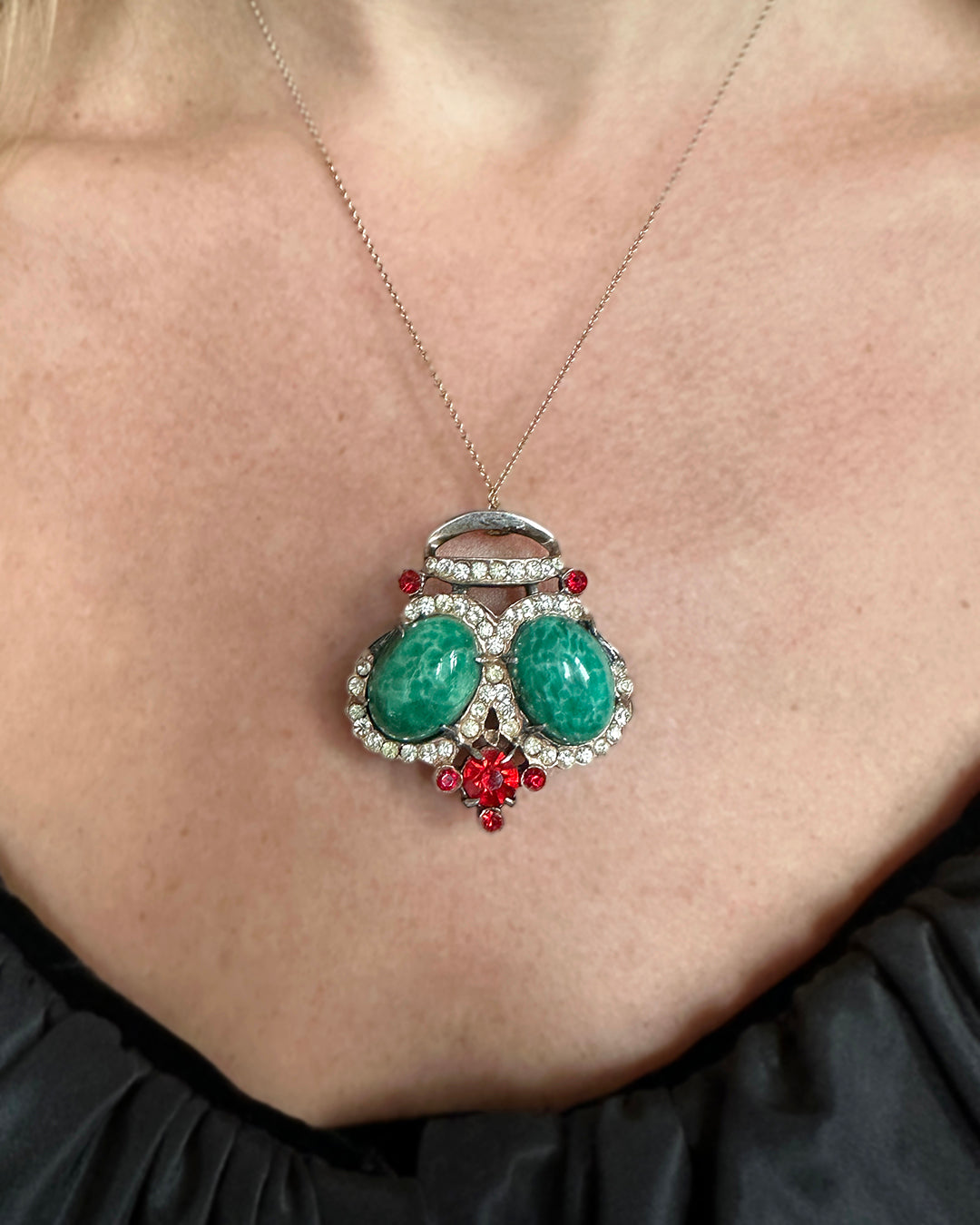 For all the Queens: this crown feature lush glass jade stones, surrounded by red and colorless glass accent stones, set in sterling silver. It was made by Trifari in the late 1940s/early 1950s, one of the most prolific US designers of costume jewelry. What sets Trifari apart from other costume jewelry is the quality, bringing a level of craftsmanship to costume jewelry that is usually reserved for fine jewelry. These techniques can be attributed to Alfred Philippe, Trifari's designer from 1930-1968, who was already famous for developing an invisible stone setting for Van Cleef & Arpels. Note that this piece is not signed, but this design was patented by Trifari in 1948 (US DES. PAT. NO. 137542). Signed STERLING to indicate the metal is pure Sterling Silver. In the back, it has both a pin to be worn as a brooch, and a bale to be worn on a chain as a pendant. A chain can be added on if you would like. Measures 1 5/8" x 1.5".