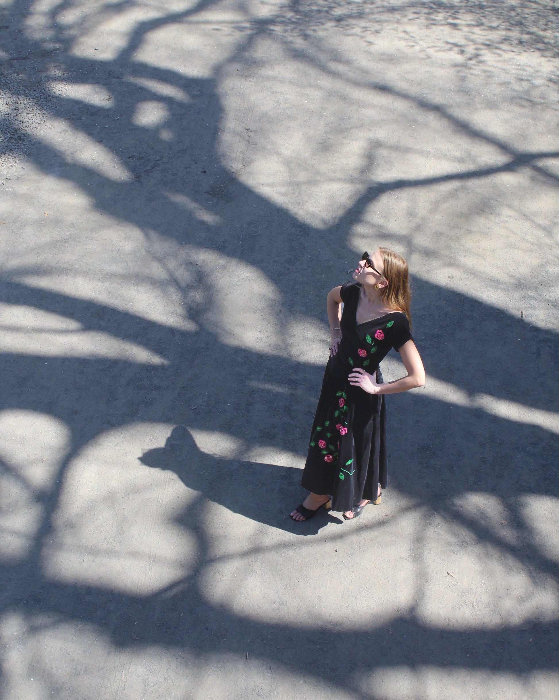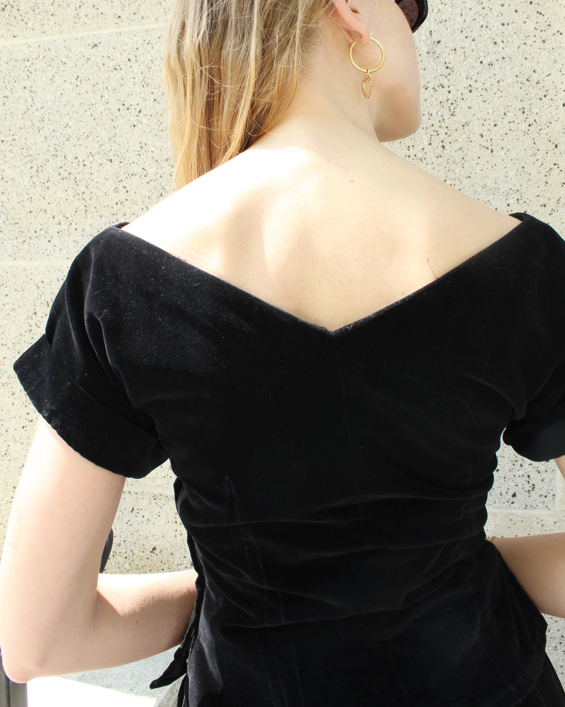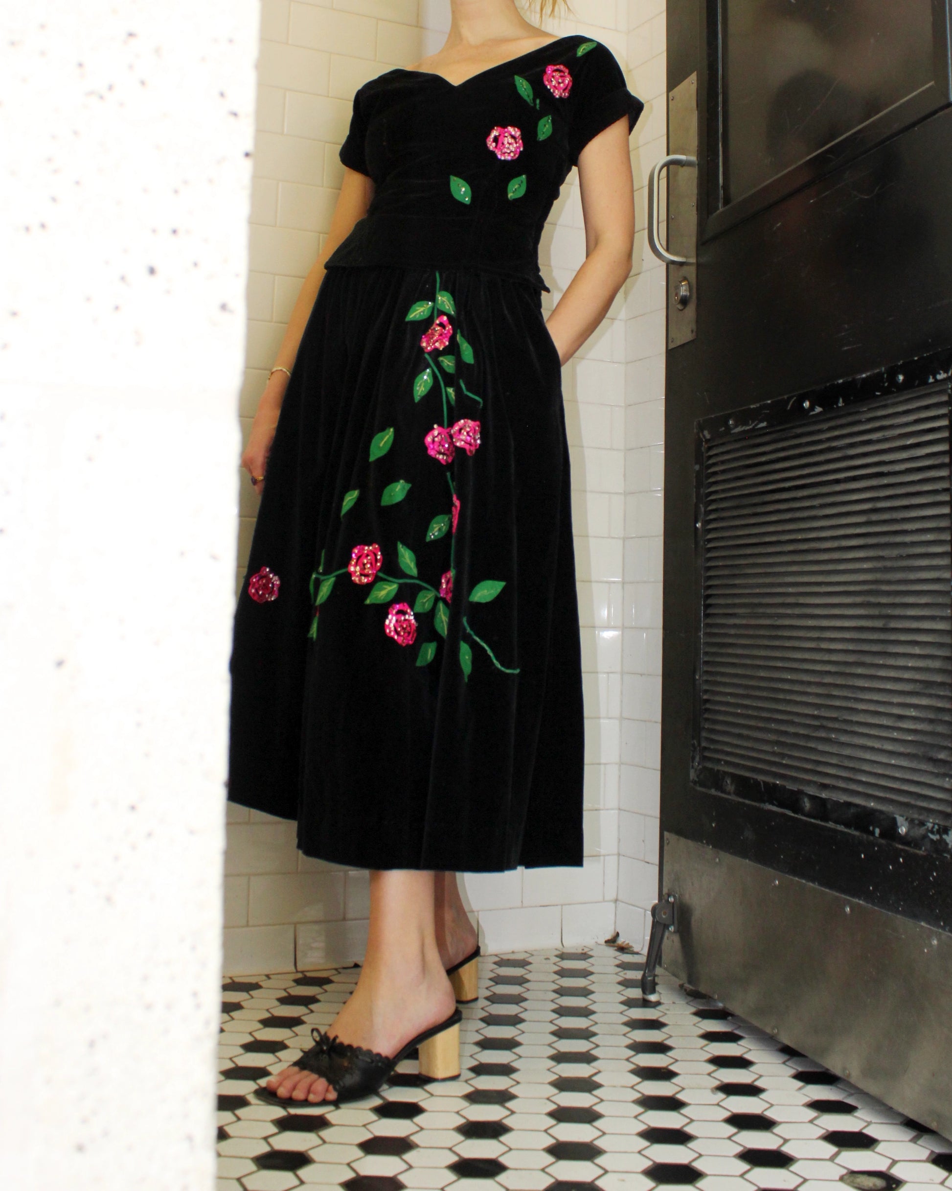 A nod to the silhouette of Christian Dior's New Look, this incredible velvet skirt set was made in 1947. It was made by designer Lorraine Budny for the brand Sportwhirl, which was founded in 1945 as a "separates house," specializing in pieces a woman could wear both separately and as a set— quite a novelty at the time, as store-bought dresses at all were not all that readily available. It's made of black velvet with felt rose appliqué and beaded embroidery— it actually presents like a dress, but is really two pieces, and each could absolutely be mixed and worn separately (as was the original design concept). The look is so romantic and reminds me of Old Hollywood film stars (with a dash of Snow White). The Vintage 14k Gold Spinel Heart Hoop Earrings pictured are also available.