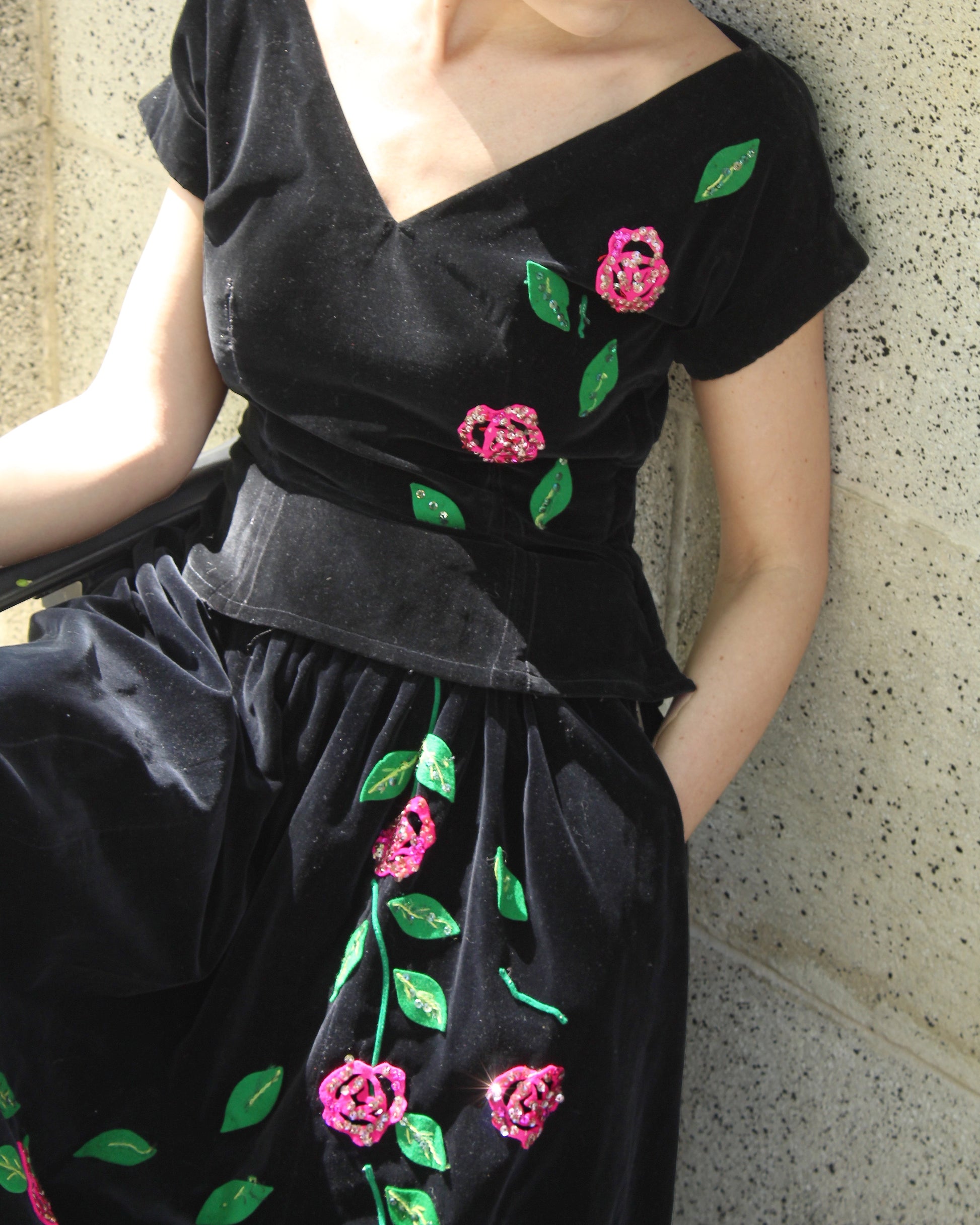 Vintage 1940s Velvet Two-Piece Dress With Rose Appliqué