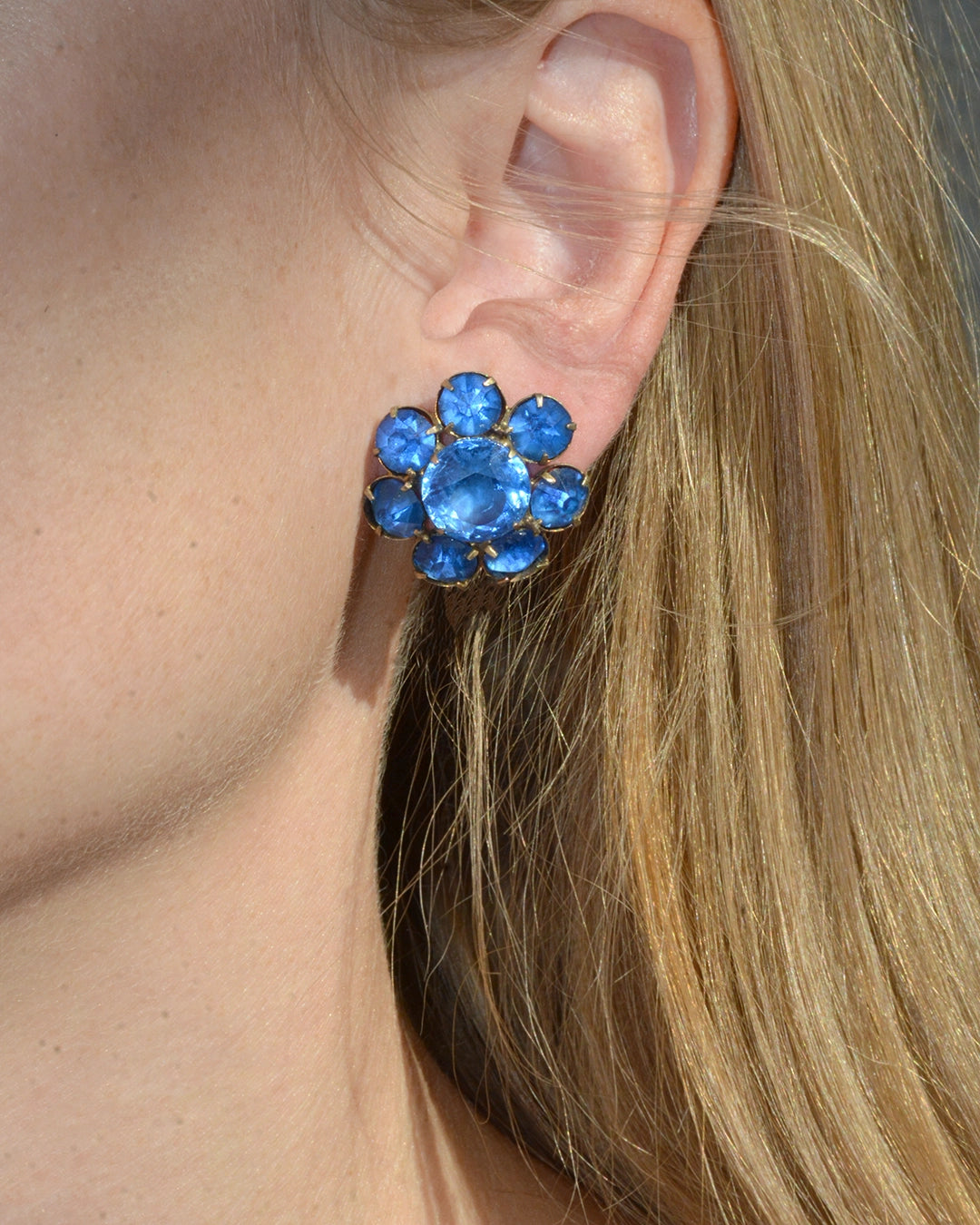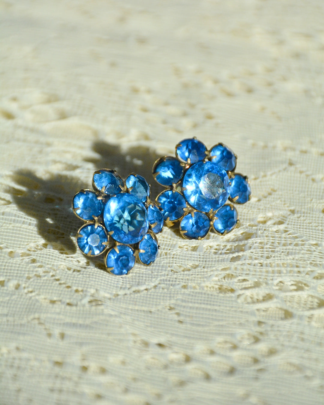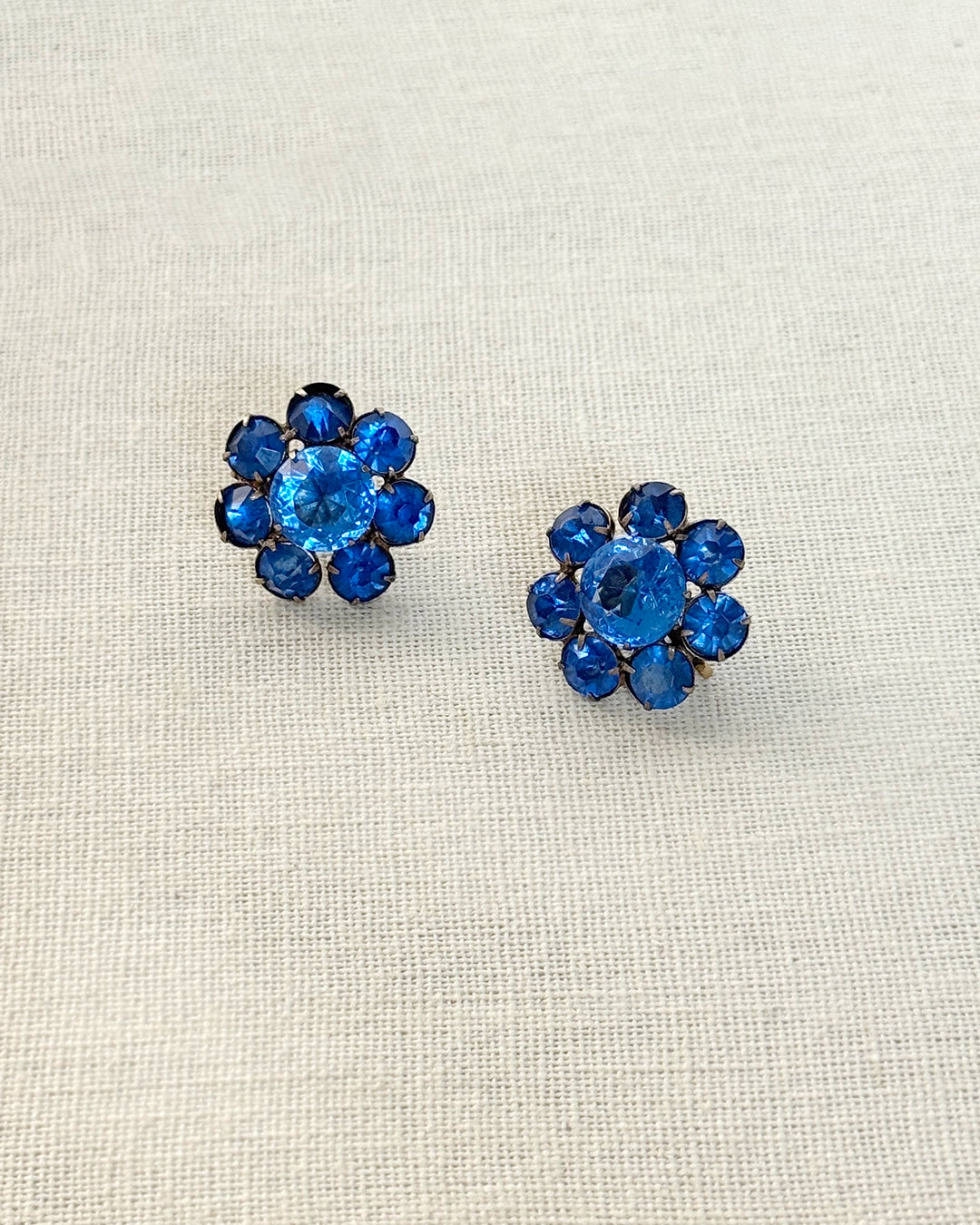 Vintage 1950s Blue Crystal Flower Cluster Stud Earrings
